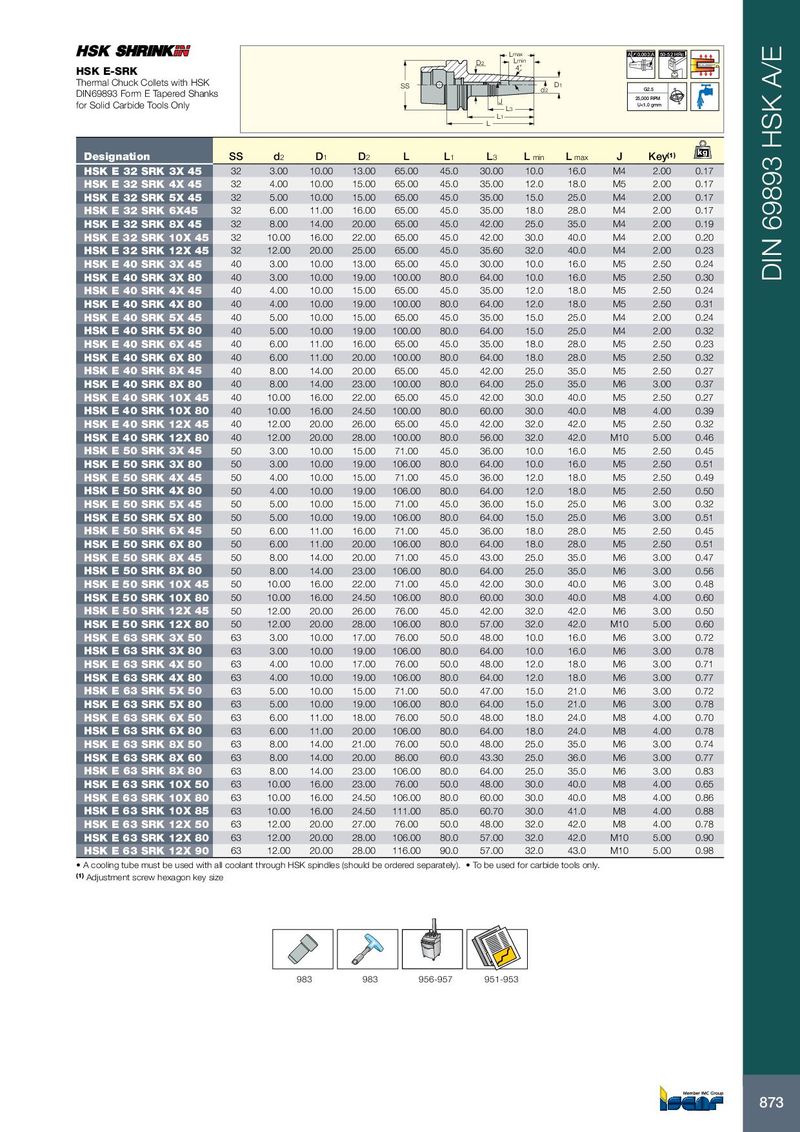 L max A 0.003 A 50-52 HRc D 2 L min 4˚ HSK E-SRK Thermal Chuck Collets with HSK SS D 1 d 2 G2.5 DIN69893 Form E Tapered Shanks J 25,000 RPM for Solid Carbide Tools Only U<1.0 gmm L 3 L 1 L Designation SS d 2 D 1 D 2 L L 1 L 3 L min L max J Key (1) kg HSK E 32 SRK 3X 45 32 3.00 10.00 13.00 65.00 45.0 30.00 10.0 16.0 M4 2.00 0.17 HSK E 32 SRK 4X 45 32 4.00 10.00 15.00 65.00 45.0 35.00 12.0 18.0 M5 2.00 0.17 HSK E 32 SRK 5X 45 32 5.00 10.00 15.00 65.00 45.0 35.00 15.0 25.0 M4 2.00 0.17 HSK E 32 SRK 6X45 32 6.00 11.00 16.00 65.00 45.0 35.00 18.0 28.0 M4 2.00 0.17 HSK E 32 SRK 8X 45 32 8.00 14.00 20.00 65.00 45.0 42.00 25.0 35.0 M4 2.00 0.19 HSK E 32 SRK 10X 45 32 10.00 16.00 22.00 65.00 45.0 42.00 30.0 40.0 M4 2.00 0.20 HSK E 32 SRK 12X 45 32 12.00 20.00 25.00 65.00 45.0 35.60 32.0 40.0 M4 2.00 0.23 HSK E 40 SRK 3X 45 40 3.00 10.00 13.00 65.00 45.0 30.00 10.0 16.0 M5 2.50 0.24 HSK E 40 SRK 3X 80 40 3.00 10.00 19.00 100.00 80.0 64.00 10.0 16.0 M5 2.50 0.30 DIN 69893 HSK A/E HSK E 40 SRK 4X 45 40 4.00 10.00 15.00 65.00 45.0 35.00 12.0 18.0 M5 2.50 0.24 HSK E 40 SRK 4X 80 40 4.00 10.00 19.00 100.00 80.0 64.00 12.0 18.0 M5 2.50 0.31 HSK E 40 SRK 5X 45 40 5.00 10.00 15.00 65.00 45.0 35.00 15.0 25.0 M4 2.00 0.24 HSK E 40 SRK 5X 80 40 5.00 10.00 19.00 100.00 80.0 64.00 15.0 25.0 M4 2.00 0.32 HSK E 40 SRK 6X 45 40 6.00 11.00 16.00 65.00 45.0 35.00 18.0 28.0 M5 2.50 0.23 HSK E 40 SRK 6X 80 40 6.00 11.00 20.00 100.00 80.0 64.00 18.0 28.0 M5 2.50 0.32 HSK E 40 SRK 8X 45 40 8.00 14.00 20.00 65.00 45.0 42.00 25.0 35.0 M5 2.50 0.27 HSK E 40 SRK 8X 80 40 8.00 14.00 23.00 100.00 80.0 64.00 25.0 35.0 M6 3.00 0.37 HSK E 40 SRK 10X 45 40 10.00 16.00 22.00 65.00 45.0 42.00 30.0 40.0 M5 2.50 0.27 HSK E 40 SRK 10X 80 40 10.00 16.00 24.50 100.00 80.0 60.00 30.0 40.0 M8 4.00 0.39 HSK E 40 SRK 12X 45 40 12.00 20.00 26.00 65.00 45.0 42.00 32.0 42.0 M5 2.50 0.32 HSK E 40 SRK 12X 80 40 12.00 20.00 28.00 100.00 80.0 56.00 32.0 42.0 M10 5.00 0.46 HSK E 50 SRK 3X 45 50 3.00 10.00 15.00 71.00 45.0 36.00 10.0 16.0 M5 2.50 0.45 HSK E 50 SRK 3X 80 50 3.00 10.00 19.00 106.00 80.0 64.00 10.0 16.0 M5 2.50 0.51 HSK E 50 SRK 4X 45 50 4.00 10.00 15.00 71.00 45.0 36.00 12.0 18.0 M5 2.50 0.49 HSK E 50 SRK 4X 80 50 4.00 10.00 19.00 106.00 80.0 64.00 12.0 18.0 M5 2.50 0.50 HSK E 50 SRK 5X 45 50 5.00 10.00 15.00 71.00 45.0 36.00 15.0 25.0 M6 3.00 0.32 HSK E 50 SRK 5X 80 50 5.00 10.00 19.00 106.00 80.0 64.00 15.0 25.0 M6 3.00 0.51 HSK E 50 SRK 6X 45 50 6.00 11.00 16.00 71.00 45.0 36.00 18.0 28.0 M5 2.50 0.45 HSK E 50 SRK 6X 80 50 6.00 11.00 20.00 106.00 80.0 64.00 18.0 28.0 M5 2.50 0.51 HSK E 50 SRK 8X 45 50 8.00 14.00 20.00 71.00 45.0 43.00 25.0 35.0 M6 3.00 0.47 HSK E 50 SRK 8X 80 50 8.00 14.00 23.00 106.00 80.0 64.00 25.0 35.0 M6 3.00 0.56 HSK E 50 SRK 10X 45 50 10.00 16.00 22.00 71.00 45.0 42.00 30.0 40.0 M6 3.00 0.48 HSK E 50 SRK 10X 80 50 10.00 16.00 24.50 106.00 80.0 60.00 30.0 40.0 M8 4.00 0.60 HSK E 50 SRK 12X 45 50 12.00 20.00 26.00 76.00 45.0 42.00 32.0 42.0 M6 3.00 0.50 HSK E 50 SRK 12X 80 50 12.00 20.00 28.00 106.00 80.0 57.00 32.0 42.0 M10 5.00 0.60 HSK E 63 SRK 3X 50 63 3.00 10.00 17.00 76.00 50.0 48.00 10.0 16.0 M6 3.00 0.72 HSK E 63 SRK 3X 80 63 3.00 10.00 19.00 106.00 80.0 64.00 10.0 16.0 M6 3.00 0.78 HSK E 63 SRK 4X 50 63 4.00 10.00 17.00 76.00 50.0 48.00 12.0 18.0 M6 3.00 0.71 HSK E 63 SRK 4X 80 63 4.00 10.00 19.00 106.00 80.0 64.00 12.0 18.0 M6 3.00 0.77 HSK E 63 SRK 5X 50 63 5.00 10.00 15.00 71.00 50.0 47.00 15.0 21.0 M6 3.00 0.72 HSK E 63 SRK 5X 80 63 5.00 10.00 19.00 106.00 80.0 64.00 15.0 21.0 M6 3.00 0.78 HSK E 63 SRK 6X 50 63 6.00 11.00 18.00 76.00 50.0 48.00 18.0 24.0 M8 4.00 0.70 HSK E 63 SRK 6X 80 63 6.00 11.00 20.00 106.00 80.0 64.00 18.0 24.0 M8 4.00 0.78 HSK E 63 SRK 8X 50 63 8.00 14.00 21.00 76.00 50.0 48.00 25.0 35.0 M6 3.00 0.74 HSK E 63 SRK 8X 60 63 8.00 14.00 20.00 86.00 60.0 43.30 25.0 36.0 M6 3.00 0.77 HSK E 63 SRK 8X 80 63 8.00 14.00 23.00 106.00 80.0 64.00 25.0 35.0 M6 3.00 0.83 HSK E 63 SRK 10X 50 63 10.00 16.00 23.00 76.00 50.0 48.00 30.0 40.0 M8 4.00 0.65 HSK E 63 SRK 10X 80 63 10.00 16.00 24.50 106.00 80.0 60.00 30.0 40.0 M8 4.00 0.86 HSK E 63 SRK 10X 85 63 10.00 16.00 24.50 111.00 85.0 60.70 30.0 41.0 M8 4.00 0.88 HSK E 63 SRK 12X 50 63 12.00 20.00 27.00 76.00 50.0 48.00 32.0 42.0 M8 4.00 0.78 HSK E 63 SRK 12X 80 63 12.00 20.00 28.00 106.00 80.0 57.00 32.0 42.0 M10 5.00 0.90 HSK E 63 SRK 12X 90 63 12.00 20.00 28.00 116.00 90.0 57.00 32.0 43.0 M10 5.00 0.98 • A cooling tube must be used with all coolant through HSK spindles (should be ordered separately). • To be used for carbide tools only. (1) Adjustment screw hexagon key size 983 983 956-957 951-953 873