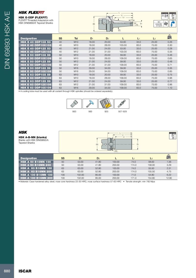 L A 0.003 A 58-60 HRc L 1 HSK E-ODP (FLEXFIT) L 3 FLEXFIT Threaded Adaptation with 10 G2.5 HSK DIN69893/E Tapered Shanks SS Tsi D 1 25,000 RPM U<1.0 gmm D 2 kg Designation SS Tsi D 1 D 2 L L 1 L 3 HSK E 40 ODP10X 53 40 M10 18.00 20.00 53.00 33.0 25.00 0.26 HSK E 40 ODP10X103 40 M10 18.00 28.00 103.00 83.0 75.00 0.30 HSK E 40 ODP12X 53 40 M12 21.00 24.00 53.00 33.0 25.00 0.28 HSK E 40 ODP12X103 40 M12 21.00 31.00 103.00 83.0 75.00 0.35 HSK E 50 ODP10X 59 50 M10 18.00 20.00 59.00 33.0 25.00 0.46 HSK E 50 ODP10X109 50 M10 18.00 28.00 109.00 83.0 75.00 0.65 HSK E 50 ODP12X 59 50 M12 21.00 24.00 59.00 33.0 25.00 0.48 HSK E 50 ODP12X109 50 M12 21.00 31.00 109.00 83.0 75.00 0.71 DIN 69893 HSK A/E HSK E 50 ODP16X 59 50 M16 29.00 34.00 59.00 33.0 25.00 0.35 HSK E 50 ODP16X109 50 M16 29.00 34.00 109.00 83.0 75.00 0.85 HSK E 63 ODP10X 59 63 M10 18.00 20.00 59.00 33.0 25.00 0.75 HSK E 63 ODP10X109 63 M10 18.00 28.00 109.00 83.0 75.00 0.96 HSK E 63 ODP12X 59 63 M12 21.00 24.00 59.00 33.0 25.00 0.77 HSK E 63 ODP12X109 63 M12 21.00 31.00 109.00 83.0 75.00 0.96 HSK E 63 ODP16X109 63 M16 29.00 34.00 109.00 83.0 75.00 1.10 • A cooling tube must be used with all coolant through HSK spindles (should be ordered separately). 983 983 925 927-929 L 58-60 HRc L 1 HSK A-B-MN (blanks) L 3 Blanks with HSK DIN69893/A Tapered Shanks SS D 1 D 2 . kg Designation SS D 1 D 2 L L 1 L 3 HSK A 50 B16MN 100 50 53.00 41.80 100.00 74.0 58.00 1.56 HSK A 50 B16MN 200 50 53.00 41.80 200.00 174.0 158.00 3.29 HSK A 63 B16MN 100 63 63.00 52.80 100.00 74.0 55.50 2.31 HSK A 63 B16MN 200 63 63.00 52.80 200.00 174.0 155.50 4.75 HSK A 100 B16MN 100 100 102.00 85.00 100.00 71.0 54.80 6.22 HSK A 100 B16MN 200 100 102.00 85.00 200.00 171.0 154.80 12.90 • Material: Case hardened alloy steel, nose core hardness 22-30 HRC, nose surface hardness 57-60 HRC • Tensile strength: min 760 Mpa 880 ISCAR