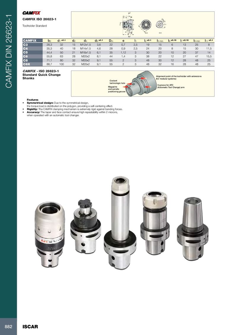 C l8 l7 A CAMFIX ISO 26623-1 d4 2e d2 d1 Dm Toolholder Standard d5 l1 b2 l11 A l6 A-A C-C l2 l3 C CAMFIX b 2 d 1 ±0.1 d 2 d 4 d 5 ±0.1 D m e l 1 l 2 ±0.1 l 3 min l 6 ±0.15 l 7 ±0.15 l 8 min l 11 ±0.1 C3 28,3 32 15 M12x1.5 3,6 22 0,7 2,5 19 15 6 13 25 8 C4 35,3 40 18 M14x1.5 4,6 28 0,9 2,5 24 20 8 15 30 11,5 C5 44,4 50 21 M16x1.5 6,1 35 1,12 3 30 20 10 20 37 14 C6 55,8 63 28 M20x2 8,1 44 1,4 3 38 22 12 27 47 15,5 C8 71,1 80 32 M20x2 9,1 55 2 3 48 30 12 28 48 25 C8X 88,7 100 32 M20x2 9,1 55 2 3 48 32 16 28 48 25 CAMFIX - ISO 26623-1 Standard Quick Change Alignment point of the toolholder with extensions Shanks (for modular systems) Coolant technologic hole V-groove for ATC CAMFIX DIN 26623-1 Magazine (Automatic Tool Change) arm and spindle positioning groove Features • Symmetrical design: Due to the symmetrical design, the torque load is distributed on the polygon, providing a self-centering effect. • Rigidity: The CAMFIX clamping mechanism is extremely rigid against bending forces. • Accuracy: The taper and face contact ensure high repeatability within 2 microns, when operated with an automatic tool changer. 882 ISCAR
