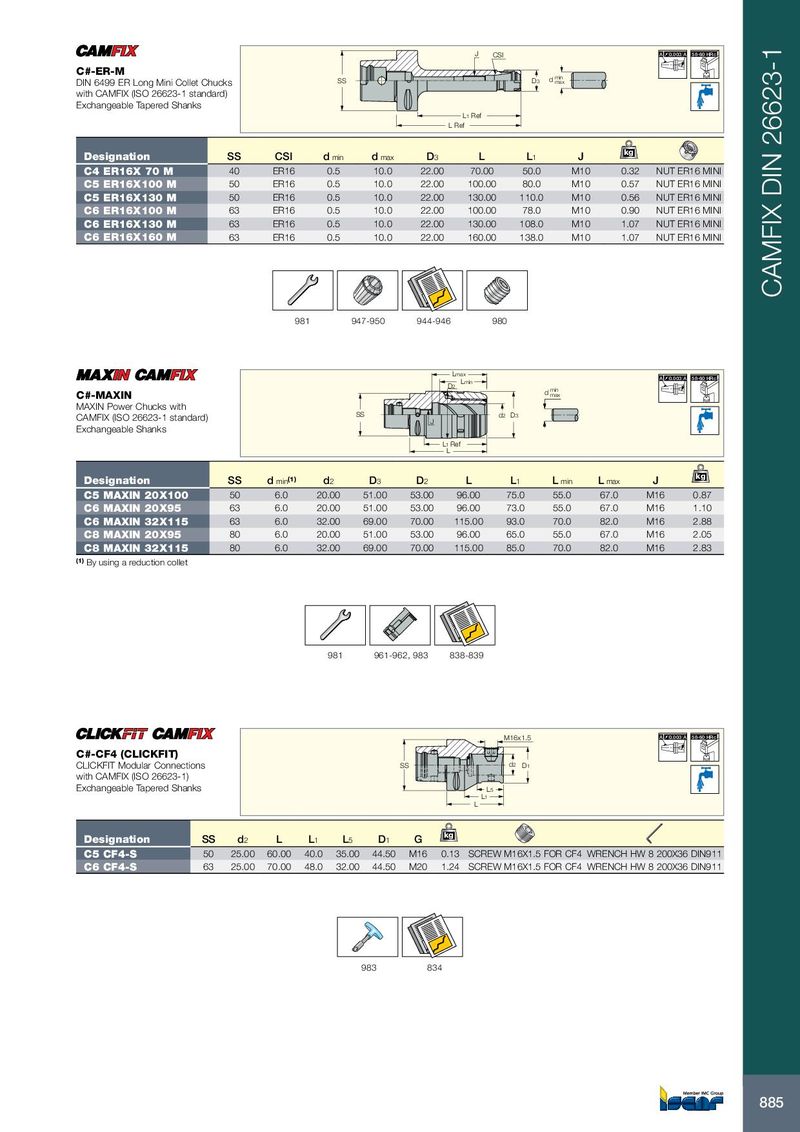 J CSI A 0.003 A 58-60 HRc C#-ER-M DIN 6499 ER Long Mini Collet Chucks SS D3 d min max with CAMFIX (ISO 26623-1 standard) Exchangeable Tapered Shanks L1 Ref L Ref kg Designation SS CSI d min d max D 3 L L 1 J C4 ER16X 70 M 40 ER16 0.5 10.0 22.00 70.00 50.0 M10 0.32 NUT ER16 MINI C5 ER16X100 M 50 ER16 0.5 10.0 22.00 100.00 80.0 M10 0.57 NUT ER16 MINI C5 ER16X130 M 50 ER16 0.5 10.0 22.00 130.00 110.0 M10 0.56 NUT ER16 MINI C6 ER16X100 M 63 ER16 0.5 10.0 22.00 100.00 78.0 M10 0.90 NUT ER16 MINI C6 ER16X130 M 63 ER16 0.5 10.0 22.00 130.00 108.0 M10 1.07 NUT ER16 MINI C6 ER16X160 M 63 ER16 0.5 10.0 22.00 160.00 138.0 M10 1.07 NUT ER16 MINI CAMFIX DIN 26623-1 981 947-950 944-946 980 Lmax Lmin A 0.003 A 58-60 HRc D2 C#-MAXIN d min max MAXIN Power Chucks with CAMFIX (ISO 26623-1 standard) SS d2 D3 J Exchangeable Shanks L1 Ref L kg Designation SS d min (1) d 2 D 3 D 2 L L 1 L min L max J C5 MAXIN 20X100 50 6.0 20.00 51.00 53.00 96.00 75.0 55.0 67.0 M16 0.87 C6 MAXIN 20X95 63 6.0 20.00 51.00 53.00 96.00 73.0 55.0 67.0 M16 1.10 C6 MAXIN 32X115 63 6.0 32.00 69.00 70.00 115.00 93.0 70.0 82.0 M16 2.88 C8 MAXIN 20X95 80 6.0 20.00 51.00 53.00 96.00 65.0 55.0 67.0 M16 2.05 C8 MAXIN 32X115 80 6.0 32.00 69.00 70.00 115.00 85.0 70.0 82.0 M16 2.83 (1) By using a reduction collet 981 961-962, 983 838-839 M16x1.5 A 0.003 A 58-60 HRc C#-CF4 (CLICKFIT) CLICKFIT Modular Connections SS d2 D1 with CAMFIX (ISO 26623-1) Exchangeable Tapered Shanks L5 L1 L kg Designation SS d 2 L L 1 L 5 D 1 G C5 CF4-S 50 25.00 60.00 40.0 35.00 44.50 M16 0.13 SCREW M16X1.5 FOR CF4 WRENCH HW 8 200X36 DIN911 C6 CF4-S 63 25.00 70.00 48.0 32.00 44.50 M20 1.24 SCREW M16X1.5 FOR CF4 WRENCH HW 8 200X36 DIN911 983 834 885