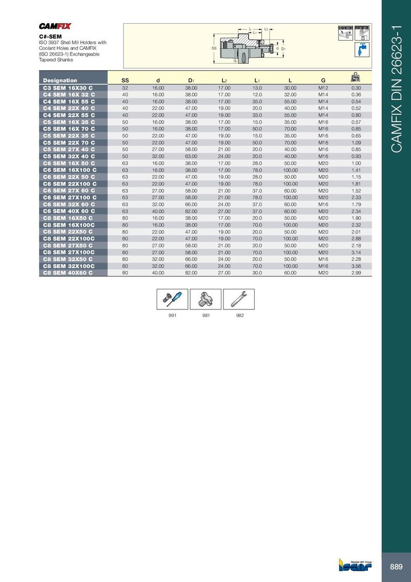 L L2 A 0.005 A 58-60 HRc L1 C#-SEM ISO 3937 Shell Mill Holders with Coolant Holes and CAMFIX SS d D1 (ISO 26623-1) Exchangeable Tapered Shanks G kg Designation SS d D 1 L 2 L 1 L G C3 SEM 16X30 C 32 16.00 38.00 17.00 13.0 30.00 M12 0.30 C4 SEM 16X 32 C 40 16.00 38.00 17.00 12.0 32.00 M14 0.36 C4 SEM 16X 55 C 40 16.00 38.00 17.00 35.0 55.00 M14 0.54 C4 SEM 22X 40 C 40 22.00 47.00 19.00 20.0 40.00 M14 0.52 C4 SEM 22X 55 C 40 22.00 47.00 19.00 33.0 55.00 M14 0.80 C5 SEM 16X 35 C 50 16.00 38.00 17.00 15.0 35.00 M16 0.57 C5 SEM 16X 70 C 50 16.00 38.00 17.00 50.0 70.00 M16 0.85 C5 SEM 22X 35 C 50 22.00 47.00 19.00 15.0 35.00 M16 0.65 C5 SEM 22X 70 C 50 22.00 47.00 19.00 50.0 70.00 M16 1.09 C5 SEM 27X 40 C 50 27.00 58.00 21.00 20.0 40.00 M16 0.85 CAMFIX DIN 26623-1 C5 SEM 32X 40 C 50 32.00 63.00 24.00 20.0 40.00 M16 0.93 C6 SEM 16X 50 C 63 16.00 38.00 17.00 28.0 50.00 M20 1.00 C6 SEM 16X100 C 63 16.00 38.00 17.00 78.0 100.00 M20 1.41 C6 SEM 22X 50 C 63 22.00 47.00 19.00 28.0 50.00 M20 1.15 C6 SEM 22X100 C 63 22.00 47.00 19.00 78.0 100.00 M20 1.81 C6 SEM 27X 60 C 63 27.00 58.00 21.00 37.0 60.00 M20 1.52 C6 SEM 27X100 C 63 27.00 58.00 21.00 78.0 100.00 M20 2.33 C6 SEM 32X 60 C 63 32.00 66.00 24.00 37.0 60.00 M16 1.79 C6 SEM 40X 60 C 63 40.00 82.00 27.00 37.0 60.00 M20 2.34 C8 SEM 16X50 C 80 16.00 38.00 17.00 20.0 50.00 M20 1.90 C8 SEM 16X100C 80 16.00 38.00 17.00 70.0 100.00 M20 2.32 C8 SEM 22X50 C 80 22.00 47.00 19.00 20.0 50.00 M20 2.01 C8 SEM 22X100C 80 22.00 47.00 19.00 70.0 100.00 M20 2.88 C8 SEM 27X50 C 80 27.00 58.00 21.00 20.0 50.00 M20 2.18 C8 SEM 27X100C 80 27.00 58.00 21.00 70.0 100.00 M20 3.14 C8 SEM 32X50 C 80 32.00 66.00 24.00 20.0 50.00 M16 2.28 C8 SEM 32X100C 80 32.00 66.00 24.00 70.0 100.00 M16 3.56 C8 SEM 40X60 C 80 40.00 82.00 27.00 30.0 60.00 M20 2.99 991 981 982 889