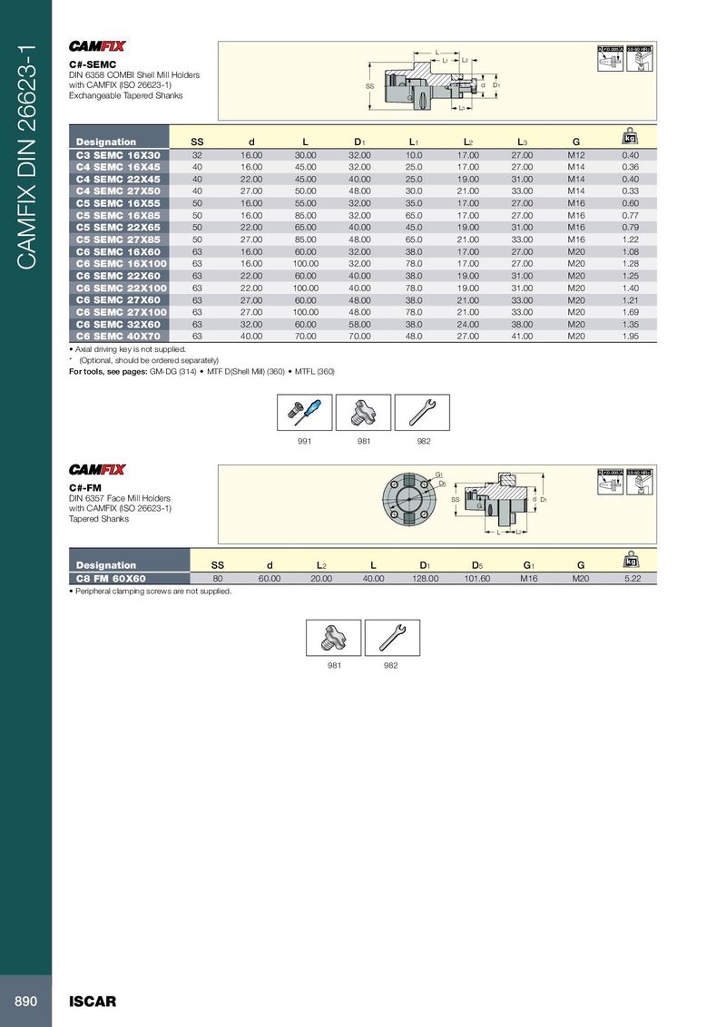 L A 0.005 A 58-60 HRc L1 L2 C#-SEMC DIN 6358 COMBI Shell Mill Holders with CAMFIX (ISO 26623-1) SS d D1 Exchangeable Tapered Shanks G L3 kg Designation SS d L D 1 L 1 L 2 L 3 G C3 SEMC 16X30 32 16.00 30.00 32.00 10.0 17.00 27.00 M12 0.40 C4 SEMC 16X45 40 16.00 45.00 32.00 25.0 17.00 27.00 M14 0.36 C4 SEMC 22X45 40 22.00 45.00 40.00 25.0 19.00 31.00 M14 0.40 C4 SEMC 27X50 40 27.00 50.00 48.00 30.0 21.00 33.00 M14 0.33 C5 SEMC 16X55 50 16.00 55.00 32.00 35.0 17.00 27.00 M16 0.60 C5 SEMC 16X85 50 16.00 85.00 32.00 65.0 17.00 27.00 M16 0.77 C5 SEMC 22X65 50 22.00 65.00 40.00 45.0 19.00 31.00 M16 0.79 C5 SEMC 27X85 50 27.00 85.00 48.00 65.0 21.00 33.00 M16 1.22 C6 SEMC 16X60 63 16.00 60.00 32.00 38.0 17.00 27.00 M20 1.08 CAMFIX DIN 26623-1 C6 SEMC 16X100 63 16.00 100.00 32.00 78.0 17.00 27.00 M20 1.28 C6 SEMC 22X60 63 22.00 60.00 40.00 38.0 19.00 31.00 M20 1.25 C6 SEMC 22X100 63 22.00 100.00 40.00 78.0 19.00 31.00 M20 1.40 C6 SEMC 27X60 63 27.00 60.00 48.00 38.0 21.00 33.00 M20 1.21 C6 SEMC 27X100 63 27.00 100.00 48.00 78.0 21.00 33.00 M20 1.69 C6 SEMC 32X60 63 32.00 60.00 58.00 38.0 24.00 38.00 M20 1.35 C6 SEMC 40X70 63 40.00 70.00 70.00 48.0 27.00 41.00 M20 1.95 • Axial driving key is not supplied. * (Optional, should be ordered separately) For tools, see pages: GM-DG (314) • MTF D(Shell Mill) (360) • MTFL (360) 991 981 982 G1 A 0.005 A 58-60 HRc D5 C#-FM DIN 6357 Face Mill Holders SS d D1 with CAMFIX (ISO 26623-1) G Tapered Shanks L L2 kg Designation SS d L 2 L D 1 D 5 G 1 G C8 FM 60X60 80 60.00 20.00 40.00 128.00 101.60 M16 M20 5.22 • Peripheral clamping screws are not supplied. 981 982 890 ISCAR