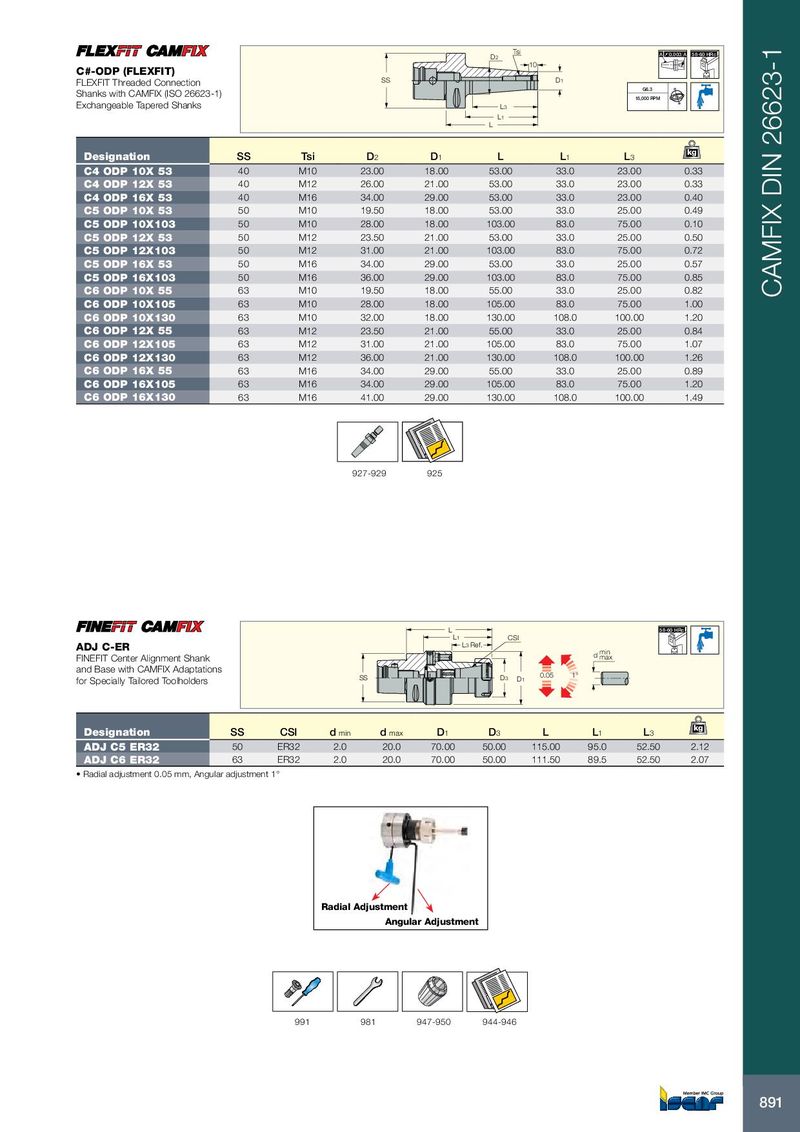 Tsi D2 A 0.003 A 58-60 HRc 10 C#-ODP (FLEXFIT) FLEXFIT Threaded Connection SS D1 G6.3 Shanks with CAMFIX (ISO 26623-1) 15,000 RPM Exchangeable Tapered Shanks L3 L1 L kg Designation SS Tsi D 2 D 1 L L 1 L 3 C4 ODP 10X 53 40 M10 23.00 18.00 53.00 33.0 23.00 0.33 C4 ODP 12X 53 40 M12 26.00 21.00 53.00 33.0 23.00 0.33 C4 ODP 16X 53 40 M16 34.00 29.00 53.00 33.0 23.00 0.40 C5 ODP 10X 53 50 M10 19.50 18.00 53.00 33.0 25.00 0.49 C5 ODP 10X103 50 M10 28.00 18.00 103.00 83.0 75.00 0.10 C5 ODP 12X 53 50 M12 23.50 21.00 53.00 33.0 25.00 0.50 C5 ODP 12X103 50 M12 31.00 21.00 103.00 83.0 75.00 0.72 C5 ODP 16X 53 50 M16 34.00 29.00 53.00 33.0 25.00 0.57 C5 ODP 16X103 50 M16 36.00 29.00 103.00 83.0 75.00 0.85 C6 ODP 10X 55 63 M10 19.50 18.00 55.00 33.0 25.00 0.82 CAMFIX DIN 26623-1 C6 ODP 10X105 63 M10 28.00 18.00 105.00 83.0 75.00 1.00 C6 ODP 10X130 63 M10 32.00 18.00 130.00 108.0 100.00 1.20 C6 ODP 12X 55 63 M12 23.50 21.00 55.00 33.0 25.00 0.84 C6 ODP 12X105 63 M12 31.00 21.00 105.00 83.0 75.00 1.07 C6 ODP 12X130 63 M12 36.00 21.00 130.00 108.0 100.00 1.26 C6 ODP 16X 55 63 M16 34.00 29.00 55.00 33.0 25.00 0.89 C6 ODP 16X105 63 M16 34.00 29.00 105.00 83.0 75.00 1.20 C6 ODP 16X130 63 M16 41.00 29.00 130.00 108.0 100.00 1.49 927-929 925 L 58-60 HRc L1 CSI ADJ C-ER L3 Ref. FINEFIT Center Alignment Shank d min max and Base with CAMFIX Adaptations 0.05 for Specially Tailored Toolholders SS D3 D1 1° kg Designation SS CSI d min d max D 1 D 3 L L 1 L 3 ADJ C5 ER32 50 ER32 2.0 20.0 70.00 50.00 115.00 95.0 52.50 2.12 ADJ C6 ER32 63 ER32 2.0 20.0 70.00 50.00 111.50 89.5 52.50 2.07 • Radial adjustment 0.05 mm, Angular adjustment 1° Radial Adjustment Angular Adjustment 991 981 947-950 944-946 891