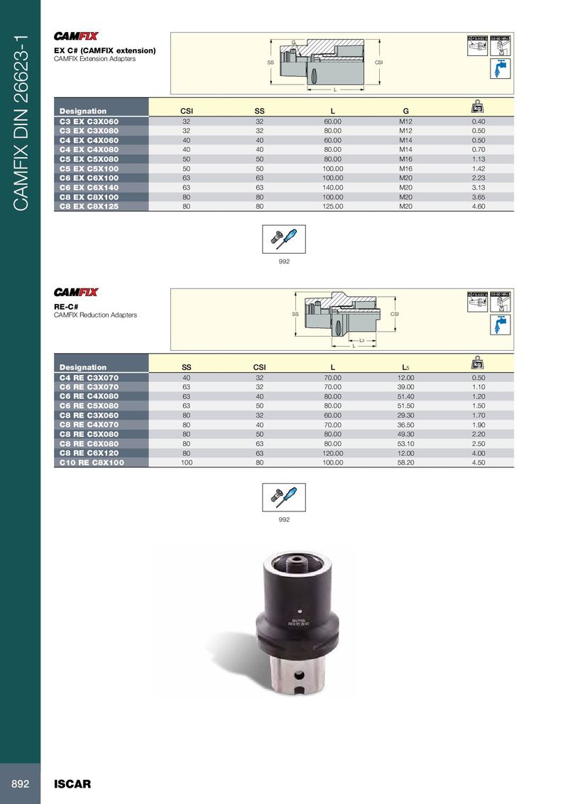 A 0.003 A 58-60 HRc G EX C# (CAMFIX extension) CAMFIX Extension Adapters SS CSI L kg Designation CSI SS L G C3 EX C3X060 32 32 60.00 M12 0.40 C3 EX C3X080 32 32 80.00 M12 0.50 C4 EX C4X060 40 40 60.00 M14 0.50 C4 EX C4X080 40 40 80.00 M14 0.70 C5 EX C5X080 50 50 80.00 M16 1.13 C5 EX C5X100 50 50 100.00 M16 1.42 C6 EX C6X100 63 63 100.00 M20 2.23 C6 EX C6X140 63 63 140.00 M20 3.13 C8 EX C8X100 80 80 100.00 M20 3.65 CAMFIX DIN 26623-1 C8 EX C8X125 80 80 125.00 M20 4.60 992 A 0.003 A 58-60 HRc RE-C# CAMFIX Reduction Adapters SS CSI L5 L kg Designation SS CSI L L 5 C4 RE C3X070 40 32 70.00 12.00 0.50 C6 RE C3X070 63 32 70.00 39.00 1.10 C6 RE C4X080 63 40 80.00 51.40 1.20 C6 RE C5X080 63 50 80.00 51.50 1.50 C8 RE C3X060 80 32 60.00 29.30 1.70 C8 RE C4X070 80 40 70.00 36.50 1.90 C8 RE C5X080 80 50 80.00 49.30 2.20 C8 RE C6X080 80 63 80.00 53.10 2.50 C8 RE C6X120 80 63 120.00 12.00 4.00 C10 RE C8X100 100 80 100.00 58.20 4.50 992 892 ISCAR