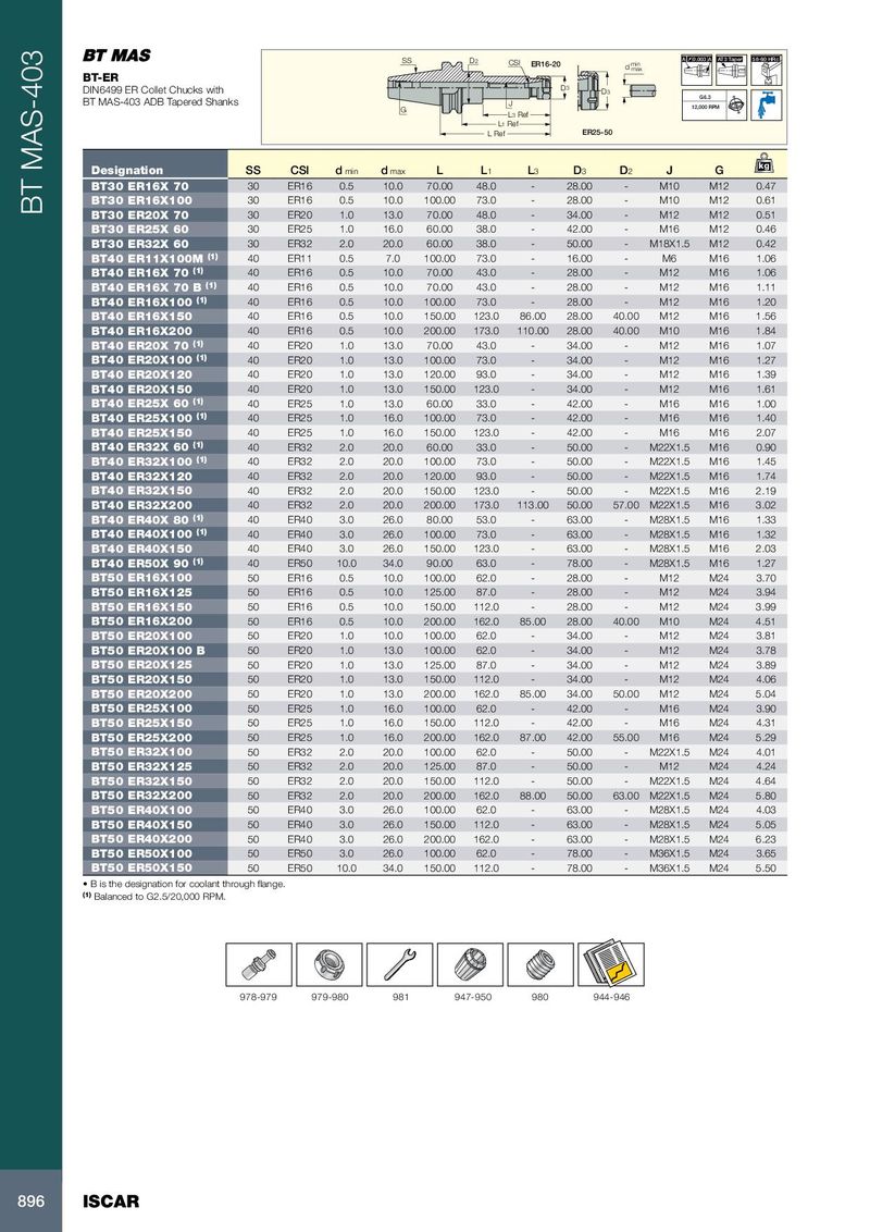 SS D 2 CSI A 0.003 A AT3 Taper 58-60 HRc ER16-20 d min max BT-ER DIN6499 ER Collet Chucks with D 3 D 3 G6.3 BT MAS-403 ADB Tapered Shanks J G 12,000 RPM L 3 Ref L 1 Ref L Ref ER25-50 kg Designation SS CSI d min d max L L 1 L 3 D 3 D 2 J G BT30 ER16X 70 30 ER16 0.5 10.0 70.00 48.0 - 28.00 - M10 M12 0.47 BT30 ER16X100 30 ER16 0.5 10.0 100.00 73.0 - 28.00 - M10 M12 0.61 BT MAS-403 BT30 ER20X 70 30 ER20 1.0 13.0 70.00 48.0 - 34.00 - M12 M12 0.51 BT30 ER25X 60 30 ER25 1.0 16.0 60.00 38.0 - 42.00 - M16 M12 0.46 BT30 ER32X 60 30 ER32 2.0 20.0 60.00 38.0 - 50.00 - M18X1.5 M12 0.42 BT40 ER11X100M (1) 40 ER11 0.5 7.0 100.00 73.0 - 16.00 - M6 M16 1.06 BT40 ER16X 70 (1) 40 ER16 0.5 10.0 70.00 43.0 - 28.00 - M12 M16 1.06 BT40 ER16X 70 B (1) 40 ER16 0.5 10.0 70.00 43.0 - 28.00 - M12 M16 1.11 BT40 ER16X100 (1) 40 ER16 0.5 10.0 100.00 73.0 - 28.00 - M12 M16 1.20 BT40 ER16X150 40 ER16 0.5 10.0 150.00 123.0 86.00 28.00 40.00 M12 M16 1.56 BT40 ER16X200 40 ER16 0.5 10.0 200.00 173.0 110.00 28.00 40.00 M10 M16 1.84 BT40 ER20X 70 (1) 40 ER20 1.0 13.0 70.00 43.0 - 34.00 - M12 M16 1.07 BT40 ER20X100 (1) 40 ER20 1.0 13.0 100.00 73.0 - 34.00 - M12 M16 1.27 BT40 ER20X120 40 ER20 1.0 13.0 120.00 93.0 - 34.00 - M12 M16 1.39 BT40 ER20X150 40 ER20 1.0 13.0 150.00 123.0 - 34.00 - M12 M16 1.61 BT40 ER25X 60 (1) 40 ER25 1.0 13.0 60.00 33.0 - 42.00 - M16 M16 1.00 BT40 ER25X100 (1) 40 ER25 1.0 16.0 100.00 73.0 - 42.00 - M16 M16 1.40 BT40 ER25X150 40 ER25 1.0 16.0 150.00 123.0 - 42.00 - M16 M16 2.07 BT40 ER32X 60 (1) 40 ER32 2.0 20.0 60.00 33.0 - 50.00 - M22X1.5 M16 0.90 BT40 ER32X100 (1) 40 ER32 2.0 20.0 100.00 73.0 - 50.00 - M22X1.5 M16 1.45 BT40 ER32X120 40 ER32 2.0 20.0 120.00 93.0 - 50.00 - M22X1.5 M16 1.74 BT40 ER32X150 40 ER32 2.0 20.0 150.00 123.0 - 50.00 - M22X1.5 M16 2.19 BT40 ER32X200 40 ER32 2.0 20.0 200.00 173.0 113.00 50.00 57.00 M22X1.5 M16 3.02 BT40 ER40X 80 (1) 40 ER40 3.0 26.0 80.00 53.0 - 63.00 - M28X1.5 M16 1.33 BT40 ER40X100 (1) 40 ER40 3.0 26.0 100.00 73.0 - 63.00 - M28X1.5 M16 1.32 BT40 ER40X150 40 ER40 3.0 26.0 150.00 123.0 - 63.00 - M28X1.5 M16 2.03 BT40 ER50X 90 (1) 40 ER50 10.0 34.0 90.00 63.0 - 78.00 - M28X1.5 M16 1.27 BT50 ER16X100 50 ER16 0.5 10.0 100.00 62.0 - 28.00 - M12 M24 3.70 BT50 ER16X125 50 ER16 0.5 10.0 125.00 87.0 - 28.00 - M12 M24 3.94 BT50 ER16X150 50 ER16 0.5 10.0 150.00 112.0 - 28.00 - M12 M24 3.99 BT50 ER16X200 50 ER16 0.5 10.0 200.00 162.0 85.00 28.00 40.00 M10 M24 4.51 BT50 ER20X100 50 ER20 1.0 10.0 100.00 62.0 - 34.00 - M12 M24 3.81 BT50 ER20X100 B 50 ER20 1.0 13.0 100.00 62.0 - 34.00 - M12 M24 3.78 BT50 ER20X125 50 ER20 1.0 13.0 125.00 87.0 - 34.00 - M12 M24 3.89 BT50 ER20X150 50 ER20 1.0 13.0 150.00 112.0 - 34.00 - M12 M24 4.06 BT50 ER20X200 50 ER20 1.0 13.0 200.00 162.0 85.00 34.00 50.00 M12 M24 5.04 BT50 ER25X100 50 ER25 1.0 16.0 100.00 62.0 - 42.00 - M16 M24 3.90 BT50 ER25X150 50 ER25 1.0 16.0 150.00 112.0 - 42.00 - M16 M24 4.31 BT50 ER25X200 50 ER25 1.0 16.0 200.00 162.0 87.00 42.00 55.00 M16 M24 5.29 BT50 ER32X100 50 ER32 2.0 20.0 100.00 62.0 - 50.00 - M22X1.5 M24 4.01 BT50 ER32X125 50 ER32 2.0 20.0 125.00 87.0 - 50.00 - M12 M24 4.24 BT50 ER32X150 50 ER32 2.0 20.0 150.00 112.0 - 50.00 - M22X1.5 M24 4.64 BT50 ER32X200 50 ER32 2.0 20.0 200.00 162.0 88.00 50.00 63.00 M22X1.5 M24 5.80 BT50 ER40X100 50 ER40 3.0 26.0 100.00 62.0 - 63.00 - M28X1.5 M24 4.03 BT50 ER40X150 50 ER40 3.0 26.0 150.00 112.0 - 63.00 - M28X1.5 M24 5.05 BT50 ER40X200 50 ER40 3.0 26.0 200.00 162.0 - 63.00 - M28X1.5 M24 6.23 BT50 ER50X100 50 ER50 3.0 26.0 100.00 62.0 - 78.00 - M36X1.5 M24 3.65 BT50 ER50X150 50 ER50 10.0 34.0 150.00 112.0 - 78.00 - M36X1.5 M24 5.50 • B is the designation for coolant through flange. (1) Balanced to G2.5/20,000 RPM. 978-979 979-980 981 947-950 980 944-946 896 ISCAR