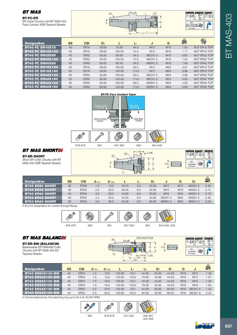 SS J CSI A 0.003 A 58-60 HRc AT3 Taper BT-FC-ER ER Collet Chucks with BT MAS-403 G D3 G2.5 Face Contact ADB Tapered Shanks SK 40= 20,000 RPM SK 50=15,000 RPM U<1.0 gmm L1 L kg Designation SS CSI D 3 L L 1 J G BT40 FC ER16X70 40 ER16 28.00 70.00 44.0 M12 M16 1.05 NUT ER16 TOP BT40 FC ER16X100 40 ER16 28.00 100.00 74.0 M12 M16 1.17 NUT ER16 TOP BT40 FC ER32X60 40 ER32 50.00 60.00 34.0 M22X1.5 M16 0.92 NUT ER32 TOP BT MAS-403 BT40 FC ER32X100 40 ER32 50.00 100.00 74.0 M22X1.5 M16 1.54 NUT ER32 TOP BT40 FC ER40X80 40 ER40 63.00 80.00 54.0 M28X1.5 M16 1.09 NUT ER40 TOP BT50 FC ER16X100 50 ER16 28.00 100.00 63.5 M12 M24 3.91 NUT ER16 TOP BT50 FC ER16X150 50 ER16 28.00 150.00 113.5 M12 M24 3.96 NUT ER16 TOP BT50 FC ER32X100 50 ER32 50.00 100.00 63.5 M22X1.5 M24 3.98 NUT ER32 TOP BT50 FC ER32X150 50 ER32 50.00 150.00 113.5 M22X1.5 M24 4.65 NUT ER32 TOP BT50 FC ER40X100 50 ER40 63.00 100.00 63.5 M28X1.5 M24 4.03 NUT ER40 TOP BT50 FC ER40X150 50 ER40 63.00 150.00 113.5 M28X1.5 M24 5.60 NUT ER40 TOP BT-FC Face Contact Taper Face Contact Standard Spindle Spindle Face Contact Standard Holder Holder 978-979 981 947-950 980 944-946 L Ref A 0.003 A AT3 Taper 58-60 HRc CSI L 1 Ref BT-ER-SHORT SS Short ER Collet Chucks with BT G2.5 MAS-403 ADB Tapered Shanks D 3 G 1 d min max 20,000 RPM G U<1.0 gmm J kg Designation SS CSI d min d max L L 1 D 3 J G G 1 BT30 ER20 SHORT 30 ER20 1.0 13.0 23.70 5.2 25.00 M12 M12 M25X1.5 0.30 BT40 ER32 SHORT 40 ER32 2.0 20.0 36.50 6.0 40.00 M16 M16 M40X1.5 0.74 BT40 ER40 SHORT 40 ER40 3.0 26.0 43.00 6.0 50.00 M16 M16 M50X1.5 0.78 BT50 ER32 SHORT 50 ER32 2.0 20.0 44.00 6.0 40.00 M22X1.5 M24 M40X1.5 3.36 BT50 ER40 SHORT 50 ER40 3.0 26.0 44.00 6.0 50.00 M28X1.5 M24 M50X1.5 3.09 • B is the designation for coolant through flange. 978-979 980 981 947-950 980 944-946, 843 Balanceable Rings SS A 0.003 A AT3 Taper 58-60 HRc BT-ER-BIN (BALANCIN) Balanceable ER DIN6499 Collet D 3 D 1 d min max G2.5 Chucks with BT MAS-403 AD 20,000 RPM Tapered Shanks G J U<1.0 gmm L 3 Ref CSI L 1 Ref L Ref kg Designation SS CSI d min d max L L 1 L 3 D 3 D 1 G J BT40 ER20X100 BIN 40 ER20 1.0 13.0 100.00 73.0 44.60 34.00 44.00 M16 M12 1.30 BT40 ER20X150 BIN 40 ER20 1.0 13.0 150.00 123.0 79.60 34.00 44.00 M16 M12 1.67 BT40 ER25X100 BIN 40 ER25 1.0 16.0 100.00 73.0 43.00 42.00 44.00 M16 M16 1.26 BT40 ER25X150 BIN 40 ER25 1.0 16.0 150.00 123.0 79.00 42.00 44.00 M16 M16 1.64 BT40 ER32X100 BIN 40 ER32 2.0 20.0 100.00 73.0 44.00 50.00 60.00 M16 M22X1.5 1.53 BT40 ER32X150 BIN 40 ER32 2.0 20.0 150.00 123.0 94.00 50.00 60.00 M16 M22X1.5 2.24 • Can be balanced by the balancing ring up to G2.5 at 30,000 RPM. 992 978-979 947-950 836-837 944-946 897