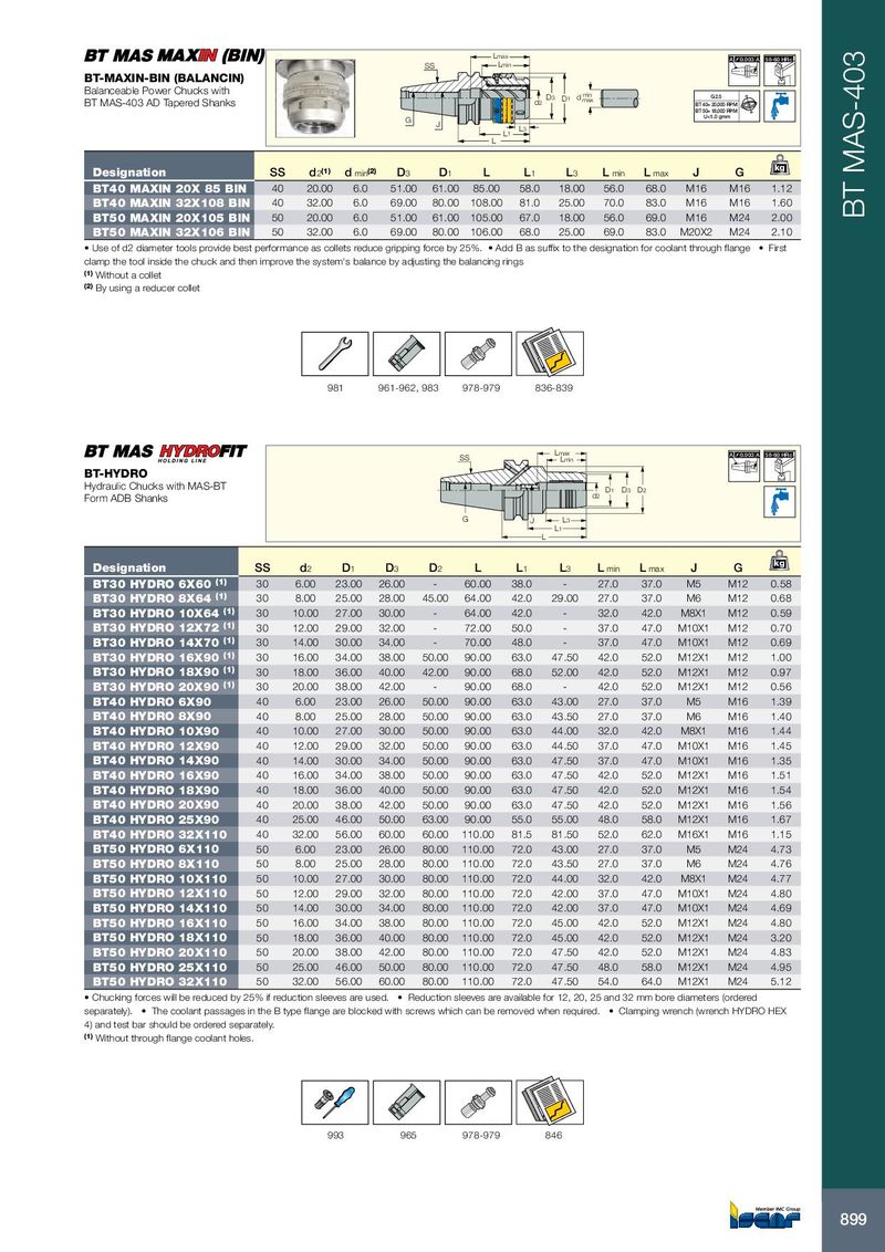 L max A 0.003 A 58-60 HRc SS L min BT-MAXIN-BIN (BALANCIN) Balanceable Power Chucks with D 3 D 1 d min BT MAS-403 AD Tapered Shanks max G2.5 d 2 BT 40= 20,000 RPM BT 50= 18,000 RPM G U<1.0 gmm J L 3 L 1 L kg Designation SS d 2 (1) d min (2) D 3 D 1 L L 1 L 3 L min L max J G BT40 MAXIN 20X 85 BIN 40 20.00 6.0 51.00 61.00 85.00 58.0 18.00 56.0 68.0 M16 M16 1.12 BT40 MAXIN 32X108 BIN 40 32.00 6.0 69.00 80.00 108.00 81.0 25.00 70.0 83.0 M16 M16 1.60 BT50 MAXIN 20X105 BIN 50 20.00 6.0 51.00 61.00 105.00 67.0 18.00 56.0 69.0 M16 M24 2.00 BT MAS-403 BT50 MAXIN 32X106 BIN 50 32.00 6.0 69.00 80.00 106.00 68.0 25.00 69.0 83.0 M20X2 M24 2.10 • Use of d2 diameter tools provide best performance as collets reduce gripping force by 25%. • Add B as suffix to the designation for coolant through flange • First clamp the tool inside the chuck and then improve the system's balance by adjusting the balancing rings (1) Without a collet (2) By using a reducer collet 981 961-962, 983 978-979 836-839 Lmax SS A 0.003 A 58-60 HRc Lmin BT-HYDRO Hydraulic Chucks with MAS-BT D1 D3 D2 Form ADB Shanks d2 G J L3 L1 L kg Designation SS d 2 D 1 D 3 D 2 L L 1 L 3 L min L max J G BT30 HYDRO 6X60 (1) 30 6.00 23.00 26.00 - 60.00 38.0 - 27.0 37.0 M5 M12 0.58 BT30 HYDRO 8X64 (1) 30 8.00 25.00 28.00 45.00 64.00 42.0 29.00 27.0 37.0 M6 M12 0.68 BT30 HYDRO 10X64 (1) 30 10.00 27.00 30.00 - 64.00 42.0 - 32.0 42.0 M8X1 M12 0.59 BT30 HYDRO 12X72 (1) 30 12.00 29.00 32.00 - 72.00 50.0 - 37.0 47.0 M10X1 M12 0.70 BT30 HYDRO 14X70 (1) 30 14.00 30.00 34.00 - 70.00 48.0 - 37.0 47.0 M10X1 M12 0.69 BT30 HYDRO 16X90 (1) 30 16.00 34.00 38.00 50.00 90.00 63.0 47.50 42.0 52.0 M12X1 M12 1.00 BT30 HYDRO 18X90 (1) 30 18.00 36.00 40.00 42.00 90.00 68.0 52.00 42.0 52.0 M12X1 M12 0.97 BT30 HYDRO 20X90 (1) 30 20.00 38.00 42.00 - 90.00 68.0 - 42.0 52.0 M12X1 M12 0.56 BT40 HYDRO 6X90 40 6.00 23.00 26.00 50.00 90.00 63.0 43.00 27.0 37.0 M5 M16 1.39 BT40 HYDRO 8X90 40 8.00 25.00 28.00 50.00 90.00 63.0 43.50 27.0 37.0 M6 M16 1.40 BT40 HYDRO 10X90 40 10.00 27.00 30.00 50.00 90.00 63.0 44.00 32.0 42.0 M8X1 M16 1.44 BT40 HYDRO 12X90 40 12.00 29.00 32.00 50.00 90.00 63.0 44.50 37.0 47.0 M10X1 M16 1.45 BT40 HYDRO 14X90 40 14.00 30.00 34.00 50.00 90.00 63.0 47.50 37.0 47.0 M10X1 M16 1.35 BT40 HYDRO 16X90 40 16.00 34.00 38.00 50.00 90.00 63.0 47.50 42.0 52.0 M12X1 M16 1.51 BT40 HYDRO 18X90 40 18.00 36.00 40.00 50.00 90.00 63.0 47.50 42.0 52.0 M12X1 M16 1.54 BT40 HYDRO 20X90 40 20.00 38.00 42.00 50.00 90.00 63.0 47.50 42.0 52.0 M12X1 M16 1.56 BT40 HYDRO 25X90 40 25.00 46.00 50.00 63.00 90.00 55.0 55.00 48.0 58.0 M12X1 M16 1.67 BT40 HYDRO 32X110 40 32.00 56.00 60.00 60.00 110.00 81.5 81.50 52.0 62.0 M16X1 M16 1.15 BT50 HYDRO 6X110 50 6.00 23.00 26.00 80.00 110.00 72.0 43.00 27.0 37.0 M5 M24 4.73 BT50 HYDRO 8X110 50 8.00 25.00 28.00 80.00 110.00 72.0 43.50 27.0 37.0 M6 M24 4.76 BT50 HYDRO 10X110 50 10.00 27.00 30.00 80.00 110.00 72.0 44.00 32.0 42.0 M8X1 M24 4.77 BT50 HYDRO 12X110 50 12.00 29.00 32.00 80.00 110.00 72.0 42.00 37.0 47.0 M10X1 M24 4.80 BT50 HYDRO 14X110 50 14.00 30.00 34.00 80.00 110.00 72.0 42.00 37.0 47.0 M10X1 M24 4.69 BT50 HYDRO 16X110 50 16.00 34.00 38.00 80.00 110.00 72.0 45.00 42.0 52.0 M12X1 M24 4.80 BT50 HYDRO 18X110 50 18.00 36.00 40.00 80.00 110.00 72.0 45.00 42.0 52.0 M12X1 M24 3.20 BT50 HYDRO 20X110 50 20.00 38.00 42.00 80.00 110.00 72.0 47.50 42.0 52.0 M12X1 M24 4.83 BT50 HYDRO 25X110 50 25.00 46.00 50.00 80.00 110.00 72.0 47.50 48.0 58.0 M12X1 M24 4.95 BT50 HYDRO 32X110 50 32.00 56.00 60.00 80.00 110.00 72.0 47.50 54.0 64.0 M12X1 M24 5.12 • Chucking forces will be reduced by 25% if reduction sleeves are used. • Reduction sleeves are available for 12, 20, 25 and 32 mm bore diameters (ordered separately). • The coolant passages in the B type flange are blocked with screws which can be removed when required. • Clamping wrench (wrench HYDRO HEX 4) and test bar should be ordered separately. (1) Without through flange coolant holes. 993 965 978-979 846 899