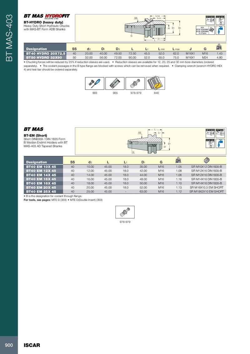 Lmax A 0.003 A 58-60 HRc SS Lmin BT-HYDRO (heavy duty) Heavy Duty Short Hydraulic Chucks d2 D1 D3 G2.5 with MAS-BT Form ADB Shanks J BT 40= 18,000 RPM BT 50= 12,000 RPM U<1.0 gmm G L1 L kg Designation SS d 2 D 1 D 3 L L 1 L min L max J G BT40 HYDRO 20X72.5 40 20.00 40.00 49.50 72.50 45.5 52.0 62.0 M16X1 M16 1.43 BT50 HYDRO 32X90 50 32.00 56.00 72.00 90.00 52.0 65.0 75.0 M16X1 M24 4.80 BT MAS-403 • Chucking forces will be reduced by 25% if reduction sleeves are used. • Reduction sleeves are available for 12, 20, 25 and 32 mm bore diameters (ordered separately). • The coolant passages in the B type flange are blocked with screws which can be removed when required. • Clamping wrench (wrench HYDRO HEX 4) and test bar should be ordered separately. 993 965 978-979 846 L A 0.005 A AT3 Taper SS L1 BT-EM (Short) Short DIN6359 / DIN 1835 Form 58-60 HRc B Weldon Endmill Holders with BT D 1 MAS-403 AD Tapered Shanks d 2 G kg Designation SS d 2 L L 1 D 1 G BT40 EM 10X 45 40 10.00 45.00 18.0 35.00 M16 1.05 SR M10X12 DIN1835-B BT40 EM 12X 45 40 12.00 45.00 18.0 42.00 M16 1.08 SR M12X16 DIN1835-B BT40 EM 14X 45 40 14.00 45.00 18.0 44.00 M16 1.06 SR M12X16 DIN1835-B BT40 EM 16X 45 40 16.00 45.00 18.0 48.00 M16 1.16 SR M14X16 DIN1835-B BT40 EM 18X 45 40 18.00 45.00 18.0 50.00 M16 1.10 SR M14X16 DIN1835-B BT40 EM 20X 45 40 20.00 45.00 18.0 52.00 M16 1.13 SR M16X10.3 EM SHORT BT40 EM 25X 45 40 25.00 45.00 - 63.00 M16 1.12 SR M18X2X10 EM SHORT • B is the designation for coolant through flange. For tools, see pages: MTE D (359) • MTE D(Double Insert) (359) 978-979 900 ISCAR