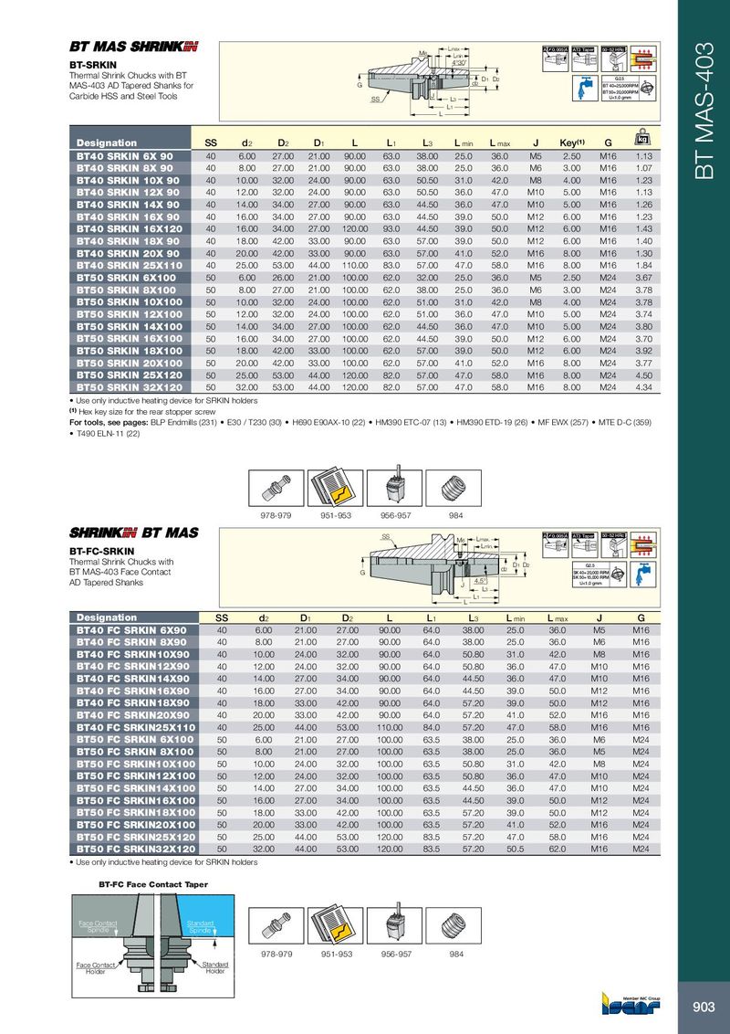 L max A 0.005 A AT3 Taper 50-52 HRc M 6 L min 4°30’ BT-SRKIN Thermal Shrink Chucks with BT D 1 D 2 G2.5 MAS-403 AD Tapered Shanks for G d 2 BT 40=25,000RPM BT 50= 20,000 RPM Carbide HSS and Steel Tools SS J L 3 U<1.0 gmm L 1 L kg Designation SS d 2 D 2 D 1 L L 1 L 3 L min L max J Key (1) G BT40 SRKIN 6X 90 40 6.00 27.00 21.00 90.00 63.0 38.00 25.0 36.0 M5 2.50 M16 1.13 BT40 SRKIN 8X 90 40 8.00 27.00 21.00 90.00 63.0 38.00 25.0 36.0 M6 3.00 M16 1.07 BT40 SRKIN 10X 90 40 10.00 32.00 24.00 90.00 63.0 50.50 31.0 42.0 M8 4.00 M16 1.23 BT MAS-403 BT40 SRKIN 12X 90 40 12.00 32.00 24.00 90.00 63.0 50.50 36.0 47.0 M10 5.00 M16 1.13 BT40 SRKIN 14X 90 40 14.00 34.00 27.00 90.00 63.0 44.50 36.0 47.0 M10 5.00 M16 1.26 BT40 SRKIN 16X 90 40 16.00 34.00 27.00 90.00 63.0 44.50 39.0 50.0 M12 6.00 M16 1.23 BT40 SRKIN 16X120 40 16.00 34.00 27.00 120.00 93.0 44.50 39.0 50.0 M12 6.00 M16 1.43 BT40 SRKIN 18X 90 40 18.00 42.00 33.00 90.00 63.0 57.00 39.0 50.0 M12 6.00 M16 1.40 BT40 SRKIN 20X 90 40 20.00 42.00 33.00 90.00 63.0 57.00 41.0 52.0 M16 8.00 M16 1.30 BT40 SRKIN 25X110 40 25.00 53.00 44.00 110.00 83.0 57.00 47.0 58.0 M16 8.00 M16 1.84 BT50 SRKIN 6X100 50 6.00 26.00 21.00 100.00 62.0 32.00 25.0 36.0 M5 2.50 M24 3.67 BT50 SRKIN 8X100 50 8.00 27.00 21.00 100.00 62.0 38.00 25.0 36.0 M6 3.00 M24 3.78 BT50 SRKIN 10X100 50 10.00 32.00 24.00 100.00 62.0 51.00 31.0 42.0 M8 4.00 M24 3.78 BT50 SRKIN 12X100 50 12.00 32.00 24.00 100.00 62.0 51.00 36.0 47.0 M10 5.00 M24 3.74 BT50 SRKIN 14X100 50 14.00 34.00 27.00 100.00 62.0 44.50 36.0 47.0 M10 5.00 M24 3.80 BT50 SRKIN 16X100 50 16.00 34.00 27.00 100.00 62.0 44.50 39.0 50.0 M12 6.00 M24 3.70 BT50 SRKIN 18X100 50 18.00 42.00 33.00 100.00 62.0 57.00 39.0 50.0 M12 6.00 M24 3.92 BT50 SRKIN 20X100 50 20.00 42.00 33.00 100.00 62.0 57.00 41.0 52.0 M16 8.00 M24 3.77 BT50 SRKIN 25X120 50 25.00 53.00 44.00 120.00 82.0 57.00 47.0 58.0 M16 8.00 M24 4.50 BT50 SRKIN 32X120 50 32.00 53.00 44.00 120.00 82.0 57.00 47.0 58.0 M16 8.00 M24 4.34 • Use only inductive heating device for SRKIN holders (1) Hex key size for the rear stopper screw For tools, see pages: BLP Endmills (231) • E30 / T230 (30) • H690 E90AX-10 (22) • HM390 ETC-07 (13) • HM390 ETD-19 (26) • MF EWX (257) • MTE D-C (359) • T490 ELN-11 (22) 978-979 951-953 956-957 984 SS A 0.005 A AT3 Taper 50-52 HRc M6 Lmax. Lmin. BT-FC-SRKIN Thermal Shrink Chucks with D1 D2 G2.5 d2 BT MAS-403 Face Contact G SK 40= 20,000 RPM SK 50=15,000 RPM AD Tapered Shanks 4.5° J U<1.0 gmm L3 L1 L Designation SS d 2 D 1 D 2 L L 1 L 3 L min L max J G BT40 FC SRKIN 6X90 40 6.00 21.00 27.00 90.00 64.0 38.00 25.0 36.0 M5 M16 BT40 FC SRKIN 8X90 40 8.00 21.00 27.00 90.00 64.0 38.00 25.0 36.0 M6 M16 BT40 FC SRKIN10X90 40 10.00 24.00 32.00 90.00 64.0 50.80 31.0 42.0 M8 M16 BT40 FC SRKIN12X90 40 12.00 24.00 32.00 90.00 64.0 50.80 36.0 47.0 M10 M16 BT40 FC SRKIN14X90 40 14.00 27.00 34.00 90.00 64.0 44.50 36.0 47.0 M10 M16 BT40 FC SRKIN16X90 40 16.00 27.00 34.00 90.00 64.0 44.50 39.0 50.0 M12 M16 BT40 FC SRKIN18X90 40 18.00 33.00 42.00 90.00 64.0 57.20 39.0 50.0 M12 M16 BT40 FC SRKIN20X90 40 20.00 33.00 42.00 90.00 64.0 57.20 41.0 52.0 M16 M16 BT40 FC SRKIN25X110 40 25.00 44.00 53.00 110.00 84.0 57.20 47.0 58.0 M16 M16 BT50 FC SRKIN 6X100 50 6.00 21.00 27.00 100.00 63.5 38.00 25.0 36.0 M6 M24 BT50 FC SRKIN 8X100 50 8.00 21.00 27.00 100.00 63.5 38.00 25.0 36.0 M5 M24 BT50 FC SRKIN10X100 50 10.00 24.00 32.00 100.00 63.5 50.80 31.0 42.0 M8 M24 BT50 FC SRKIN12X100 50 12.00 24.00 32.00 100.00 63.5 50.80 36.0 47.0 M10 M24 BT50 FC SRKIN14X100 50 14.00 27.00 34.00 100.00 63.5 44.50 36.0 47.0 M10 M24 BT50 FC SRKIN16X100 50 16.00 27.00 34.00 100.00 63.5 44.50 39.0 50.0 M12 M24 BT50 FC SRKIN18X100 50 18.00 33.00 42.00 100.00 63.5 57.20 39.0 50.0 M12 M24 BT50 FC SRKIN20X100 50 20.00 33.00 42.00 100.00 63.5 57.20 41.0 52.0 M16 M24 BT50 FC SRKIN25X120 50 25.00 44.00 53.00 120.00 83.5 57.20 47.0 58.0 M16 M24 BT50 FC SRKIN32X120 50 32.00 44.00 53.00 120.00 83.5 57.20 50.5 62.0 M16 M24 • Use only inductive heating device for SRKIN holders BT-FC Face Contact Taper Face Contact Standard Spindle Spindle 978-979 951-953 956-957 984 Face Contact Standard Holder Holder 903