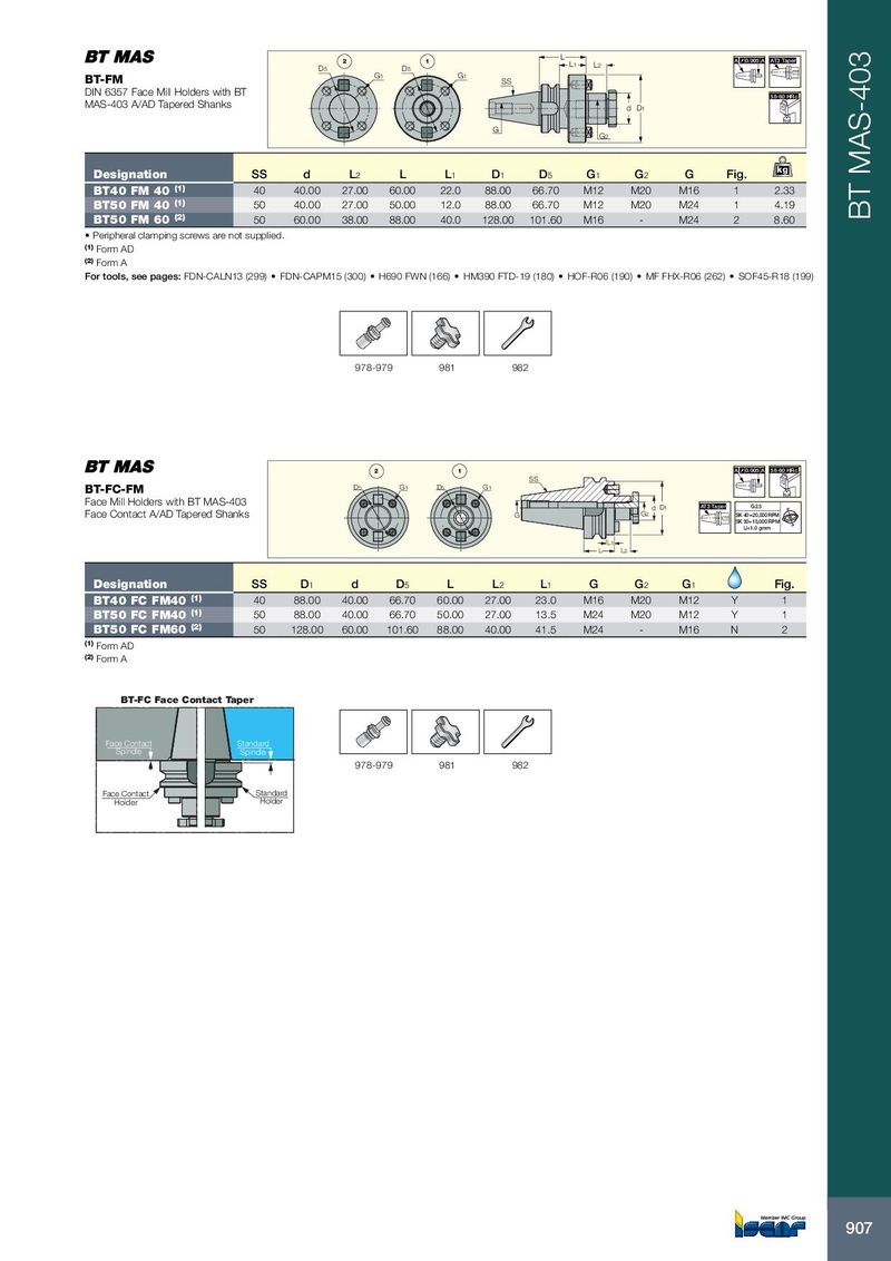 2 1 L A 0.005 A AT3 Taper D 5 D 5 L 1 L 2 G 1 G 1 BT-FM SS DIN 6357 Face Mill Holders with BT 58-60 HRc MAS-403 A/AD Tapered Shanks d D 1 G G 2 kg Designation SS d L 2 L L 1 D 1 D 5 G 1 G 2 G Fig. BT40 FM 40 (1) 40 40.00 27.00 60.00 22.0 88.00 66.70 M12 M20 M16 1 2.33 BT50 FM 40 (1) 50 40.00 27.00 50.00 12.0 88.00 66.70 M12 M20 M24 1 4.19 BT50 FM 60 (2) 50 60.00 38.00 88.00 40.0 128.00 101.60 M16 - M24 2 8.60 BT MAS-403 • Peripheral clamping screws are not supplied. (1) Form AD (2) Form A For tools, see pages: FDN-CALN13 (299) • FDN-CAPM15 (300) • H690 FWN (166) • HM390 FTD-19 (180) • HOF-R06 (190) • MF FHX-R06 (262) • SOF45-R18 (199) 978-979 981 982 2 1 A 0.005 A 58-60 HRc SS BT-FC-FM D5 G1 D5 G1 Face Mill Holders with BT MAS-403 d D1 AT3 Taper G2.5 Face Contact A/AD Tapered Shanks G G2 SK 40= 20,000 RPM SK 50=15,000 RPM U<1.0 gmm L1 L L2 Designation SS D 1 d D 5 L L 2 L 1 G G 2 G 1 Fig. BT40 FC FM40 (1) 40 88.00 40.00 66.70 60.00 27.00 23.0 M16 M20 M12 Y 1 BT50 FC FM40 (1) 50 88.00 40.00 66.70 50.00 27.00 13.5 M24 M20 M12 Y 1 BT50 FC FM60 (2) 50 128.00 60.00 101.60 88.00 40.00 41.5 M24 - M16 N 2 (1) Form AD (2) Form A BT-FC Face Contact Taper Face Contact Standard Spindle Spindle 978-979 981 982 Face Contact Standard Holder Holder 907