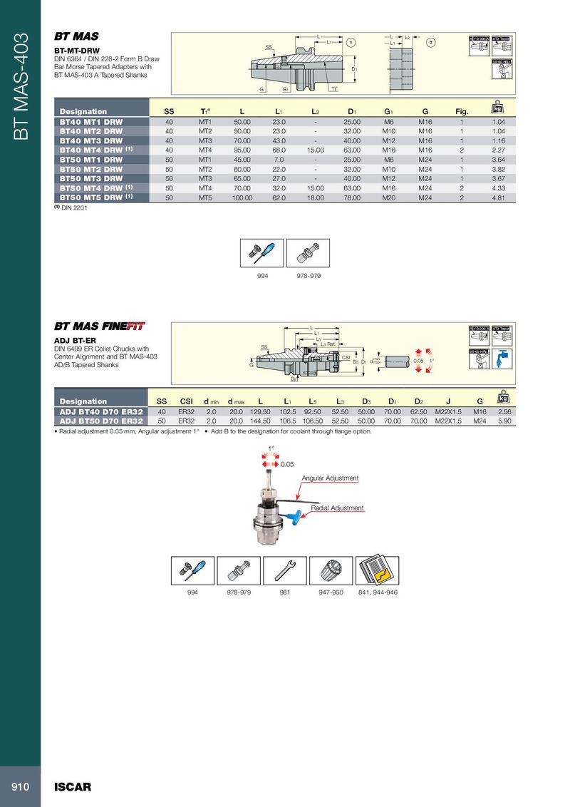 L L L 2 A 0.005 A AT3 Taper L 1 1 L 1 2 SS BT-MT-DRW DIN 6364 / DIN 228-2 Form B Draw 58-60 HRc Bar Morse Tapered Adapters with D 1 BT MAS-403 A Tapered Shanks G G 1 Tt˚ kg Designation SS T t ° L L 1 L 2 D 1 G 1 G Fig. BT40 MT1 DRW 40 MT1 50.00 23.0 - 25.00 M6 M16 1 1.04 BT40 MT2 DRW 40 MT2 50.00 23.0 - 32.00 M10 M16 1 1.04 BT MAS-403 BT40 MT3 DRW 40 MT3 70.00 43.0 - 40.00 M12 M16 1 1.16 BT40 MT4 DRW (1) 40 MT4 95.00 68.0 15.00 63.00 M16 M16 2 2.27 BT50 MT1 DRW 50 MT1 45.00 7.0 - 25.00 M6 M24 1 3.64 BT50 MT2 DRW 50 MT2 60.00 22.0 - 32.00 M10 M24 1 3.82 BT50 MT3 DRW 50 MT3 65.00 27.0 - 40.00 M12 M24 1 3.67 BT50 MT4 DRW (1) 50 MT4 70.00 32.0 15.00 63.00 M16 M24 2 4.33 BT50 MT5 DRW (1) 50 MT5 100.00 62.0 18.00 78.00 M20 M24 2 4.81 (1) DIN 2201 994 978-979 L A 0.003 A AT3 Taper L 1 ADJ BT-ER L 5 L 3 Ref . DIN 6499 ER Collet Chucks with SS 58-60 HRc Center Alignment and BT MAS-403 CSI D 3 D 1 d min max 0.05 1° AD/B Tapered Shanks G D 2 kg Designation SS CSI d min d max L L 1 L 5 L 3 D 3 D 1 D 2 J G ADJ BT40 D70 ER32 40 ER32 2.0 20.0 129.50 102.5 92.50 52.50 50.00 70.00 62.50 M22X1.5 M16 2.56 ADJ BT50 D70 ER32 50 ER32 2.0 20.0 144.50 106.5 106.50 52.50 50.00 70.00 70.00 M22X1.5 M24 5.90 • Radial adjustment 0.05 mm, Angular adjustment 1° • Add B to the designation for coolant through flange option. 1° 0.05 Angular Adjustment Radial Adjustment 994 978-979 981 947-950 841, 944-946 910 ISCAR