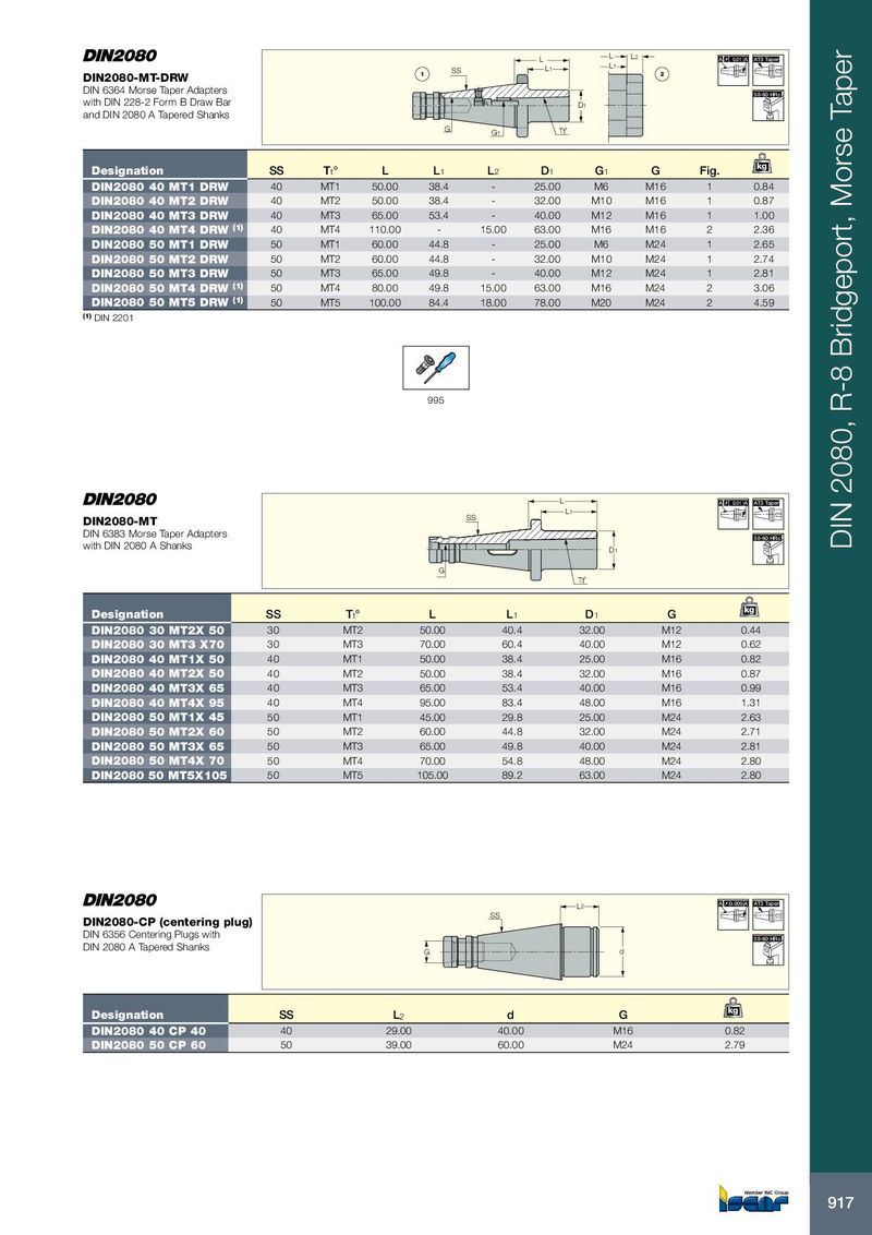 L L L 2 A 0.01 A AT3 Taper L 1 L 1 1 SS 2 DIN2080-MT-DRW DIN 6364 Morse Taper Adapters 58-60 HRc with DIN 228-2 Form B Draw Bar D 1 and DIN 2080 A Tapered Shanks G G 1 Tt˚ kg Designation SS T t ° L L 1 L 2 D 1 G 1 G Fig. DIN2080 40 MT1 DRW 40 MT1 50.00 38.4 - 25.00 M6 M16 1 0.84 DIN2080 40 MT2 DRW 40 MT2 50.00 38.4 - 32.00 M10 M16 1 0.87 DIN2080 40 MT3 DRW 40 MT3 65.00 53.4 - 40.00 M12 M16 1 1.00 DIN2080 40 MT4 DRW (1) 40 MT4 110.00 - 15.00 63.00 M16 M16 2 2.36 DIN2080 50 MT1 DRW 50 MT1 60.00 44.8 - 25.00 M6 M24 1 2.65 DIN2080 50 MT2 DRW 50 MT2 60.00 44.8 - 32.00 M10 M24 1 2.74 DIN2080 50 MT3 DRW 50 MT3 65.00 49.8 - 40.00 M12 M24 1 2.81 DIN2080 50 MT4 DRW (1) 50 MT4 80.00 49.8 15.00 63.00 M16 M24 2 3.06 DIN2080 50 MT5 DRW (1) 50 MT5 100.00 84.4 18.00 78.00 M20 M24 2 4.59 (1) DIN 2201 995 L A 0.01 A AT3 Taper L 1 SS DIN2080-MT DIN 6383 Morse Taper Adapters 58-60 HRc with DIN 2080 A Shanks D 1 DIN 2080, R-8 Bridgeport, Morse Taper G Tt˚ kg Designation SS T t ° L L 1 D 1 G DIN2080 30 MT2X 50 30 MT2 50.00 40.4 32.00 M12 0.44 DIN2080 30 MT3 X70 30 MT3 70.00 60.4 40.00 M12 0.62 DIN2080 40 MT1X 50 40 MT1 50.00 38.4 25.00 M16 0.82 DIN2080 40 MT2X 50 40 MT2 50.00 38.4 32.00 M16 0.87 DIN2080 40 MT3X 65 40 MT3 65.00 53.4 40.00 M16 0.99 DIN2080 40 MT4X 95 40 MT4 95.00 83.4 48.00 M16 1.31 DIN2080 50 MT1X 45 50 MT1 45.00 29.8 25.00 M24 2.63 DIN2080 50 MT2X 60 50 MT2 60.00 44.8 32.00 M24 2.71 DIN2080 50 MT3X 65 50 MT3 65.00 49.8 40.00 M24 2.81 DIN2080 50 MT4X 70 50 MT4 70.00 54.8 48.00 M24 2.80 DIN2080 50 MT5X105 50 MT5 105.00 89.2 63.00 M24 2.80 L 2 A 0.005 A AT3 Taper SS DIN2080-CP (centering plug) DIN 6356 Centering Plugs with 58-60 HRc DIN 2080 A Tapered Shanks G d kg Designation SS L 2 d G DIN2080 40 CP 40 40 29.00 40.00 M16 0.82 DIN2080 50 CP 60 50 39.00 60.00 M24 2.79 917