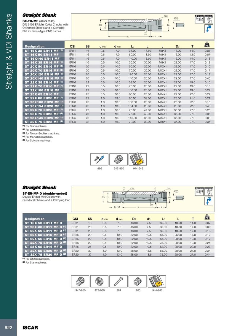 CSI A 0.005 A 58-60 HRc d min max ST-ER-MF (mini flat) DIN 6499 ER Mini Collet Chucks with SS D 3 Cylindrical Shanks and a Clamping J Flat for Swiss-Type CNC Lathes T L 2 L kg Designation CSI SS d min d max L 2 L J D 3 T ST 16X 38 ER11 MF (1) ER11 16 0.5 7.0 38.00 18.50 M8X1 16.00 14.0 0.05 ST 16X 50 ER11 MF ER11 16 0.5 7.0 50.00 18.50 M8X1 16.00 13.0 0.07 ST 16X140 ER11 MF ER11 16 0.5 7.0 140.00 18.50 M8X1 16.00 14.0 0.18 ST 16X 35 ER16 MF (1) ER16 16 0.5 10.0 35.00 36.00 M8X1 22.00 17.0 0.12 ST 20X 50 ER16 MF (2) ER16 20 0.5 10.0 50.00 26.00 M12X1 22.00 17.0 0.10 ST 20X 70 ER16 MF (2) ER16 20 0.5 10.0 70.00 26.00 M12X1 22.00 17.0 0.17 ST 20X120 ER16 MF (2) ER16 20 0.5 10.0 120.00 26.00 M12X1 22.00 17.0 0.19 ST 20X140 ER16 MF (2) ER16 20 0.5 10.0 140.00 26.00 M12X1 22.00 17.0 0.40 ST 22X 38 ER16 MF (1) ER16 22 0.5 10.0 38.00 26.00 M12X1 22.00 19.0 0.10 ST 22X 70 ER16 MF (1) ER16 22 0.5 10.0 70.00 26.00 M12X1 22.00 19.0 0.16 Straight & VDI Shanks ST 22X100 ER16 MF (1) ER16 22 0.5 10.0 100.00 28.00 M12X1 22.00 19.0 0.27 ST 25X 65 ER16 MF ER16 25 0.5 10.0 65.00 28.00 M14X1 22.00 22.0 0.22 ST 22X 80 ER20 MF (1) ER20 22 1.0 13.0 80.00 39.00 M12X1 28.00 21.0 0.21 ST 25X100 ER20 MF (3) ER20 25 1.0 13.0 100.00 28.00 M14X1 28.00 22.0 0.15 ST 25X154 ER20 MF (3) ER20 25 1.0 13.0 154.00 28.00 M14X1 28.00 22.0 0.40 ST 22X 70 ER25 MF (1) ER25 22 1.0 16.0 70.00 47.00 M12X1 35.00 27.0 0.25 ST 25X 75 ER25 MF (4) ER25 25 1.0 16.0 75.00 48.00 M14X1 35.00 27.0 0.36 ST 25X145 ER25 MF (3) ER25 25 1.0 16.0 145.00 36.00 M14X1 35.00 27.0 0.08 ST 32X 70 ER25 MF (5) ER25 32 1.0 16.0 70.00 30.00 M18X1 35.00 27.0 0.35 (1) For Star machines. (2) For Citizen machines. (3) For Tornos-Bechler machines. (4) For Manurhin machines. (5) For Schutte machines. 996 947-950 944-946 T CSI T CSI A 0.005 A 58-60 HRc d min max ST-ER-MF-D (double-ended) Double-Ended Mini Collets with SS D 3 D 3 Cylindrical Shanks and a Clamping Flat d 5 L 3 Ref L 2 L kg Designation CSI SS d min d max D 3 d 5 L 2 L T ST 16X 50 ER11 MF D ER11 16 0.5 7.0 16.00 7.5 50.00 18.50 14.0 0.07 ST 20X 30 ER11 MF D (1) ER11 20 0.5 7.0 16.00 7.5 30.00 18.50 17.0 0.09 ST 20X 50 ER11 MF D (1) ER11 20 0.5 7.0 16.00 7.5 50.00 18.50 17.0 0.13 ST 20X 55 ER16 MF D (1) ER16 20 0.5 10.0 22.00 10.5 55.00 25.00 17.0 0.12 ST 22X 55 ER16 MF D (2) ER16 22 0.5 10.0 22.00 10.5 55.00 28.00 19.0 0.17 ST 22X 75 ER16 MF D (2) ER16 22 0.5 10.0 22.00 10.5 75.00 28.00 19.0 0.21 ST 25X 62 ER16 MF D ER16 25 0.5 10.0 22.00 10.5 62.00 28.00 22.0 0.23 ST 32X 55 ER20 MF D (2) ER20 32 1.0 13.0 28.00 13.5 55.00 28.00 27.0 0.34 ST 32X 75 ER20 MF D (2) ER20 32 1.0 13.0 28.00 13.5 75.00 28.00 27.0 0.44 (1) For Citizen machines. (2) For Star machines. 947-950 979-980 981 980 944-946 922 ISCAR