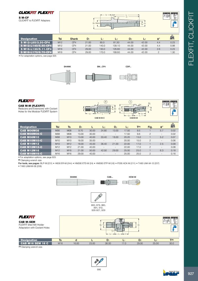 A 0.005 A 58-60 HRc L 2 8 L S M-CF a° L 1 CLICKFIT to FLEXFIT Adapters D 3 Shank Tsi D 2 kg Designation Tsi Shank D 1 L 1 L 3 D 3 L 2 a° S M12-L85/3.30-CF4 M12 CF4 21.00 85.0 81.30 44.00 42.00 4.4 0.23 S M12-L140/5.50-CF4 M12 CF4 21.00 140.0 139.10 44.00 42.00 4.4 0.98 S M16-L130/5.11-CF4 M16 CF4 29.00 130.0 126.80 44.00 42.00 2.6 0.23 S M16-L170/6.70-CF4 M16 CF4 29.00 170.0 168.60 44.00 42.00 2 1.30 • For adaptation options, see page 925 FLEXFIT, CLICKFIT SHANK SM...CF4 CDP... 2 1 A 0.005 A 58-60 HRc T D 2 a ° CAB M-M (FLEXFIT) Reducers and Extensions with Coolant Ts Tsi D2 D 3 Ts Tsi Holes for the Modular FLEXFIT System L 2 L T L 3 L 2 L CAB M-M-C CAB M-M kg Designation Tsi Ts D 1 L L 3 D 3 L 2 T (1) Fig. a° CAB M06M08 M06 M08 9.70 30.00 24.80 13.00 17.50 9.5 1 5.7 0.02 CAB M08M08-C M08 M08 13.00 30.00 - - 17.50 9.6 2 - 0.02 CAB M08M10 M08 M10 13.00 40.00 33.40 18.00 20.20 15.0 1 5.2 0.07 CAB M10M10-C M10 M10 18.00 35.00 - - 20.00 15.0 2 - 0.06 CAB M10M12 M10 M12 18.00 45.00 36.40 21.00 22.00 17.0 1 2.5 0.09 CAB M12M12-C M12 M12 21.00 40.00 - - 22.00 17.0 2 - 0.08 CAB M12M16 M12 M16 21.00 50.00 42.50 29.00 25.00 25.0 1 6.3 0.18 CAB M16M16-C M16 M16 29.00 40.00 - - 25.00 25.0 2 - 0.16 • For adaptation options, see page 925 (1) Clamping wrench size For tools, see pages: BLP-M (231) • H606 ER-M (244) • HM390 ETD-M (24) • HM390 ETP-M (18) • P290 ACK-M (211) • T490 LNK-M-13 (207) • T490 LNM-M-08 (206) SHANK CAB... HCM-M SHANK S M...-CF4 CDP 860, 879, 880, 891, 912, 926-927, 929 A 0.005 A 58-60 HRc CAB M-SEM FLEXFIT Shell Mill Holder D2 Ts d D1 Adaptation with Coolant Holes T L2 L L1 Designation Ts d L D 1 L 1 D 2 L 2 T (1) CAB M16 SEM 16 C M16 16.00 23.00 38.00 17.0 29.00 25.00 30.0 (1) Clamping wrench size 996 927