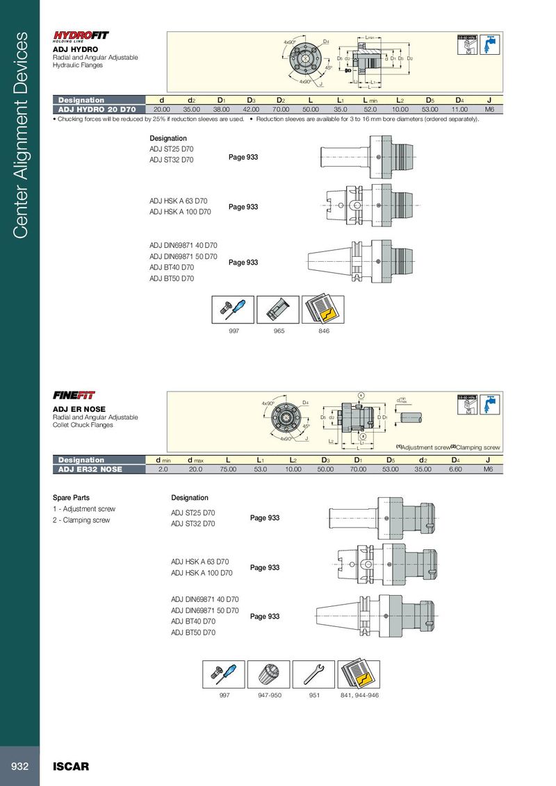 Lmin 58-60 HRc 4x90º D4 ADJ HYDRO Radial and Angular Adjustable D5 d2 d D1 D3 D2 Hydraulic Flanges 45º 4x90º J L2 L1 L Designation d d 2 D 1 D 3 D 2 L L 1 L min L 2 D 5 D 4 J ADJ HYDRO 20 D70 20.00 35.00 38.00 42.00 70.00 50.00 35.0 52.0 10.00 53.00 11.00 M6 • Chucking forces will be reduced by 25% if reduction sleeves are used. • Reduction sleeves are available for 3 to 16 mm bore diameters (ordered separately). Designation ADJ ST25 D70 ADJ ST32 D70 Page 933 ADJ HSK A 63 D70 Page 933 ADJ HSK A 100 D70 Center Alignment Devices ADJ DIN69871 40 D70 ADJ DIN69871 50 D70 Page 933 ADJ BT40 D70 ADJ BT50 D70 997 965 846 1 58-60 HRc d min 4x90º D4 max ADJ ER NOSE Radial and Angular Adjustable D5 d2 D D1 Collet Chuck Flanges 45º J 2 4x90º L2 L1 L (1) Adjustment screw (2) Clamping screw Designation d min d max L L 1 L 2 D 3 D 1 D 5 d 2 D 4 J ADJ ER32 NOSE 2.0 20.0 75.00 53.0 10.00 50.00 70.00 53.00 35.00 6.60 M6 Spare Parts Designation 1 - Adjustment screw ADJ ST25 D70 2 - Clamping screw Page 933 ADJ ST32 D70 ADJ HSK A 63 D70 Page 933 ADJ HSK A 100 D70 ADJ DIN69871 40 D70 ADJ DIN69871 50 D70 Page 933 ADJ BT40 D70 ADJ BT50 D70 997 947-950 951 841, 944-946 932 ISCAR