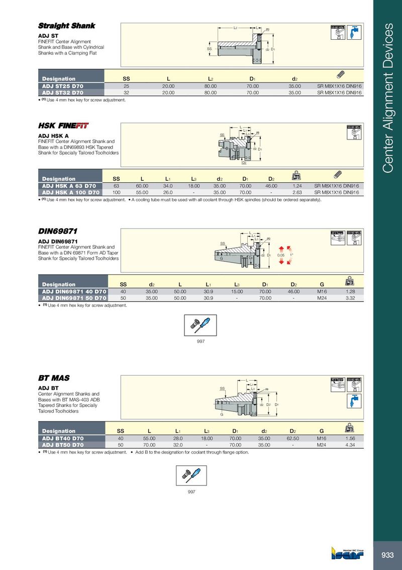 L 2 L (1) 58-60 HRc ADJ ST FINEFIT Center Alignment Shank and Base with Cylindrical SS d 2 D 1 Shanks with a Clamping Flat Designation SS L L 2 D 1 d 2 ADJ ST25 D70 25 20.00 80.00 70.00 35.00 SR M8X1X16 DIN916 ADJ ST32 D70 32 20.00 80.00 70.00 35.00 SR M8X1X16 DIN916 • (1) Use 4 mm hex key for screw adjustment. L 58-60 HRc L1 (1) ADJ HSK A SS L3 FINEFIT Center Alignment Shank and Base with a DIN69893 HSK Tapered d2 D1 Shank for Specially Tailored Toolholders D2 Center Alignment Devices kg Designation SS L L 1 L 3 d 2 D 1 D 2 ADJ HSK A 63 D70 63 60.00 34.0 18.00 35.00 70.00 46.00 1.24 SR M8X1X16 DIN916 ADJ HSK A 100 D70 100 55.00 26.0 - 35.00 70.00 - 2.63 SR M8X1X16 DIN916 • (1) Use 4 mm hex key for screw adjustment. • A cooling tube must be used with all coolant through HSK spindles (should be ordered separately). L AT3 Taper 58-60 HRc L1 L3 (1) ADJ DIN69871 SS FINEFIT Center Alignment Shank and Base with a DIN 69871 Form AD Taper d2 D1 0.05 1° Shank for Specially Tailored Toolholders G D2 kg Designation SS d 2 L L 1 L 3 D 1 D 2 G ADJ DIN69871 40 D70 40 35.00 50.00 30.9 15.00 70.00 46.00 M16 1.28 ADJ DIN69871 50 D70 50 35.00 50.00 30.9 - 70.00 - M24 3.32 • (1) Use 4 mm hex key for screw adjustment. 997 L AT3 Taper 58-60 HRc L1 ADJ BT SS L 3 (1) Center Alignment Shanks and Bases with BT MAS-403 ADB Tapered Shanks for Specially d 2 D 2 D 1 Tailored Toolholders G kg Designation SS L L 1 L 3 D 1 d 2 D 2 G ADJ BT40 D70 40 55.00 28.0 18.00 70.00 35.00 62.50 M16 1.56 ADJ BT50 D70 50 70.00 32.0 - 70.00 35.00 - M24 4.34 • (1) Use 4 mm hex key for screw adjustment. • Add B to the designation for coolant through flange option. 997 933