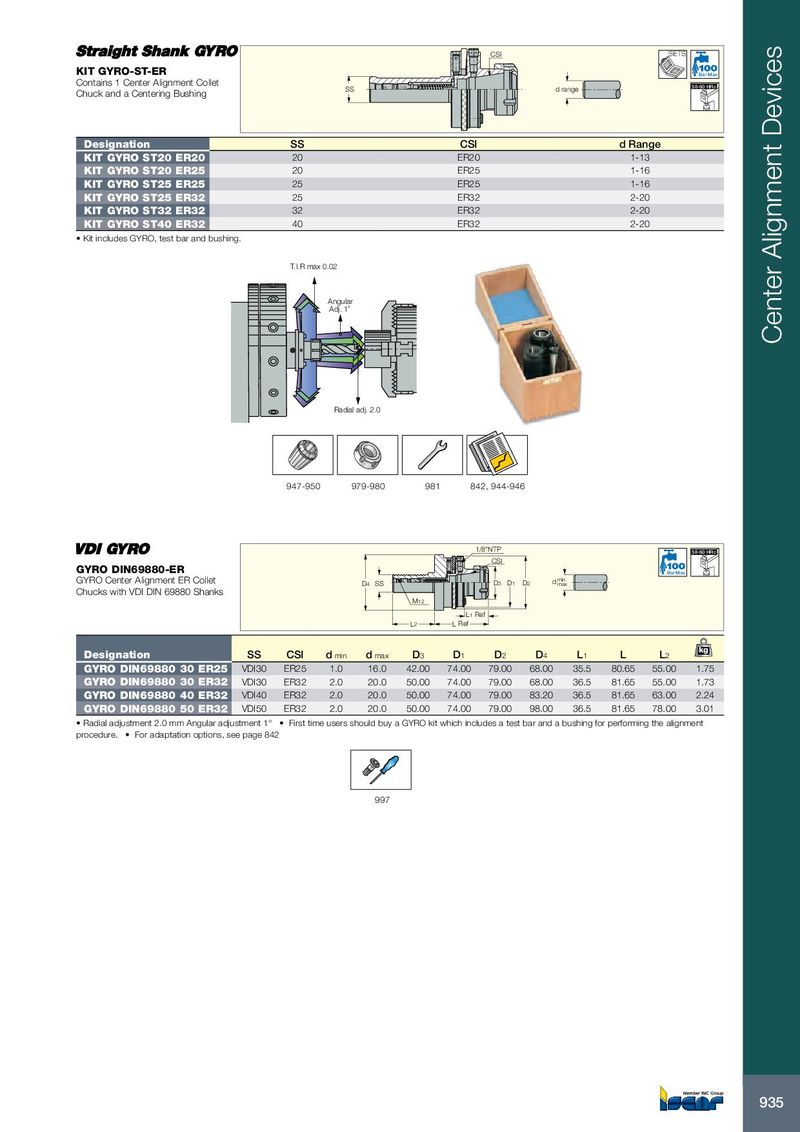 CSI SETS KIT GYRO-ST-ER Bar Max Contains 1 Center Alignment Collet SS d range 58-60 HRc Chuck and a Centering Bushing Designation SS CSI d Range KIT GYRO ST20 ER20 20 ER20 1-13 KIT GYRO ST20 ER25 20 ER25 1-16 KIT GYRO ST25 ER25 25 ER25 1-16 KIT GYRO ST25 ER32 25 ER32 2-20 KIT GYRO ST32 ER32 32 ER32 2-20 KIT GYRO ST40 ER32 40 ER32 2-20 • Kit includes GYRO, test bar and bushing. T.I.R max 0.02 Angular Adj. 1˚ Center Alignment Devices Radial adj. 2.0 947-950 979-980 981 842, 944-946 1/8”NTP 58-60 HRc CSI GYRO DIN69880-ER Bar Max GYRO Center Alignment ER Collet D 4 SS D 3 D 1 D 2 d min max Chucks with VDI DIN 69880 Shanks M12 L 1 Ref L 2 L Ref kg Designation SS CSI d min d max D 3 D 1 D 2 D 4 L 1 L L 2 GYRO DIN69880 30 ER25 VDI30 ER25 1.0 16.0 42.00 74.00 79.00 68.00 35.5 80.65 55.00 1.75 GYRO DIN69880 30 ER32 VDI30 ER32 2.0 20.0 50.00 74.00 79.00 68.00 36.5 81.65 55.00 1.73 GYRO DIN69880 40 ER32 VDI40 ER32 2.0 20.0 50.00 74.00 79.00 83.20 36.5 81.65 63.00 2.24 GYRO DIN69880 50 ER32 VDI50 ER32 2.0 20.0 50.00 74.00 79.00 98.00 36.5 81.65 78.00 3.01 • Radial adjustment 2.0 mm Angular adjustment 1° • First time users should buy a GYRO kit which includes a test bar and a bushing for performing the alignment procedure. • For adaptation options, see page 842 997 935
