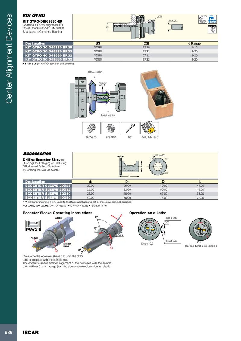 CSI SETS d range KIT GYRO-DIN69880-ER Bar Max Contains 1 Center Alignment ER SS 58-60 HRc Collet Chuck with VDI DIN 69880 Shank and a Centering Bushing Designation SS CSI d Range KIT GYRO 30 D69880 ER25 VDI30 ER25 1-16 KIT GYRO 30 D69880 ER32 VDI30 ER32 2-20 KIT GYRO 40 D69880 ER32 VDI40 ER32 2-20 KIT GYRO 50 D69880 ER32 VDI50 ER32 2-20 • Kit includes: GYRO, test bar and bushing. T.I.R max 0.02 Angular Adj. 1˚ Center Alignment Devices Radial adj. 2.0 947-950 979-980 981 842, 944-946 (1) 5 3 typ.x2 D 1 Drilling Eccenter Sleeves Bushings for Enlarging or Reducing DR Nominal Drilling Diameters D 3 by Shifting the Drill Off-Center d2 L Designation d 2 D 3 D 1 L ECCENTER SLEEVE 20X25 20.00 25.00 40.00 44.00 ECCENTER SLEEVE 25X32 25.00 32.00 50.00 46.00 ECCENTER SLEEVE 32X40 32.00 40.00 65.00 55.00 ECCENTER SLEEVE 40X50 40.00 50.00 75.00 77.00 • (1) Holes for inserting a pin, used to facilitate radial adjustment of the sleeve (pin not supplied) For tools, see pages: DR-3D-N (522) • DR-4D-N (523) • GD-DH (649) Eccenter Sleeve Operating Instructions Operation on a Lathe Adapter 0.0 Tool’s axis +4 0 -4 -8 +0.4 +8 +8 M +12 L 0.2 0 +0.2 +4 +0.2 90 LATHE +0.4 0 X.001” 0 0 +16 +0.2 -0.2 L +0.2 0 +0.2 M DR-Drill -0.2 L M Turret axis L Dnom Eccenter Dnom+0.2 Sleeve Tool and turret axes coincide L L +0.2 0 On a lathe the eccenter sleeve can shift the drill’s axis to coincide with the spindle axis. The eccentric sleeve enables alignment of the drill’s axis with the spindle axis within a 0.2 mm range (turn the sleeve counterclockwise to raise it). 936 ISCAR