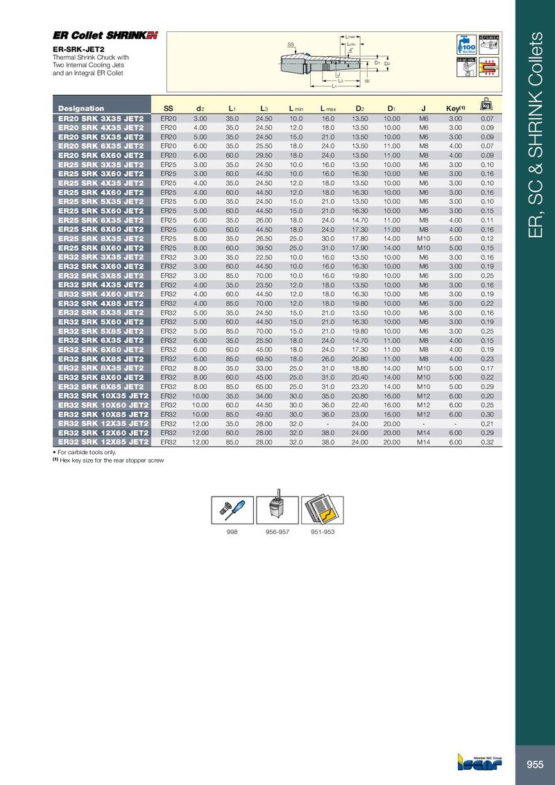 L max A 0.003 A SS L min ER-SRK-JET2 4˚ Bar Max Thermal Shrink Chuck with 58-60 HRc Two Internal Cooling Jets D 1 D 2 and an Integral ER Collet J L 3 d 2 L 1 kg Designation SS d 2 L 1 L 3 L min L max D 2 D 1 J Key (1) ER20 SRK 3X35 JET2 ER20 3.00 35.0 24.50 10.0 16.0 13.50 10.00 M6 3.00 0.07 ER20 SRK 4X35 JET2 ER20 4.00 35.0 24.50 12.0 18.0 13.50 10.00 M6 3.00 0.09 ER20 SRK 5X35 JET2 ER20 5.00 35.0 24.50 15.0 21.0 13.50 10.00 M6 3.00 0.09 ER20 SRK 6X35 JET2 ER20 6.00 35.0 25.50 18.0 24.0 13.50 11.00 M8 4.00 0.07 ER20 SRK 6X60 JET2 ER20 6.00 60.0 29.50 18.0 24.0 13.50 11.00 M8 4.00 0.09 ER25 SRK 3X35 JET2 ER25 3.00 35.0 24.50 10.0 16.0 13.50 10.00 M6 3.00 0.10 ER25 SRK 3X60 JET2 ER25 3.00 60.0 44.50 10.0 16.0 16.30 10.00 M6 3.00 0.16 ER25 SRK 4X35 JET2 ER25 4.00 35.0 24.50 12.0 18.0 13.50 10.00 M6 3.00 0.10 ER25 SRK 4X60 JET2 ER25 4.00 60.0 44.50 12.0 18.0 16.30 10.00 M6 3.00 0.16 ER25 SRK 5X35 JET2 ER25 5.00 35.0 24.50 15.0 21.0 13.50 10.00 M6 3.00 0.10 ER25 SRK 5X60 JET2 ER25 5.00 60.0 44.50 15.0 21.0 16.30 10.00 M6 3.00 0.15 ER25 SRK 6X35 JET2 ER25 6.00 35.0 26.00 18.0 24.0 14.70 11.00 M8 4.00 0.11 ER25 SRK 6X60 JET2 ER25 6.00 60.0 44.50 18.0 24.0 17.30 11.00 M8 4.00 0.16 ER25 SRK 8X35 JET2 ER25 8.00 35.0 26.50 25.0 30.0 17.80 14.00 M10 5.00 0.12 ER, SC & SHRINK Collets ER25 SRK 8X60 JET2 ER25 8.00 60.0 39.50 25.0 31.0 17.90 14.00 M10 5.00 0.15 ER32 SRK 3X35 JET2 ER32 3.00 35.0 22.50 10.0 16.0 13.50 10.00 M6 3.00 0.16 ER32 SRK 3X60 JET2 ER32 3.00 60.0 44.50 10.0 16.0 16.30 10.00 M6 3.00 0.19 ER32 SRK 3X85 JET2 ER32 3.00 85.0 70.00 10.0 16.0 19.80 10.00 M6 3.00 0.25 ER32 SRK 4X35 JET2 ER32 4.00 35.0 23.50 12.0 18.0 13.50 10.00 M6 3.00 0.16 ER32 SRK 4X60 JET2 ER32 4.00 60.0 44.50 12.0 18.0 16.30 10.00 M6 3.00 0.19 ER32 SRK 4X85 JET2 ER32 4.00 85.0 70.00 12.0 18.0 19.80 10.00 M6 3.00 0.22 ER32 SRK 5X35 JET2 ER32 5.00 35.0 24.50 15.0 21.0 13.50 10.00 M6 3.00 0.16 ER32 SRK 5X60 JET2 ER32 5.00 60.0 44.50 15.0 21.0 16.30 10.00 M6 3.00 0.19 ER32 SRK 5X85 JET2 ER32 5.00 85.0 70.00 15.0 21.0 19.80 10.00 M6 3.00 0.25 ER32 SRK 6X35 JET2 ER32 6.00 35.0 25.50 18.0 24.0 14.70 11.00 M8 4.00 0.15 ER32 SRK 6X60 JET2 ER32 6.00 60.0 45.00 18.0 24.0 17.30 11.00 M8 4.00 0.19 ER32 SRK 6X85 JET2 ER32 6.00 85.0 69.50 18.0 26.0 20.80 11.00 M8 4.00 0.23 ER32 SRK 8X35 JET2 ER32 8.00 35.0 33.00 25.0 31.0 18.80 14.00 M10 5.00 0.17 ER32 SRK 8X60 JET2 ER32 8.00 60.0 45.00 25.0 31.0 20.40 14.00 M10 5.00 0.22 ER32 SRK 8X85 JET2 ER32 8.00 85.0 65.00 25.0 31.0 23.20 14.00 M10 5.00 0.29 ER32 SRK 10X35 JET2 ER32 10.00 35.0 34.00 30.0 35.0 20.80 16.00 M12 6.00 0.20 ER32 SRK 10X60 JET2 ER32 10.00 60.0 44.50 30.0 36.0 22.40 16.00 M12 6.00 0.25 ER32 SRK 10X85 JET2 ER32 10.00 85.0 49.50 30.0 36.0 23.00 16.00 M12 6.00 0.30 ER32 SRK 12X35 JET2 ER32 12.00 35.0 28.00 32.0 - 24.00 20.00 - - 0.21 ER32 SRK 12X60 JET2 ER32 12.00 60.0 28.00 32.0 38.0 24.00 20.00 M14 6.00 0.29 ER32 SRK 12X85 JET2 ER32 12.00 85.0 28.00 32.0 38.0 24.00 20.00 M14 6.00 0.32 • For carbide tools only. (1) Hex key size for the rear stopper screw 998 956-957 951-953 955