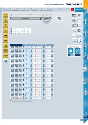 Инструменты для композитов 1 Твердосплавная однозубая концевая фреза Левосторонняя спираль – правозаходная, скользящее резаниеSolid carbide one-tooth end mill, left spiral – right cutting, pushing cut (down cut)2299 11665544 Акрил MICRO KARNASCH Acrylic GRAIN NORM Z 2 1 Специ- DIN 6535 PMMA альный Form HA GS Gelapt SPECIAL PE L -R PP 30° d1* = ≤ 3,0 tol -0,000 / -0,040PAd1*= 4,0 - 6,0tol -0,000 / -0,048 HSC 3High-Speed-Cutting d1* = 8,0 - 10,0 tol -0,000 / -0,058 SAN притёртая ABS 4 PCPET Art. d1* l2 d2 h6 l3 l1 Z €PPE299 11654 00100 0040 0330 04400I1,043–40131,00299 11654 00150 0060 0330 04400I1,563–40131,00Параметры резкиРисункиCutting dataDrawings PMMA 299 11654 00200 0030 0330 05500 I 2,0299 11654 00200 0060 0660 05500I2,03366–501 33,00–50135,00 XT 299 11654 00200 0080 0330 04400 I 2,0 8 3 – 40 1 37,00 299 11654 00300 0040 0330 05500 I 3,0 4 3 – 50 1 33,00 5 299 11654 00300 0060 0330 05500 I 3,0 6 3 – 50 1 33,00 MAKROLON 299 11654 00300 1100 0330 03300 I 3,0 10 3 – 30 1 34,00 1337 DXF/STEP 299 11654 00300 1100 0330 06600 I 3,0 10 3 – 60 1 35,00 299 11654 00300 1120 0660 05500 I 3,0 12 6 – 50 1 40,00 299 11654 00300 1150 0880 07755 I 3,0 15 8 – 75 1 50,00 воск 299 11654 00300 1180 0881 10000 I 3,0 18 8 – 100 1 57,00 Wax 299 11654 00400 0050 0440 05500 I 4,0 5 4 – 50 1 36,00 299 11654 00400 0080 0440 04400 I 4,0 8 4 – 40 1 36,00 299 11654 00400 1140 0660 05500 I 4,0 14 6 – 50 1 39,00299 11654 00400 1180 0880 07755I4,0188–75148,00 6 299 11654 00400 2200 0440 06600 I 4,0 20 4 – 60 1 38,00 299 11654 00400 2220 0881 10000 I 4,0 22 8 – 100 1 60,00 299 11654 00500 0060 0660 05500 I 5,0 6 6 – 50 1 41,00 299 11654 00500 1100 0660 04400 I 5,0 10 6 – 40 1 42,00 299 11654 00500 1160 0660 05500 I 5,0 16 6 – 50 1 42,00 299 11654 00500 2220 0660 06600 I 5,0 22 6 – 60 1 43,00 299 11654 00500 2250 0880 07755 I 5,0 25 8 – 75 1 49,00 299 11654 00500 2250 0881 10000 I 5,0 25 8 – 100 1 60,00 299 11654 00500 3300 0660 07700 I 5,0 30 6 – 70 1 44,00 7 299 11654 00600 0070 0660 05500 I 6,0 7 6 – 50 1 37,00 299 11654 00600 1180 0660 05500 I 6,0 18 6 – 50 1 37,00 MAC 299 11654 00600 2200 0660 06600 I 6,0 20 6 – 60 1 39,00 299 11654 00600 2200 0661 10000 I 6,0 20 6 40 100 1 40,00 299 11654 00600 2250 0660 06655 I 6,0 25 6 – 65 1 41,00 299 11654 00600 2250 0880 07755 I 6,0 25 8 – 75 1 48,00 299 11654 00600 4400 0660 08800 I 6,0 40 6 – 80 1 42,00 299 11654 00600 3300 0881 10000 I 6,0 30 8 – 100 1 55,00 299 11654 00800 1100 0880 05500 I 8,0 10 8 – 50 1 52,00299 11654 00800 2200 0880 05500I8,0208–50155,00 8 299 11654 00800 2200 0880 06600 I 8,0 20 8 – 60 1 56,00 299 11654 00800 2200 0881 10000 I 8,0 20 8 40 100 1 65,00 299 11654 00800 3350 0881 10000 I 8,0 35 8 – 100 1 70,00 OIL 299 11654 11000 2251 1000 07700 I 10,0 25 10 – 70 1 72,00 299 11654 11000 2251 1001 12200 I 10,0 25 10 50 120 1 89,00 299 11654 11000 332 % 10,0 32 10 – 75 1 48,00 299 11654 11000 3351 1000 09900 I 10,0 35 10 – 90 1 81,00 % Специальная цена / продажа статьи. Доступно, пока есть в наличии.Special price / sale article. While stocks last. 9 10 Index 195 HINES