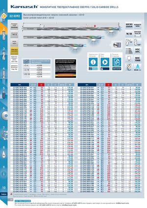 МОНОЛИТНОЕ ТВЕРДОСПЛАВНОЕ СВЕРЛО / SOLID CARBIDE DRILLS 1 2222 00339922 Высокопроизводительное сверло сквозной закалки < 40×DSolid carbide twist drill < 40×D Алюми-нийAluminium l1 l2 MICRO KARNASCHПолезная длина / Effective lengthGRAINNORM 2 d2 d1 алюминий< 6% Si Gelapt DIN 6535W/MForm HA медиcopper Gelapt 15°Z2 137° 3 CFK-ALU Gelapt HSC композиты HPC Параметры резки Видео Рисунки коротко- Cutting data Movie Drawings стружеч- ногоshort chip h7 Допуск на диаметр отверстияHole tolerance С заданными параметрами закругления краевWith a defined edge preparation дающего > 3-6 +0,000 4 длинную long chip> 6-10–0,012+0,000 1314 DXF/STEP бар –0,015 >10-18 +0,000 –0,018 Art. d1 h7 l3 l2 l1 d2 h6 € Art. d1 h7 l3 l2 l1 d2 h6 € 5 2222 039922 06200 066 I 6,2 66 76 114 8 170,00 2222 039922 07300 041 I 7,3 41 53 90 8 90,002222 039922 06200 096I6,2961081468223,002222 039922 07300 064I7,364761148170,00 2222 039922 06300 043 I 6,3 43 53 90 8 90,00 2222 039922 07300 096 I 7,3 96 108 146 8 223,00 2222 039922 06300 066 I 6,3 66 76 114 8 170,00 2222 039922 07400 041 I 7,4 41 53 90 8 90,00 2222 039922 06300 096 I 6,3 96 108 146 8 223,00 2222 039922 07400 064 I 7,4 64 76 114 8 170,00 2222 039922 06400 043 I 6,4 43 53 90 8 90,00 2222 039922 07400 096 I 7,4 96 108 146 8 223,00 2222 039922 06400 066 I 6,4 66 76 114 8 170,00 2222 039922 07500 041 I 7,5 41 53 90 8 90,00 2222 039922 06400 096 I 6,4 96 108 146 8 223,00 2222 039922 07500 064 I 7,5 64 76 114 8 170,00 2222 039922 06500 043 I 6,5 43 53 90 8 90,00 2222 039922 07500 096 I 7,5 96 108 146 8 223,00 2222 039922 06500 066 I 6,5 66 76 114 8 170,00 2222 039922 07500 113 % 7,5 113 128 165 8 128,40 6 2222 039922 06500 096 I 6,5 96 108 146 8 223,00 2222 039922 07500 128 I 7,5 128 140 180 8 270,002222 039922 06500 114I6,51141251658226,002222 039922 07500 150% 7,51501652108168,00 2222 039922 06500 130 % 6,5 130 143 185 8 137,40 2222 039922 07500 168 I 7,5 168 180 230 8 301,00 2222 039922 06500 149 I 6,5 149 160 210 8 252,00 2222 039922 07500 188 % 7,5 188 203 255 8 199,20 2222 039922 06500 163 % 6,5 163 175 215 8 174,60 2222 039922 07500 208 I 7,5 208 220 260 8 349,00 2222 039922 06500 189 I 6,5 189 200 240 8 326,00 2222 039922 07500 219 I 7,5 219 230 280 8 357,00 2222 039922 06500 195 % 6,5 195 208 250 8 193,20 2222 039922 07500 225 % 7,5 225 240 280 8 220,80 2222 039922 06500 205 I 6,5 205 215 280 8 343,00 2222 039922 07600 041 I 7,6 41 53 90 8 90,00 2222 039922 06600 043 I 6,6 43 53 90 8 90,00 2222 039922 07600 064 I 7,6 64 76 114 8 170,00 2222 039922 06600 066 I 6,6 66 76 114 8 170,00 2222 039922 07600 096 I 7,6 96 108 146 8 223,00 7 2222 039922 06600 096 I 6,6 96 108 146 8 223,00 2222 039922 07700 041 I 7,7 41 53 90 8 90,002222 039922 06700 043I6,7435390890,002222 039922 07700 064I7,764761148170,00 2222 039922 06700 066 I 6,7 66 76 114 8 170,00 2222 039922 07700 096 I 7,7 96 108 146 8 223,00 NES 2222 039922 06700 096 I 6,7 96 108 146 8 223,00 2222 039922 07800 041 I 7,8 41 53 90 8 90,00 2222 039922 06800 043 I 6,8 43 53 90 8 90,00 2222 039922 07800 064 I 7,8 64 76 114 8 170,00 2222 039922 06800 066 I 6,8 66 76 114 8 170,00 2222 039922 07800 096 I 7,8 96 108 146 8 223,00 2222 039922 06800 096 I 6,8 96 108 146 8 223,00 2222 039922 07800 117 % 7,8 117 133 170 8 149,40 2222 039922 06800 102 % 6,8 102 115 160 8 131,40 2222 039922 07800 128 I 7,8 128 140 180 8 270,00 2222 039922 06800 114 I 6,8 114 125 165 8 226,00 2222 039922 07800 156 % 7,8 156 172 215 8 171,60 2222 039922 06800 136 % 6,8 136 149 195 8 149,40 2222 039922 07800 168 I 7,8 168 180 230 8 301,00 8 2222 039922 06800 149 I 6,8 149 160 210 8 270,00 2222 039922 07800 195 % 7,8 195 211 255 8 196,202222 039922 06800 170% 6,81701832308174,602222 039922 07800 208I7,82082202608349,00 2222 039922 06800 189 I 6,8 189 200 240 8 313,00 2222 039922 07800 234 % 7,8 234 250 315 8 224,40 2222 039922 06800 204 % 6,8 204 217 265 8 199,20 2222 039922 07800 253 I 7,8 253 265 315 8 398,00 2222 039922 06800 219 I 6,8 219 230 280 8 357,00 2222 039922 07900 041 I 7,9 41 53 90 8 90,00 OIL 2222 039922 06900 043 I 6,9 43 53 90 8 90,00 2222 039922 07900 064 I 7,9 64 76 114 8 170,00 2222 039922 06900 066 I 6,9 66 76 114 8 170,00 2222 039922 07900 096 I 7,9 96 108 146 8 223,00 2222 039922 06900 096 I 6,9 96 108 146 8 223,00 2222 039922 08000 041 I 8,0 41 53 90 8 90,00 2222 039922 07000 041 I 7,0 41 53 90 8 90,00 2222 039922 08000 064 I 8,0 64 76 114 8 170,00 2222 039922 07000 064 I 7,0 64 76 114 8 170,00 2222 039922 08000 096 I 8,0 96 108 146 8 223,00 9 2222 039922 07000 096 I 7,0 96 108 146 8 223,00 2222 039922 08000 120 % 8,0 120 136 180 8 157,202222 039922 07000 105% 7,01051191608131,402222 039922 08000 128I8,01281401808270,00 2222 039922 07000 114 I 7,0 114 125 165 8 226,00 2222 039922 08000 160 % 8,0 160 176 215 8 174,00 2222 039922 07000 140 % 7,0 140 154 195 8 156,00 2222 039922 08000 168 I 8,0 168 180 230 8 301,00 2222 039922 07000 149 I 7,0 149 160 210 8 270,00 2222 039922 08000 200 % 8,0 200 216 255 8 199,20 2222 039922 07000 175 % 7,0 175 189 230 8 174,60 2222 039922 08000 208 I 8,0 208 220 260 8 349,00 2222 039922 07000 189 I 7,0 189 200 240 8 313,00 2222 039922 08000 240 % 8,0 240 256 315 8 224,40 2222 039922 07000 219 I 7,0 219 230 280 8 357,00 2222 039922 08000 253 I 8,0 253 265 315 8 398,00 2222 039922 07100 041 I 7,1 41 53 90 8 90,00 2222 039922 08100 046 I 8,1 46 61 103 10 106,00 2222 039922 07100 064 I 7,1 64 76 114 8 170,00 2222 039922 08100 080 I 8,1 80 95 142 10 215,00 2222 039922 07100 096 I 7,1 96 108 146 8 223,00 2222 039922 08100 106 I 8,1 106 120 162 10 282,00 10 2222 039922 07200 041 I 7,2 41 53 90 8 90,00 2222 039922 08200 046 I 8,2 46 61 103 10 106,00 2222 039922 07200 064 I 7,2 64 76 114 8 170,00 2222 039922 08200 080 I 8,2 80 95 142 10 215,00 2222 039922 07200 