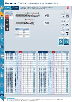 МОНОЛИТНОЕ ТВЕРДОСПЛАВНОЕ СВЕРЛО / SOLID CARBIDE DRILLS 1 2222 00880066 Монолитное твердосплавное сверло с внутренним охлаждениемSolid carbide twist drill with interior cooling supply сталь HRCsteel< 522 l1 l2 Полезная длинаEffective length MICRO DINGRAIN6537 INOX коротко-стружеч-d2Нерж стального d1 Z2 DIN 6535NForm HEK STAINLESS STEEL short chip l1 l2 GJL Полезная длина 30° Effective length3d2 Zd12GJS 140°HSCHPC GTWGTS h7 Допуск на диаметр отверстияHole tolerance TM-8 > 3-6 +0,000 –0,012 4 > 6-10 +0,000 –0,015 >10 -18 +0,000 –0,018 Параметры резки Рисунки Cutting data Drawings 5 1324 DXF/STEP 6 Art. d1 h7 l3 l2 l1 d2 h6 €2222 08066 003300 001144I3,01420626,019,00Art. d1 h7 l3 l2 l1 d2 h6 €2222 08066 005500 002200I5,02028666,021,00 2222 08066 003300 002233 I 3,0 23 28 66 6,0 23,00 2222 08066 005500 003355 I 5,0 35 44 82 6,0 27,00 2222 08066 003310 001144 I 3,1 14 20 62 6,0 19,00 2222 08066 005510 002200 I 5,1 20 28 66 6,0 21,00 2222 08066 003310 002233 I 3,1 23 28 66 6,0 23,00 2222 08066 005510 003355 I 5,1 35 44 82 6,0 27,00 2222 08066 003320 001144 I 3,2 14 20 62 6,0 19,00 2222 08066 005520 002200 I 5,2 20 28 66 6,0 21,00 2222 08066 003320 002233 I 3,2 23 28 66 6,0 23,00 2222 08066 005520 003355 I 5,2 35 44 82 6,0 27,00 2222 08066 003330 001144 I 3,3 14 20 62 6,0 19,00 2222 08066 005530 002200 I 5,3 20 28 66 6,0 21,00 2222 08066 003330 002233 I 3,3 23 28 66 6,0 23,00 2222 08066 005530 003355 I 5,3 35 44 82 6,0 27,00 7 2222 08066 003340 001144 I 3,4 14 20 62 6,0 19,002222 08066 003340 002233I3,42328666,023,002222 08066 005540 002200I5,4202866 6,0 21,002222 08066 005540 003355I5,43544826,027,00 2222 08066 003350 001144 I 3,5 14 20 62 6,0 19,00 2222 08066 005550 002200 I 5,5 20 28 66 6,0 21,00 NES 2222 08066 003350 002233 I 3,5 23 28 66 6,0 23,00 2222 08066 005550 003355 I 5,5 35 44 82 6,0 28,00 2222 08066 003360 001144 I 3,6 14 20 62 6,0 19,00 2222 08066 005560 002200 I 5,6 20 28 66 6,0 22,00 2222 08066 003360 002233 I 3,6 23 28 66 6,0 23,00 2222 08066 005560 003355 I 5,6 35 44 82 6,0 28,00 2222 08066 003370 001144 I 3,7 14 20 62 6,0 19,00 2222 08066 005570 002200 I 5,7 20 28 66 6,0 22,00 2222 08066 003370 002233 I 3,7 23 28 66 6,0 23,00 2222 08066 005570 003355 I 5,7 35 44 82 6,0 28,00 2222 08066 003380 001177 I 3,8 17 24 66 6,0 21,00 2222 08066 005580 002200 I 5,8 20 28 66 6,0 22,00 2222 08066 003380 002299 I 3,8 29 36 74 6,0 23,00 2222 08066 005580 003355 I 5,8 35 44 82 6,0 28,00 8 2222 08066 003390 001177 I 3,9 17 24 66 6,0 21,00 2222 08066 005590 002200 I 5,9 20 28 66 6,0 22,00 2222 08066 003390 002299 I 3,9 29 36 74 6,0 23,00 2222 08066 005590 003355 I 5,9 35 44 82 6,0 28,00 2222 08066 004400 001177 I 4,0 17 24 66 6,0 21,00 2222 08066 006600 002200 I 6,0 20 28 66 6,0 22,00 2222 08066 004400 002299 I 4,0 29 36 74 6,0 24,00 2222 08066 006600 003355 I 6,0 35 44 82 6,0 28,00 OIL 2222 08066 004410 001177 I 4,1 17 24 66 6,0 21,00 2222 08066 006610 002244 I 6,1 24 34 79 8,0 32,00 2222 08066 004410 002299 I 4,1 29 36 74 6,0 24,00 2222 08066 006610 004433 I 6,1 43 53 91 8,0 35,00 2222 08066 004420 001177 I 4,2 17 24 66 6,0 21,00 2222 08066 006620 002244 I 6,2 24 34 79 8,0 32,00 2222 08066 004420 002299 I 4,2 29 36 74 6,0 24,00 2222 08066 006620 004433 I 6,2 43 53 91 8,0 35,00 2222 08066 004430 001177 I 4,3 17 24 66 6,0 21,00 2222 08066 006630 002244 I 6,3 24 34 79 8,0 32,00 9 2222 08066 004430 002299 I 4,3 29 36 74 6,0 24,002222 08066 004440 001177I4,41724666,021,002222 08066 006630 004433I6,3435391 8,0 35,002222 08066 006640 002244I6,42434798,032,00 2222 08066 004440 002299 I 4,4 29 36 74 6,0 24,00 2222 08066 006640 004433 I 6,4 43 53 91 8,0 35,00 2222 08066 004450 001177 I 4,5 17 24 66 6,0 21,00 2222 08066 006650 002244 I 6,5 24 34 79 8,0 32,00 2222 08066 004450 002299 I 4,5 29 36 74 6,0 24,00 2222 08066 006650 004433 I 6,5 43 53 91 8,0 35,00 2222 08066 004460 001177 I 4,6 17 24 66 6,0 21,00 2222 08066 006660 002244 I 6,6 24 34 79 8,0 32,00 2222 08066 004460 002299 I 4,6 29 36 74 6,0 24,00 2222 08066 006660 004433 I 6,6 43 53 91 8,0 35,00 2222 08066 004470 001177 I 4,7 17 24 66 6,0 21,00 2222 08066 006670 002244 I 6,7 24 34 79 8,0 32,00 2222 08066 004470 002299 I 4,7 29 36 74 6,0 24,00 2222 08066 006670 004433 I 6,7 43 53 91 8,0 35,00 2222 08066 004480 002200 I 4,8 20 28 66 6,0 21,00 2222 08066 006680 002244 I 6,8 24 34 79 8,0 32,00 10 2222 08066 004480 003355 I 4,8 35 44 82 6,0 27,002222 08066 004490 002200I4,92028666,021,002222 08066 006680 004433I6,8435391 8,0 35,002222 08066 006690 002244I6,92434798,031,00 2222 08066 004490 003355 I 4,9 35 44 82 6,0 27,00 2222 08066 006690 004433 I 6,9 43 53 91 8,0 35,00 Index 264 CNC TOOLS DIVISION Для получения более подробной информации Вы можете позвонить нам по телефону +49 6203-4039-0 или отправить свой запрос по электронной почте: info@karnasch.tools. For more informations please call +49 6203-4039-0 send a mail to info@karnasch.tools. MACHI