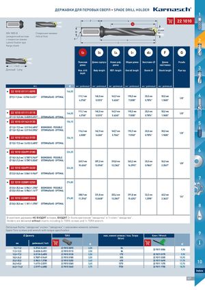 ДЕРЖАВКИ ДЛЯ ПЕРОВЫХ СВЕРЛ • SPADE DRILL HOLDER 1 F l4 222211001100 l3 Ø mm DIN 1835-B Спиральная канавка · d2 d1 Цилиндрический хвостовик Helical flute с поверхностью прижима · G l5 2 Lateral fixation type l1 flange shank l3 l5 l4 l1 d2 F G Полезная Длина корпуса Новая реф. Общая длина Хвостовик- Длина Резьба ≈ 8×DДлинный · Long длина длина хвостовика 3Max. drillBody-lengthREF.-lengthOverall lengthShank-Shank lengthPipe tap depth Art. € мм | дюймовый мм | дюймовый мм | дюймовый мм | дюймовый мм | дюймовый мм | дюймовый I 22 11001000111111 000095 146,55 9,5-1111,,00мmмm| 0|.037.34704-0.-403.4313"31" ОПOТPИTМIMАЛAЬLН·ОO·POTPIMTIAMLAL 111,1 мм 140,5 мм 142,9 мм 190,5 мм 20,0 мм 50,0 мм 1/8" 4 4.3740" 5.5315" 5.6260" 7.5000" 0.7874" 1.9685" I 22 11001000111111 001115 111,1 мм 140,5 мм 142,9 мм 190,5 мм 20,0 мм 50,0 мм146,55 1/8" 11,5--1122,,55мmмm| 0|.405.42582-08.-409.2419"21" ОПOТPИTМIMАЛAЬLН·ОO·POTPIMTIAMLAL 4.3740" 5.5315" 5.6260" 7.5000" 0.7874" 1.9685" I 22 11001000111143 001130 156,15 5 13,0--1177,,55мmмm| 0|.501.51181-08.-608.9608"90" ВОMЗÖМGОLЖICНHО · POOSSSSIIBBLLEE 13,0--1155,,00мmмm| 0|.501.51181-08.-509.0569"06" ОПOТPИTМIMАЛAЬLН·ОO·POTPIMTIAMLAL 114,3 мм 142,9 мм 145,7 мм 192,9 мм 20,0 мм 50,0 мм 1/8" 4.5000" 5.6260" 5.7362" 7.5945" 0.7874" 1.9685" I 22 11001000111143 001155 156,15 15,5--1177,,55мmмm| 0|.601.60120-02.-608.9608"90" ОПOТPИTМIMАЛAЬLН·ОO·POTPIMTIAMLAL I 22 11001000226699 001180 224,35 6 18,0--2244,,00мmмm| 0|.700.78078-07.-904.4994"49" ВОMЗÖМGОLЖICНHО · POOSSSSIIBBLLEE 18,0--2211,,00мmмm| 0|.700.78078-07.-802.6882"68" ОПOТPИTМIMАЛAЬLН·ОO·POTPIMTIAMLAL 269,9 мм 307,2 мм 310,8 мм 363,2 мм 25,0 мм 56,0 мм 1/8" 10.6260" 12.0945" 12.2362" 14.2992" 0.9843" 2.2047" I 22 11001000226699 002220 224,35 22,0--2244,,00мmмm| 0|.806.86616-01.-904.4994"49" ОПOТPИTМIMАЛAЬLН·ОO·POTPIMTIAMLAL 7 I 22 11001000228889 002250 274,80 MAC 25,0--3355,,00мmмm| 0|.908.94834-13.-317.8307"80" ВОMЗÖМGОLЖICНHО · POOSSSSIIBBLLEE 25,0--2299,,00мmмm| 0|.908.94834-13.-114.174"17" ОПOТPИTМIMАЛAЬLН·ОO·POTPIMTIAMLAL 288,9 мм 331,8 мм 335,4 мм 391,8 мм 32,0 мм 60,0 мм I 22 11001000228889 003300 274,80 11.3740" 13.0630" 13.2047" 15.4252" 1.2598" 2.3622" 1/4" 30,0--3355,,00мmмm| 1|.18.11811-1.-317.8307"80" ОПOТPИTМIMАЛAЬLН·ОO·POTPIMTIAMLAL 8 В комплект державки НЕ ВХОДЯТ вставки, ВХОДЯТ 2× болта крепления "звездочка" и 1× ключ "звездочка". OIL Holders are delivered without inserts including 2× TORX-screws and 1× TORX wrench. Запасные болты "звездочка" и ключ "звездочка" с указанием момента затяжки Spare Torx-screws and wrench with torque specification 9 Диаметр TORX макс. момент затяжки / max. Torque Ключ / Wrench (N/cm) мм дюймовый / Inch € € 9,5-11,0 0.3740-0.4331 229900100000995 3,50 8411,5-12,50.4528-0.49212299001000111153,50 8422990011 0000884 9,90 13,0-17,5 0.5118-0.6890 229900100011330 3,50 175 229900110011775 9,90 18,0-24,0 0.7087-0.9449 229900100011880 3,50 305 229900110033005 10,90 25,0-35,0 0.9843-1.3780 229900100022550 3,60 69036,0-65,01.4173-2.55912299001000336603,65137022990011006699022990011113377011,7012,7010 64,0-114,0 2.5197-4.4882 229900100066440 3,70 1750 229900111177550 18,70 Index 327 HINES