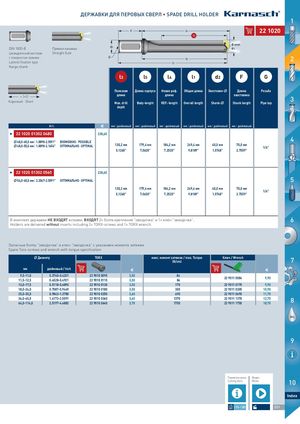 ДЕРЖАВКИ ДЛЯ ПЕРОВЫХ СВЕРЛ • SPADE DRILL HOLDER 1 F l4 222211002200 l3 Ø mm DIN 1835-B Прямая канавка · d2 d1 Цилиндрический хвостовик Straight flute с поверхностью прижима · G l5 2 Lateral fixation type l1 flange shank l3 l5 l4 l1 d2 F G Полезная Длина корпуса Новая реф. Общая длина Хвостовик- Длина Резьба ≈ 3×DКороткий · Short длина длина хвостовика 3Max. drillBody-lengthREF.-lengthOverall lengthShank-Shank lengthPipe tap depth Art. € мм | дюймовый мм | дюймовый мм | дюймовый мм | дюймовый мм | дюймовый мм | дюймовый I 22 11002000113302 004480 238,60 48,0--6655,,00мmмm| 1|.818.89889-28.-525.9515"91" ВОMЗÖМGОLЖICНHО · POOSSSSIIBBLLEE 4 48,0--5555,,00мmмm| 1|.818.89889-28.-126.5146"54" ОПOТPИTМIMАЛAЬLН·ОO·POTPIMTIAMLAL 130,2 мм 179,4 мм 184,2 мм 249,4 мм 40,0 мм 70,0 мм 1/4" 5.1260" 7.0630" 7.2520" 9.8189" 1.5748" 2.7559" I 22 11002000113302 005560 238,60 56,0--6655,,00мmмm| 2|.20.24074-27.-525.9515"91" ОПOТPИTМIMАЛAЬLН·ОO·POTPIMTIAMLAL 5 130,2 мм 179,4 мм 184,2 мм 249,4 мм 40,0 мм 70,0 мм 1/4" 5.1260" 7.0630" 7.2520" 9.8189" 1.5748" 2.7559" В комплект державки НЕ ВХОДЯТ вставки, ВХОДЯТ 2× болта крепления "звездочка" и 1× ключ "звездочка". 6 Holders are delivered without inserts including 2× TORX-screws and 1× TORX wrench. Запасные болты "звездочка" и ключ "звездочка" с указанием момента затяжки Spare Torx-screws and wrench with torque specification Диаметр TORX макс. момент затяжки / max. Torque Ключ / Wrench(N/cm) 7 мм дюймовый / Inch € € MAC 9,5-11,0 0.3740-0.4331 229900100000995 3,50 8411,5-12,50.4528-0.49212299001000111153,50 8422990011 0000884 9,90 13,0-17,5 0.5118-0.6890 229900100011330 3,50 175 229900110011775 9,90 18,0-24,0 0.7087-0.9449 229900100011880 3,50 305 229900110033005 10,90 25,0-35,0 0.9843-1.3780 229900100022550 3,60 690 229900110066990 11,70 36,0-65,0 1.4173-2.5591 229900100033660 3,65 137064,0-114,02.5197-4.48822299001000664403,70175022990011113377022990011117755012,7018,708 OIL 9 Параметры резки Видео Cutting data Movie 10 Index 1376-1385 331 HINES