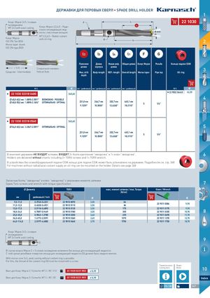 ДЕРЖАВКИ ДЛЯ ПЕРОВЫХ СВЕРЛ • SPADE DRILL HOLDER 1 Конус Морзе 2+3 с осевым F l4 222211003300 охлаждениемMT 2+3 with axial coolingКонус Морзе 2,3,4,5 – Ради- l3 ально-охлаждающая жид- кость с масляным кольцом Ø mm d1 MT 2,3,4,5 – Radial coolant Конус Морзе with oil ringISO 296 Тип BEK · G l5 2 Morse taper shank l1 ISO 296 type BEK l3 l5 l4 l1 F G Полезная Длина Новая реф. Общая длина Конус Морзе Резьба Кольцо подачи СОЖ ≈ 5×D Спиральная канавка ·Средство · IntermediateHelical flute длина корпуса длинаMax. drillBody-lengthREF.-lengthOverall lengthMorse taperPipe tap Oil ring 3 depth Art. € мм | дюймовый мм | дюймовый мм | дюймовый мм | дюймовый Art. € I 22 11003000223318 004480 345,60 II 222990000200444445 42,30 48,0--6655,,00мmмm| 1|.818.89889-28.-525.9515"91" ВОMЗÖМGОLЖICНHО · POOSSSSIIBBLLEE 4 48,0--5555,,00мmмm| 1|.818.89889-28.-126.5146"54" ОПOТPИTМIMАЛAЬLН·ОO·POTPIMTIAMLAL 231,8 мм 266,7 мм 320,7 мм 465,1 мм 5 1/4" 9.1259" 10.5000" 12.6260" 18.3110" I 22 11003000223318 005560 345,60 56,0--6655,,00мmмm| 2|.20.24074-27.-525.9515"91" ОПOТPИTМIMАЛAЬLН·ОO·POTPIMTIAMLAL 5 231,8 мм 266,7 мм 320,7 мм 465,1 мм 5 1/4" 9.1259" 10.5000" 12.6260" 18.3110" В комплект державки НЕ ВХОДЯТ вставки, ВХОДЯТ 2× болта крепления "звездочка" и 1× ключ "звездочка". 6 Holders are delivered without inserts including 2× TORX-screws and 1× TORX wrench. В устройствах без осевой/радиальной подачи СОЖ кольцо для подачи СОЖ может быть установлено на державке. Подробности см. стр. 368 For machines without radial/axial coolant supply an oil ring can be mounted on the holder. Details see page 368 Запасные болты "звездочка" и ключ "звездочка" с указанием момента затяжкиSpare Torx-screws and wrench with torque specification 7 Диаметр TORX макс. момент затяжки / max. Torque Ключ / Wrench MAC (N/cm) мм дюймовый / Inch € € 9,5-11,0 0.3740-0.4331 222299900011000000009955 3,50 8411,5-12,50.4528-0.49212222999000110000011111553,50 84222299900011110000008844 9,90 13,0-17,5 0.5118-0.6890 222299900011000001113300 3,50 175 222299900011110001117755 9,90 18,0-24,0 0.7087-0.9449 222299900011000001118800 3,50 305 222299900011110003330055 10,90 8 25,0-35,0 0.9843-1.3780 222299900011000002225500 3,60 690 222299900011110006669900 11,70 36,0-65,0 1.4173-2.5591 222299900011000003336600 3,65 1370 222299900011111113337700 12,70 64,0-114,0 2.5197-4.4882 222299900011000006664400 3,70 1750 222299900011111117775500 18,70 OIL Конус Морзе 2+3 с осевым охлаждением MT 2+3 with axial cooling 9 G В случае конуса Морзе 2 + 3 осевое охлаждение возможно без кольца для охлаждающей жидкости. С этой целью резьбовое отверстие кольца для охлаждающей жидкости (G) должно быть закрыто винтом. With morse cone 2+3, axial cooling without coolant ring is possible. For this, the thread of the coolant ring (G) must be closed with a screw. Параметры резки Видео Винт для Конус Морзе 2 / Screw for MT 2 = RC 1/16" 22211030000223188002 € 0,30 Cutting data Movie 10 Винт для Конус Морзе 3 / Screw for MT 3 = RC 1/8" 22211030000223188003 € 0,30 Index 1376-1385 347 HINES