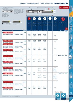 ДЕРЖАВКИ ДЛЯ ПЕРОВЫХ СВЕРЛ • SPADE DRILL HOLDER 1 Конус Морзе 2+3 с осевым F l4 222211004400 охлаждениемMT 2+3 with axial coolingКонус Морзе 2,3,4,5 – Ради- l3 ально-охлаждающая жид- кость с масляным кольцом Ø mm d1 MT 2,3,4,5 – Radial coolant Конус Морзе with oil ringISO 296 Тип BEK · G l5 2 Morse taper shank l1 ISO 296 type BEK l3 l5 l4 l1 F G Полезная Длина Новая реф. Общая длина Конус Морзе Резьба Кольцо подачи СОЖ ≈ 3×D Прямая канавка ·Средство · IntermediateStraight flute длина корпуса длина 3Max. drillBody-lengthREF.-lengthOverall lengthMorse taperPipe tapOil ring depth Art. € мм | дюймовый мм | дюймовый мм | дюймовый мм | дюймовый Art. € II 222211004400000033118800009955 118,80 II 2222990000220011990055 22,10 99,,55--1111,,00мmмm| 0|.037.34704-00.-403.4313"31" ОПOТPИTМIMАЛAЬLН·ОO·POTPIMTIAMLAL 31,8 мм 51,5 мм 88,0 мм 160,3 мм 2 1/16" 4 1.2520" 2.0276" 3.4646" 6.3110" II 222211004400000033118800111155 31,8 мм 51,5 мм 88,0 мм 160,3 мм118,80 2 1/16" 1111,,55--1122,,55мmмm| 0|.405.42582-08.-409.2419"21" ОПOТPИTМIMАЛAЬLН·ОO·POTPIMTIAMLAL 1.2520" 2.0276" 3.4646" 6.3110" II 222211004400000033550000113300 128,20 5 1133,,00--1177,,55мmмm| 0|.501.51181-08.-608.9608"90" ВОMЗÖМGОLЖICНHО ·· PPOOSSSSIIBBLLEE 1133,,00--1155,,00мmмm| 0|.501.51181-08.-509.0569"06" ОПOТPИTМIMАЛAЬLН·ОO·POTPIMTIAMLAL 35,0 мм 55,5 мм 92,4 мм 164,3 мм 2 1/16" II 222211004400000033550000115555 128,20 1.3780" 2.1850" 3.6378" 6.4685" 1155,,55--1177,,55мmмm| 0|.601.60120-02.-608.9608"90" ОПOТPИTМIMАЛAЬLН·ОO·POTPIMTIAMLAL 6 II 222211004400000066998800118800 141,20 II 2222990000220022554400 24,85 1188,,00--2244,,00мmмm| 0|.700.78078-07.-904.4994"49" ВОMЗÖМGОLЖICНHО ·· PPOOSSSSIIBBLLEE 1188,,00--2211,,00мmмm| 0|.700.78078-07.-802.6882"68" ОПOТPИTМIMАЛAЬLН·ОO·POTPIMTIAMLAL 69,8 мм 98,4 мм 142,5 мм 232,5 мм 3 1/8" II 222211004400000066998800222200 141,20 2.7480" 3.8740" 5.6102" 9.1535" 2222,,00--2244,,00мmмm| 0|.806.86616-01.-904.4994"49" ОПOТPИTМIMАЛAЬLН·ОO·POTPIMTIAMLAL 7 MAC II 222211004400000088557700225500 166,90 1/8" 2255,,00--3355,,00мmмm| 0|.908.94834-13.-317.8307"80" ВОMЗÖМGОLЖICНHО ·· PPOOSSSSIIBBLLEE 160,4 мм 273,8 мм6.3150"10.7795"4 ДержавкаHolder 2255,,00--2299,,00мmмm| 0|.908.94834-13.-114.1174"17" ОПOТPИTМIMАЛAЬLН·ОO·POTPIMTIAMLAL 25,0-35,0 мм II 222211004400000088557700330000 166,90 85,7 мм 114,3 мм3.3740"4.5000" I 22 9002 03175 32,20 8I 22900203175 3300,,00--3355,,00мmмm| 1|.118.11811-11.-317.8307"80" ОПOТPИTМIMАЛAЬLН·ОO·POTPIMTIAMLAL 1/4"167,6 мм281,0 мм6.5984"11.0630"4ДержавкаHolder OIL 30,0-35,0 мм II 222211004400001122006600336600 224,25 9 3366,,00--4477,,00мmмm| 1|.411.47137-13.-815.0845"04" ВОMЗÖМGОLЖICНHО ·· PPOOSSSSIIBBLLEE 3366,,00--4411,,00мmмm| 1|.411.47137-13.-611.4621"42" ОПOТPИTМIMАЛAЬLН·ОO·POTPIMTIAMLAL II 222211004400001122006600442200 120,6 мм 152,4 мм 206,4 мм 319,1 мм224,25 4 1/4"4.7480"6.0000"8.1259"12.5630" 4422,,00--4477,,00мmмm| 1|.615.63553-15.-815.0845"04" ОПOТPИTМIMАЛAЬLН·ОO·POTPIMTIAMLAL Параметры резки Видео Cutting data Movie 10 Продолжение стр. 353 · Continued page 353 Index 1376-1385 351 HINES