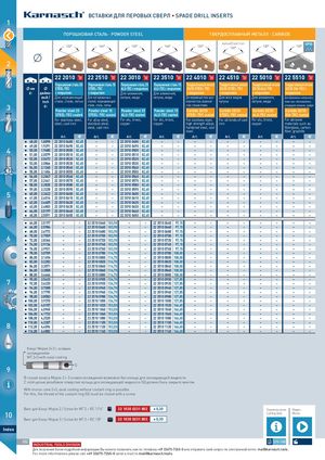 ПВСЕТРАОВВКОИЕ ДСЛВЕЯРПЛЕОР•ОВSЫPAХDСEВDЕRРIЛLL• SPADE DRILL INSERTS 1 ПОРОШКОВАЯ СТАЛЬ · POWDER STEEL ТВЕРДОСПЛАВНЫЙ МЕТАЛЛ · CARBIDE литье/Cast iron 132° 144° 132° 144° 132° 132° 132° 132° 2 22 2010 22 2510 22 3010 22 3510 22 4010 22 4510 22 5010 22 5510 Порошковая сталь 25 Порошковая сталь 15 Порошковая сталь 25 Порошковая сталь 15 Твердосплавный металл Твердосплавный металл Твердосплавный металл Твердосплавный металл мм STEEL-TEC STEEL-TEC ALU-TEC с покрытием ALU-TEC с покрытием 20/30 STEEL-TEC 20/30 STEEL-TEC 20/30 ALU-TEC 20/30 DIA-TEC с d1 дюймо- с покрытием с покрытием Для алюминия, Для алюминия, с покрытием с покрытием с покрытием покрытием вый / Для нержавеющей Для легированных латуни, меди латуни, меди Для нержавеющей стали, высо- Для всех видов Для алюминия, Для абразивных материалов, Inch стали, стали, литье сталей, нержавеющей копрочной стали, закаленной чугуна латуни, меди таких как: стекловолокно, 3 d1 стали, сталь, литье стали, стальная отливка углеродное волокно, графитPowder steel 25Powder steel 15Powder steel 25Powder steel 15Carbide 20/30Carbide 20/30Carbide 20/30Carbide 20/30 STEEL-TEC coated STEEL-TEC coated ALU-TEC coated ALU-TEC coated STEEL-TEC coated STEEL-TEC coated ALU-TEC coated DIA-TEC coated For stainless steel, For alloy steel, For alu, brass, For alu, brass, For stainless steel, For all kinds of cast For alu, brass, For abrasive steel, cast iron stainless steel, copper copper high strength alloys, iron copper materials such as: steel, cast iron hardened steel, cast fiberglass, carbon steel fiber, graphite Art. € Art. € Art. € Art. € Art. € Art. € Art. € Art. € I 48,00 1.8898 222220010004480 82,65 – – 222330010004480 82,65 – – – – – – – – – – I 49,00 1.9291 222220010004490 82,65 – – 222330010004490 82,65 – – – – – – – – – – 4 I 50,00 1.9685 222220010005500 82,65 – – 222330010005500 82,65 – – – – – – – – – – I 51,00 2.0079 222220010005510 82,65 – – 222330010005510 82,65 – – – – – – – – – – I 52,00 2.0472 222220010005520 82,65 – – 222330010005520 82,65 – – – – – – – – – – I 53,00 2.0866 222220010005530 82,65 – – 222330010005530 82,65 – – – – – – – – – – I 54,00 2.1260 222220010005540 82,65 – – 222330010005540 82,65 – – – – – – – – – – I 55,00 2.1654 222220010005550 82,65 – – 222330010005550 82,65 – – – – – – – – – – I 56,00 2.2047 222220010005560 82,65 – – 222330010005560 82,65 – – – – – – – – – – I 57,00 2.2441 222220010005570 82,65 – – 222330010005570 82,65 – – – – – – – – – – I 58,00 2.2835 222220010005580 82,65 – – 222330010005580 82,65 – – – – – – – – – – I 59,00 2.3228 222220010005590 82,65 – – 222330010005590 82,65 – – – – – – – – – – 5 I 60,00 2.3622 222220010006600 82,65 –I61,002.401622222001000661082,65––22233001000660082,65––22233001000661082,65––––– –– –– –– –– –– –– –– I 62,00 2.4409 222220010006620 82,65 – – 222330010006620 82,65 – – – – – – – – – – I 63,00 2.4803 222220010006630 82,65 – – 222330010006630 82,65 – – – – – – – – – – I 64,00 2.5197 222220010006640 82,65 – – 222330010006640 82,65 – – – – – – – – – – I 65,00 2.5591 222220010006650 82,65 – – 222330010006650 82,65 – – – – – – – – – – I 64,00 2.5197 – – 222225510006640 103,90 – – 222335510006640 97,15 – – – – – – – – I 66,00 2.5984 – – 222225510006660 103,90 – – 222335510006660 97,15 – – – – – – – – I 68,00 2.6772 – – 222225510006680 103,90 – – 222335510006680 97,15 – – – – – – – – 6 I 70,00 2.7559 –I72,002.8346– – 222225510007700 103,90 ––222225510007720103,90––222335510007700 97,15 ––222335510007720 97,15––– –– –– –– –– –– –– I 74,00 2.9134 – – 222225510007740 103,90 – – 222335510007740 97,15 – – – – – – – – I 76,00 2.9921 – – 222225510007760 103,90 – – 222335510007760 97,15 – – – – – – – – I 78,00 3.0709 – – 222225510007780 114,75 – – 222335510007780 108,00 – – – – – – – – I 80,00 3.1496 – – 222225510008800 114,75 – – 222335510008800 108,00 – – – – – – – – I 82,00 3.2283 – – 222225510008820 114,75 – – 222335510008820 108,00 – – – – – – – – I 84,00 3.3071 – – 222225510008840 114,75 – – 222335510008840 108,00 – – – – – – – – I 86,00 3.3858 – – 222225510008860 114,75 – – 222335510008860 108,00 – – – – – – – – I 88,00 3.4646 – – 222225510008880 114,75 – – 222335510008880 108,00 – – – – – – – – 7 I 90,00 3.5433 –I92,003.6220– – 222225510009900 134,70 ––222225510009920134,70––222335510009900127,85 ––222335510009920127,85––– –– –– –– –– –– –– I 94,00 3.7008 – – 222225510009940 134,70 – – 222335510009940 127,85 – – – – – – – – NES I 96,00 3.7795 – – 222225510009960 134,70 – – 222335510009960 127,85 – – – – – – – – I 98,00 3.8583 – – 222225510009980