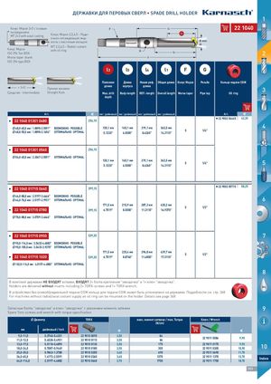 ДЕРЖАВКИ ДЛЯ ПЕРОВЫХ СВЕРЛ • SPADE DRILL HOLDER 1 Конус Морзе 2+3 с осевым F l4 222211004400 охлаждениемMT 2+3 with axial coolingКонус Морзе 2,3,4,5 – Ради- l3 ально-охлаждающая жид- кость с масляным кольцом Ø mm d1 MT 2,3,4,5 – Radial coolant Конус Морзе with oil ringISO 296 Тип BEK · G l5 2 Morse taper shank l1 ISO 296 type BEK l3 l5 l4 l1 F G Полезная Длина Новая реф. Общая длина Конус Морзе Резьба Кольцо подачи СОЖ ≈ 3×D Прямая канавка ·Средство · IntermediateStraight flute длина корпуса длина 3Max. drillBody-lengthREF.-lengthOverall lengthMorse taperPipe tapOil ring depth Art. € мм | дюймовый мм | дюймовый мм | дюймовый мм | дюймовый Art. € I 22 11004000113301 004480 256,10 II 222990000200444445 42,30 48,0--6655,,00мmмm| 1|.818.89889-28.-525.9515"91" ВОMЗÖМGОLЖICНHО · POOSSSSIIBBLLEE 48,0--5555,,00мmмm| 1|.818.89889-28.-126.5146"54" ОПOТPИTМIMАЛAЬLН·ОO·POTPIMTIAMLAL130,1 мм165,1 мм219,1 мм363,5 мм51/4"5.1220"6.5000"8.6260"14.3110"4 I 22 11004000113301 005560 256,10 56,0--6655,,00мmмm| 2|.20.24074-27.-525.9515"91" ОПOТPИTМIMАЛAЬLН·ОO·POTPIMTIAMLAL 130,1 мм 165,1 мм 219,1 мм 363,5 мм 5 1/4"5.1220"6.5000"8.6260"14.3110" 5 I 22 11004000117715 006640 399,15 II 222990000200557715 58,25 64,0--8888,,00мmмm| 2|.521.59179-37.-436.46"46" ВОMЗÖМGОLЖICНHО · POOSSSSIIBBLLEE 64,0--7766,,00мmмm| 2|.521.59179-27.-929.2919"21" ОПOТPИTМIMАЛAЬLН·ОO·POTPIMTIAMLAL 6 171,5 мм 215,9 мм 287,3 мм 430,2 мм I 22 11004000117715 007780 5 1/2"399,156.7519"8.5000"11.3110"16.9370" 78,0--8888,,00мmмm| 3|.037.00790-39.-436.46"46" ОПOТPИTМIMАЛAЬLН·ОO·POTPIMTIAMLAL I 22 11004000117715 009900 539,35 7 90,0--111144,,00мmмm| 3|.534.53433-43.-448.8428"82"ВОMЗÖМGОLЖICНHО · POOSSSSIIBBLLEE MAC 90,0--110000,,00мmмm| 3|.534.53433-3.-933.7903"70"ОПOТPИTМIMАЛAЬLН·ОO·POTPIMTIAMLAL 171,5 мм 225,4 мм 296,8 мм 439,7 мм 5 1/2" I 22 11004000117715 110020 539,35 6.7519" 8.8740" 11.6850" 17.3110" 102,0--111144,,00мmмm| 4|.401.05175-74-.448.48828"2"ОПOТPИTМIMАЛAЬLН·ОO·POTPIMTIAMLAL 8 В комплект державки НЕ ВХОДЯТ вставки, ВХОДЯТ 2× болта крепления "звездочка" и 1× ключ "звездочка". Holders are delivered without inserts including 2× TORX-screws and 1× TORX wrench. OIL В устройствах без осевой/радиальной подачи СОЖ кольцо для подачи СОЖ может быть установлено на державке. Подробности см. стр. 368 For machines without radial/axial coolant supply an oil ring can be mounted on the holder. Details see page 368 Запасные болты "звездочка" и ключ "звездочка" с указанием момента затяжки 9 Spare Torx-screws and wrench with torque specification Диаметр TORX макс. момент затяжки / max. Torque Ключ / Wrench (N/cm) мм дюймовый / Inch € € 9,5-11,0 0.3740-0.4331 222299900011000000009955 3,50 8411,5-12,50.4528-0.49212222999000110000011111553,50 84222299900011110000008844 9,90 13,0-17,5 0.5118-0.6890 222299900011000001113300 3,50 17518,0-24,00.7087-0.94492222999000110000011188003,50 305222299900011110001117755222299900011110003330055 9,9010,9010 25,0-35,0 0.9843-1.3780 222299900011000002225500 3,60 690 222299900011110006669900 11,70 36,0-65,0 1.4173-2.5591 222299900011000003336600 3,65 137064,0-114,02.5197-4.48822222999000110000066644003,70175022229990001111111333770022229990001111111777550012,70Index18,70 353 HINES