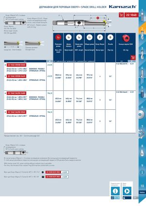 ДЕРЖАВКИ ДЛЯ ПЕРОВЫХ СВЕРЛ • SPADE DRILL HOLDER 1 Конус Морзе 2+3 с осевым F l4 222211004400 охлаждениемMT 2+3 with axial coolingКонус Морзе 2,3,4,5 – Ради- l3 ально-охлаждающая жид- кость с масляным кольцом Ø mm d1 MT 2,3,4,5 – Radial coolant Конус Морзе with oil ringISO 296 Тип BEK · G l5 2 Morse taper shank l1 ISO 296 type BEK l3 l5 l4 l1 F G Полезная Длина Новая реф. Общая длина Конус Морзе Резьба Кольцо подачи СОЖ ≈ 12×D Прямая канавка ·Средство · IntermediateStraight flute длина корпуса длина 3Max. drillBody-lengthREF.-lengthOverall lengthMorse taperPipe tapOil ring depth Art. € мм | дюймовый мм | дюймовый мм | дюймовый мм | дюймовый Art. € I 22 11004000555558 003360 613,75 II 222990000200331175 32,20 36,0--4477,,00мmмm| 1|.411.47137-13.-815.0845"04" ВОMЗÖМGОLЖICНHО · POOSSSSIIBBLLEE 4 36,0--4411,,00мmмm| 1|.411.47137-13.-611.4621"42" ОПOТPИTМIMАЛAЬLН·ОO·POTPIMTIAMLAL I 22 11004000555558 004420 558,8 мм 590,6 мм 644,6 мм 757,2 мм613,75 4 1/4" 22.0000" 23.2520" 25.3780" 29.8110" 42,0--4477,,00мmмm| 1|.615.63553-15.-815.0845"04" ОПOТPИTМIMАЛAЬLН·ОO·POTPIMTIAMLAL 5 I 22 11004000662250 004480 756,15 II 222990000200444445 42,30 48,0--6655,,00мmмm| 1|.818.89889-28.-525.9515"91" ВОMЗÖМGОLЖICНHО · POOSSSSIIBBLLEE 48,0--5555,,00мmмm| 1|.818.89889-28.-126.5146"54" ОПOТPИTМIMАЛAЬLН·ОO·POTPIMTIAMLAL 625,0 мм 660,4 мм 714,4 мм 858,8 мм 5 1/4" 24.6063" 26.0000" 28.1260" 33.8110" 6 I 22 11004000662250 005560 756,15 56,0--6655,,00мmмm| 2|.20.24074-27.-525.9515"91" ОПOТPИTМIMАЛAЬLН·ОO·POTPIMTIAMLAL 625,0 мм 660,4 мм 714,4 мм 858,8 мм 5 1/4" 24.6063" 26.0000" 28.1260" 33.8110" 7 MAC Продолжение стр. 361 · Continued page 361 Конус Морзе 2+3 с осевымохлаждением 8 MT 2+3 with axial cooling G OIL В случае конуса Морзе 2 + 3 осевое охлаждение возможно без кольца для охлаждающей жидкости. С этой целью резьбовое отверстие кольца для охлаждающей жидкости (G) должно быть закрыто винтом. With morse cone 2+3, axial cooling without coolant ring is possible. For this, the thread of the coolant ring (G) must be closed with a screw. 9 Винт для Конус Морзе 2 / Screw for MT 2 = RC 1/16" 22211030000223188002 € 0,30 Винт для Конус Морзе 3 / Screw for MT 3 = RC 1/8" 22211030000223188003 € 0,30 Параметры резки Видео Cutting data Movie 10 Index 1376-1385 359 HINES