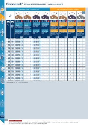 ПВСЕТРАОВВКОИЕ ДСЛВЕЯРПЛЕОР•ОВSЫPAХDСEВDЕRРIЛLL• SPADE DRILL INSERTS 1 ПОРОШКОВАЯ СТАЛЬ · POWDER STEEL ТВЕРДОСПЛАВНЫЙ МЕТАЛЛ · CARBIDE литье/Cast iron 132° 144° 132° 144° 132° 132° 132° 132° 2 22 2010 22 2510 22 3010 22 3510 22 4010 22 4510 22 5010 22 5510 Порошковая сталь 25 Порошковая сталь 15 Порошковая сталь 25 Порошковая сталь 15 Твердосплавный металл Твердосплавный металл Твердосплавный металл Твердосплавный металл мм STEEL-TEC STEEL-TEC ALU-TEC с покрытием ALU-TEC с покрытием 20/30 STEEL-TEC 20/30 STEEL-TEC 20/30 ALU-TEC 20/30 DIA-TEC с d1 дюймо- с покрытием с покрытием Для алюминия, Для алюминия, с покрытием с покрытием с покрытием покрытием вый / Для нержавеющей Для легированных латуни, меди латуни, меди Для нержавеющей стали, высо- Для всех видов Для алюминия, Для абразивных материалов, Inch стали, стали, литье сталей, нержавеющей копрочной стали, закаленной чугуна латуни, меди таких как: стекловолокно, 3 d1 стали, сталь, литье стали, стальная отливка углеродное волокно, графитPowder steel 25Powder steel 15Powder steel 25Powder steel 15Carbide 20/30Carbide 20/30Carbide 20/30Carbide 20/30 STEEL-TEC coated STEEL-TEC coated ALU-TEC coated ALU-TEC coated STEEL-TEC coated STEEL-TEC coated ALU-TEC coated DIA-TEC coated For stainless steel, For alloy steel, For alu, brass, For alu, brass, For stainless steel, For all kinds of cast For alu, brass, For abrasive steel, cast iron stainless steel, copper copper high strength alloys, iron copper materials such as: steel, cast iron hardened steel, cast fiberglass, carbon steel fiber, graphite Art. € Art. € Art. € Art. € Art. € Art. € Art. € Art. € I 36,00 1.4173 222220010003360 57,75 – – 222330010003360 59,50 – – – – – – – – – – 4 I 37,00 1.4567 222220010003370 57,75 –I38,001.496122222001000338057,75––22233001000337059,50––22233001000338059,50––––– –– –– –– –– –– –– –– I 39,00 1.5354 222220010003390 57,75 – – 222330010003390 59,50 – – – – – – – – – – I 40,00 1.5748 222220010004400 57,75 – – 222330010004400 59,50 – – – – – – – – – – I 41,00 1.6142 222220010004410 57,75 – – 222330010004410 59,50 – – – – – – – – – – I 42,00 1.6535 222220010004420 57,75 – – 222330010004420 59,50 – – – – – – – – – – I 43,00 1.6929 222220010004430 57,75 – – 222330010004430 59,50 – – – – – – – – – – I 44,00 1.7323 222220010004440 57,75 – – 222330010004440 59,50 – – – – – – – – – – I 45,00 1.7717 222220010004450 57,75 – – 222330010004450 59,50 – – – – – – – – – – 5 I 46,00 1.8110 222220010004460 57,75 – – 222330010004460 59,50 – – – – – – – – – – I 47,00 1.8504 222220010004470 57,75 – – 222330010004470 59,50 – – – – – – – – – – I 48,00 1.8898 222220010004480 82,65 – – 222330010004480 82,65 – – – – – – – – – – I 49,00 1.9291 222220010004490 82,65 – – 222330010004490 82,65 – – – – – – – – – – I 50,00 1.9685 222220010005500 82,65 – – 222330010005500 82,65 – – – – – – – – – – I 51,00 2.0079 222220010005510 82,65 – – 222330010005510 82,65 – – – – – – – – – – I 52,00 2.0472 222220010005520 82,65 – – 222330010005520 82,65 – – – – – – – – – – I 53,00 2.0866 222220010005530 82,65 – – 222330010005530 82,65 – – – – – – – – – – 6 I 54,00 2.1260 222220010005540 82,65 –I55,002.165422222001000555082,65––22233001000554082,65––22233001000555082,65––––– –– –– –– –– –– –– –– I 56,00 2.2047 222220010005560 82,65 – – 222330010005560 82,65 – – – – – – – – – – I 57,00 2.2441 222220010005570 82,65 – – 222330010005570 82,65 – – – – – – – – – – I 58,00 2.2835 222220010005580 82,65 – – 222330010005580 82,65 – – – – – – – – – – I 59,00 2.3228 222220010005590 82,65 – – 222330010005590 82,65 – – – – – – – – – – I 60,00 2.3622 222220010006600 82,65 – – 222330010006600 82,65 – – – – – – – – – – I 61,00 2.4016 222220010006610 82,65 – – 222330010006610 82,65 – – – – – – – – – – 7 I 62,00 2.4409 222220010006620 82,65 –I63,002.480322222001000663082,65––22233001000662082,65––22233001000663082,65––––– –– –– –– –– –– –– –– I 64,00 2.5197 222220010006640 82,65 – – 222330010006640 82,65 – – – – – – – – – – NES I 65,00 2.5591 222220010006650 82,65 – – 222330010006650 82,65 – – – – – – – – – – Продолжение стр. 364 · Continued page 364 8 OIL 9 10 Index 362 INDUSTRIAL TOOLS DIVISION Для получения более подробной информации Вы можете позвонить нам по телефону +49 33675-7265-0 или отправить свой запрос по электронной почте: mail@karnasch.tools. For more informations please call +49 33675-7265-0 send a mail to mail@karnasch.tools. MACHI