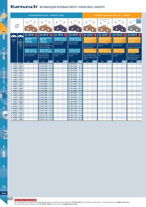 ПВСЕТРАОВВКОИЕ ДСЛВЕЯРПЛЕОР•ОВSЫPAХDСEВDЕRРIЛLL• SPADE DRILL INSERTS 1 ПОРОШКОВАЯ СТАЛЬ · POWDER STEEL ТВЕРДОСПЛАВНЫЙ МЕТАЛЛ · CARBIDE литье/Cast iron 132° 144° 132° 144° 132° 132° 132° 132° 2 22 2010 22 2510 22 3010 22 3510 22 4010 22 4510 22 5010 22 5510 Порошковая сталь 25 Порошковая сталь 15 Порошковая сталь 25 Порошковая сталь 15 Твердосплавный металл Твердосплавный металл Твердосплавный металл Твердосплавный металл мм STEEL-TEC STEEL-TEC ALU-TEC с покрытием ALU-TEC с покрытием 20/30 STEEL-TEC 20/30 STEEL-TEC 20/30 ALU-TEC 20/30 DIA-TEC с d1 дюймо- с покрытием с покрытием Для алюминия, Для алюминия, с покрытием с покрытием с покрытием покрытием вый / Для нержавеющей Для легированных латуни, меди латуни, меди Для нержавеющей стали, высо- Для всех видов Для алюминия, Для абразивных материалов, Inch стали, стали, литье сталей, нержавеющей копрочной стали, закаленной чугуна латуни, меди таких как: стекловолокно, 3 d1 стали, сталь, литье стали, стальная отливка углеродное волокно, графитPowder steel 25Powder steel 15Powder steel 25Powder steel 15Carbide 20/30Carbide 20/30Carbide 20/30Carbide 20/30 STEEL-TEC coated STEEL-TEC coated ALU-TEC coated ALU-TEC coated STEEL-TEC coated STEEL-TEC coated ALU-TEC coated DIA-TEC coated For stainless steel, For alloy steel, For alu, brass, For alu, brass, For stainless steel, For all kinds of cast For alu, brass, For abrasive steel, cast iron stainless steel, copper copper high strength alloys, iron copper materials such as: steel, cast iron hardened steel, cast fiberglass, carbon steel fiber, graphite Art. € Art. € Art. € Art. € Art. € Art. € Art. € Art. € I 64,00 2.5197 – – 222225510006640 103,90 – – 222335510006640 97,15 – – – – – – – – I 66,00 2.5984 – – 222225510006660 103,90 – – 222335510006660 97,15 – – – – – – – – 4 I 68,00 2.6772 – – 222225510006680 103,90 – – 222335510006680 97,15 – – – – – – – – I 70,00 2.7559 – – 222225510007700 103,90 – – 222335510007700 97,15 – – – – – – – – I 72,00 2.8346 – – 222225510007720 103,90 – – 222335510007720 97,15 – – – – – – – – I 74,00 2.9134 – – 222225510007740 103,90 – – 222335510007740 97,15 – – – – – – – – I 76,00 2.9921 – – 222225510007760 103,90 – – 222335510007760 97,15 – – – – – – – – I 78,00 3.0709 – – 222225510007780 114,75 – – 222335510007780 108,00 – – – – – – – – I 80,00 3.1496 – – 222225510008800 114,75 – – 222335510008800 108,00 – – – – – – – – I 82,00 3.2283 – – 222225510008820 114,75 – – 222335510008820 108,00 – – – – – – – – 5 I 84,00 3.3071 –I86,003.3858– – 222225510008840 114,75 ––222225510008860114,75––222335510008840108,00 ––222335510008860108,00––– –– –– –– –– –– –– I 88,00 3.4646 – – 222225510008880 114,75 – – 222335510008880 108,00 – – – – – – – – I 90,00 3.5433 – – 222225510009900 134,70 – – 222335510009900 127,85 – – – – – – – – I 92,00 3.6220 – – 222225510009920 134,70 – – 222335510009920 127,85 – – – – – – – – I 94,00 3.7008 – – 222225510009940 134,70 – – 222335510009940 127,85 – – – – – – – – I 96,00 3.7795 – – 222225510009960 134,70 – – 222335510009960 127,85 – – – – – – – – I 98,00 3.8583 – – 222225510009980 134,70 – – 222335510009980 127,85 – – – – – – – – I 100,00 3.9370 – – 222225510110000 134,70 – – 222335510110000 127,85 – – – – – – – – 6 I 102,00 4.0157 –I 104,004.0945–– 222225510110020 153,50 ––222225510110040153,50––222335510110020146,65 ––222335510110040146,65––– –– –– –– –– –– –– I 106,00 4.1732 – – 222225510110060 153,50 – – 222335510110060 146,65 – – – – – – – – I 108,00 4.2520 – – 222225510110080 153,50 – – 222335510110080 146,65 – – – – – – – – I 110,00 4.3307 – – 222225510111100 153,50 – – 222335510111100 146,65 – – – – – – – – I 112,00 4.4094 – – 222225510111120 153,50 – – 222335510111120 146,65 – – – – – – – – I 114,00 4.4882 – – 222225510111140 153,50 – – 222335510111140 146,65 – – – – – – – – 7 NES 8 OIL 9 10 Index 364 INDUSTRIAL TOOLS DIVISION Для получения более подробной информации Вы можете позвонить нам по телефону +49 33675-7265-0 или отправить свой запрос по электронной почте: mail@karnasch.tools. For more informations please call +49 33675-7265-0 send a mail to mail@karnasch.tools. MACHI
