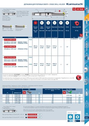 ДЕРЖАВКИ ДЛЯ ПЕРОВЫХ СВЕРЛ • SPADE DRILL HOLDER 1 Конус Морзе 2+3 с осевым F l4 222211004400 охлаждениемMT 2+3 with axial coolingКонус Морзе 2,3,4,5 – Ради- l3 ально-охлаждающая жид- кость с масляным кольцом Ø mm d1 MT 2,3,4,5 – Radial coolant Конус Морзе with oil ringISO 296 Тип BEK · G l5 2 Morse taper shank l1 ISO 296 type BEK l3 l5 l4 l1 F G Полезная Длина Новая реф. Общая длина Конус Морзе Резьба Кольцо подачи СОЖ ≈ 15×D Прямая канавка ·Средство · IntermediateStraight flute длина корпуса длина 3Max. drillBody-lengthREF.-lengthOverall lengthMorse taperPipe tapOil ring depth Art. € мм | дюймовый мм | дюймовый мм | дюймовый мм | дюймовый Art. € I 22 11004000888890 006640 999,25 II 222990000200557715 58,25 64,0--8888,,00мmмm| 2|.521.59179-37.-436.46"46" ВОMЗÖМGОLЖICНHО · POOSSSSIIBBLLEE 4 64,0--7766,,00мmмm| 2|.521.59179-27.-929.2919"21" ОПOТPИTМIMАЛAЬLН·ОO·POTPIMTIAMLAL I 22 11004000888890 007780 889,0 мм 933,4 мм 1004,8 мм 1147,7 мм999,25 5 1/2" 35.0000" 36.7480" 39.5591" 45.1850" 78,0--8888,,00мmмm| 3|.037.00790-39.-436.46"46" ОПOТPИTМIMАЛAЬLН·ОO·POTPIMTIAMLAL 5 I 22 11004000993390 009900 1.376,25 90,0--111144,,00мmмm| 3|.534.53433-43.-448.8428"82"ВОMЗÖМGОLЖICНHО · POOSSSSIIBBLLEE 90,0--110000,,00мmмm| 3|.534.53433-3.-933.7903"70"ОПOТPИTМIMАЛAЬLН·ОO·POTPIMTIAMLAL I 22 11004000993390 110020 1.376,35 939,0 мм 993,7 мм 1065,2 мм 1208,0 мм 5 1/2"36.9685"39.1220"41.9370"47.5591" 6 102,00--111144,0,0мmмm| 4|.041.05175-47.-448.8428"82"ОПOТPИTМIMАЛAЬLН·ОO·POTPIMTIAMLAL В комплект державки НЕ ВХОДЯТ вставки, ВХОДЯТ 2× болта крепления "звездочка" и 1× ключ "звездочка". Holders are delivered without inserts including 2× TORX-screws and 1× TORX wrench. В устройствах без осевой/радиальной подачи СОЖ кольцо для подачи СОЖ может быть установлено на державке. Подробности см. стр. 368 7 For machines without radial/axial coolant supply an oil ring can be mounted on the holder. Details see page 368 MAC Запасные болты "звездочка" и ключ "звездочка" с указанием момента затяжки Spare Torx-screws and wrench with torque specification Диаметр TORX макс. момент затяжки / max. Torque Ключ / Wrench 8 (N/cm) мм дюймовый / Inch € € 9,5-11,0 0.3740-0.4331 222299900011000000009955 3,50 8411,5-12,50.4528-0.49212222999000110000011111553,50 84 OIL222299900011110000008844 9,90 13,0-17,5 0.5118-0.6890 222299900011000001113300 3,50 175 222299900011110001117755 9,90 18,0-24,0 0.7087-0.9449 222299900011000001118800 3,50 305 222299900011110003330055 10,90 25,0-35,0 0.9843-1.3780 222299900011000002225500 3,60 690 222299900011110006669900 11,70 36,0-65,0 1.4173-2.5591 222299900011000003336600 3,65 1370 222299900011111113337700 12,70 9 64,0-114,0 2.5197-4.4882 222299900011000006664400 3,70 1750 222299900011111117775500 18,70 Конус Морзе 2+3 с осевым В случае конуса Морзе 2 + 3 осевое охлаждение возможно без кольца для охлаждающей жидкости. охлаждением С этой целью резьбовое отверстие кольца для охлаждающей жидкости (G) должно быть закрыто винтом. MT 2+3 with axial cooling With morse cone 2+3, axial cooling without coolant ring is possible. G For this, the thread of the coolant ring (G) must be closed with a screw. Параметры резки Видео Винт для Конус Морзе 2 / Screw for MT 2 = RC 1/16" 22211030000223188002 € 0,30 Cutting data Movie 10 Винт для Конус Морзе 3 / Screw for MT 3 = RC 1/8" 22211030000223188003 € 0,30 Index 1376-1385 365 HINES