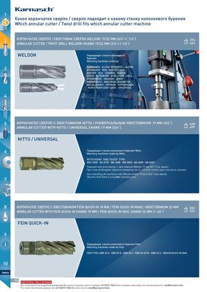 1 Какое корончатое сверло / сверло подходит к какому станку колонкового бурения Which annular cutter / Twist drill fits which annular cutter machine 2 КОРОНЧАТОЕ СВЕРЛО / ХВОСТОВИК СВЕРЛА WELDON 19/32 ММ (3/4"+1.1/4")ANNULAR CUTTER / TWIST DRILL WELDON-SHANK 19/32 MM (3/4"+1.1/4") 374-443 WELDON Подходящие станки колонкового бурения: Matching machines made by: 3 KARNASCH · ALFRA-ROTABEST + ALFRAROTAQUICK · BDS · BDS KEYLESS · BEKTOP · BUX · CEMBRE · DUBUIS · ERICO · EUROBOOR · EVOLUTION · HALL (POWERBOR) · HOUGEN · JANCY · MAGBROACH · MAGTRON · MAGNETOR · METALLKRAFT · PROMAG · ROTABROACH · RUKO+RUKO EASY LOCK · UNIVERSAL ... 4 5 КОРОНЧАТОЕ СВЕРЛО С ХВОСТОВИКОМ NITTO / УНИВЕРСАЛЬНЫМ ХВОСТОВИКОМ 19 MM (3/4") 448- ANNULAR CUTTER WITH NITTO / UNIVERSAL SHANK 19 MM (3/4") 499 NITTO / UNIVERSAL 6 Подходящие станки колонкового бурения Nitto:Matching machines made by Nitto: NITTO KOHKI "ONE TOUCH" TYPE: WOJ 3200 · AO 5575 · WA 3500 · WA 5000 · QA 4000 · QA 6500 Подходят для всех машин с хвостовиком Weldon 19 мм (3/4") (см. выше). При этом необходимо обратить внимание на то, что есть только одна плоскость зажима. Also matching all machines with Weldon shank 19 mm (3/4") (see above). 7 Observe that there is only one clamping face. NES 8 КОРОНЧАТОЕ СВЕРЛО С ХВОСТОВИКОМ FEIN QUICK-IN 18 MM / FEIN QUICK-IN МАКС.-ХВОСТОВИКОМ 32 MM 502- ANNULAR CUTTER WITH FEIN QUICK-IN SHANK 18 MM / FEIN QUICK-IN MAX.-SHANK 32 MM (1.1/4") 512 OIL FEIN QUICK-IN 9 Подходящие станки колонкового бурения Fein: Matching machines made by Fein: FEIN TYPE: KBM 32 Q · KBM 50 Q · KBM 50 U · KBM 50 AUTO · KBM 65 U · KBM 80 QUICK-IN MAX 10 Index 372 INDUSTRIAL TOOLS DIVISION Для получения более подробной информации Вы можете позвонить нам по телефону +49 33675-7265-0 или отправить свой запрос по электронной почте: mail@karnasch.tools. For more informations please call +49 33675-7265-0 send a mail to mail@karnasch.tools. MACHI