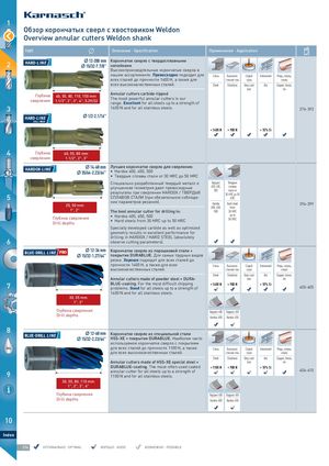 1 Обзор корончатых сверл с хвостовиком Weldon Overview annular cutters Weldon shank ТИП Описание · Specification Применение · Application 2 HARD-L I N E 12-200 mm Корончатое сверло с твердосплавными 15/32-7.7/8"напайками Высокопроизводтельные корончатые сверла в нашем ассортименте. Превосходно подходит для Сталь Высококаче- Серый Алюминий Медь, латунь, всех сталей до прочности 1400 Н, а также для ственная сталь чугун олово всех высококачественных сталей. Steel Stainless Grey cast Alu Copper, brass, iron tin Глубина 40, 55, 80, 110, 150 mmсверления1.1/2", 2", 3", 4", 5.29/32Annular cutters carbide-tippedThe most powerful annular cutters in ourrange. Excellent for all steels up to a strength of 3 1400 N and for all stainless steels. 376-393 HARD-L I N E 1/2-2.1/16" ZOLL / INCH < 1400 N > 900 N > 10% Si 4 Глубина 40, 55, 80 mm сверления 1.1/2", 2", 3" HARDOX-L I N E 14-60 mm Лучшее корончатое сверло для сверления: 35/64-2.23/64"• Hardox 400, 450, 500 • Твердые сплавы стали от 30 HRC до 50 HRC Специально разработанный твердый металл и Хардокс Твердые 5 улучшенная геометрия дают превосходныерезультаты при сверлении HARDOX / ТВЕРДЫХ400, 450,сплавы500стали от30 HRC до 50СПЛАВОВ СТАЛИ (при обязательном соблюде-HRC нии параметров резания).25, 50 mm Hardox Hard steel400, 450,from 394-399 1", 2" The best annular cutter for drilling in: 500 30 HRC Глубина сверленияDrill depths • Hardox 400, 450, 500• Hard steels from 30 HRC up to 50 HRC up to50 HRC Specially developed carbide as well as optimized geometry results in excellent performance for drilling in HARDOX / HARD STEEL (absolutely 6 observe cutting parameters). BLUE-DRILL LINE PRO 12-36 mm Корончатое сверло из порошковой стали + 15/32-1.27/64"покрытие DURABLUE. Для самых трудных видов резки. Хорошо подходит для всех сталей до прочности 1400 Н, а также для всех Сталь Высококаче- Серый Алюминий Медь, латунь, высококачественных сталей. ственная сталь чугун олово Steel Stainless Grey cast Alu Copper, brass, Annular cutters made of powder steel + DURA iron tin 7 BLUE-coating. For the most difficult chipping < 1400 N > 900 N > 10% Siproblems. Good for all steels up to a strength of400-405 1400 N and for all stainless steels. NES 30, 55 mm 1", 2" Глубина сверления Хардокс 400 Хардокс 450 Drill depths Hardox 400 Hardox 450 8 BLUE-DRILL LINE 12-60 mm Корончатое сверло из специальной стали 15/32-2.23/64"HSS-XE + покрытие DURABLUE. Наиболее часто используемое корончатое сверло с покрытием OIL для всех сталей до прочности 1100 Н, а также Сталь Высококаче- Серый Алюминий Медь, латунь, для всех высококачественных сталей. ственная сталь чугун олово Steel Stainless Grey cast Alu Copper, brass, Annular cutters made of HSS-XE special steel + iron tin DURABLUE-coating. The most-often used coated < 1100 N < 900 N > 10% Si 9 annular cutter for all steels up to a strength of1100 N and for all stainless steels. 406-415 30, 55, 80, 110 mm 1", 2", 3", 4" Глубина сверления Хардокс 400 Хардокс 450 Drill depths Hardox 400 Hardox 450 10 Index 374 ОПТИМАЛЬНО · OPTIMAL ХОРОШО · GOOD ВОЗМОЖНО · POSSIBLE MACHI