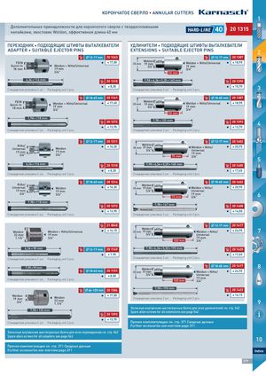 КОРОНЧАТОЕ СВЕРЛО • ANNULAR CUTTERS 1 Дополнительные принадлежности для корончатого сверла с твердосплавныминапайками, хвостовик Weldon, эффективная длина 40 мм HARD-L I N E 40 2200 11331155 ПЕРЕХОДНИК + ПОДХОДЯЩИЕ ШТИФТЫ ВЫТАЛКЕВАТЕЛИ УДЛИНИТЕЛИ + ПОДХОДЯЩИЕ ШТИФТЫ ВЫТАЛКЕВАТЕЛИ ADAPTER + SUITABLE EJECTOR PINS EXTENSIONS + SUITABLE EJECTOR PINS 2 12-17 mm 20 112263 12-17 mm 20 113387 FEINQuick-In I € 17,50Weldon + Nitto/UniversalWeldon35 mm19 mm3/4" Weldon + Nitto/Universal I € 18,9519 mm 18 mm 19 mm 3/4" 3/4" 50 mm 6,34 × 116 mm 20 113318 7,98 × 6,34 × 5,30 × 140 mm 20 113390 Стандартная упаковка 2 шт. ∙ Packaging unit 2 pcs. I € 8,30 Стандартная упаковка 2 шт. ∙ Packaging unit 2 pcs. I € 15,70 3 18-65 mm 20 111161 18-65 mm 20 113387 FEINQuick-In18 mm Weldon + Nitto/Universal I € 17,45 Weldon35 mm19 mm19 mm3/4"3/4" Weldon + Nitto/Universal I € 18,9519 mm3/4" 50 mm 7,98 × 118 mm 20 112272 7,98 × 135 mm 20 113393 4 I € 13,95 I € 13,70 Стандартная упаковка 2 шт. ∙ Packaging unit 2 pcs. Стандартная упаковка 2 шт. ∙ Packaging unit 2 pcs. 12-17 mm 20 113311 12-17 mm 20 114402 Nitto/Universal Weldon19 mm19 mm3/4"3/4" I € 16,30 Weldon35 mm19 mm Weldon + Nitto/ I € 20,953/4"Universal19 mm75 mm3/4"5 6,34 × 116 mm 20 113318 7,98 × 6,34 × 5,30 × 165 mm 20 114405 I € 8,30 I € 17,65 Стандартная упаковка 2 шт. ∙ Packaging unit 2 pcs. Стандартная упаковка 2 шт. ∙ Packaging unit 2 pcs. 18-65 mm 20 113314 18-65 mm 20 114402 Nitto/Universal Weldon I € 16,30 Weldon35 mm19 mm Weldon + Nitto/ I € 20,95 19 mm 19 mm 3/4" Universal 3/4" 3/4" 19 mm75 mm3/4" 6 7,98 × 118 mm 20 112272 7,98 × 167 mm 20 114408 I € 13,95 I € 14,55 Стандартная упаковка 2 шт. ∙ Packaging unit 2 pcs. Стандартная упаковка 2 шт. ∙ Packaging unit 2 pcs. 21 000048 12-17 mm 20 114417 Weldon Weldon + Nitto/Universal I € 14,15 Weldon35 mm19mm Weldon + Nitto/ I € 24,95 7 32 mm 19 mm 3/4" Universal 1.1/4" 3/4" 19 mm100 mm3/4" MAC 6,34 × 90 mm 12-17 mm 20 111149 7,98 × 6,34 × 5,30 × 190 mm 20 114420 I € 7,90 I € 17,60 Стандартная упаковка 2 шт. ∙ Packaging unit 2 pcs. Стандартная упаковка 2 шт. ∙ Packaging unit 2 pcs. 7,98 × 90 mm 18-65 mm 20 111151 Weldon35 mm19mm 18-65 mm 20 114417 8Weldon + Nitto/I€ 24,95 I € 8,50Стандартная упаковка 2 шт.∙Packaging unit 2 pcs.3/4" Universal19 mm100 mm3/4" OIL 66-120 mm 20 113386 7,98 × 190 mm 20 114423 Weldon19 mm3/4" Weldon32 mm1.1/4" I € 17,50 I € 16,15Стандартная упаковка 2 шт.∙Packaging unit 2 pcs.9 Запасные внутренние шестигранные болты для всех удлинителей см. стр. 542 7,98 × 135 mm Spare allen screws for all extensions see page 542 20 113393 I € 13,70 Стандартная упаковка 2 шт. ∙ Packaging unit 2 pcs. Прочие комплектующие см. стр. 371 Сводные данные Further accessories see overview page 371 Запасные внутренние шестигранные болты для всех переходников см. стр. 542 Spare allen screws for all adapters see page 542 10 Прочие комплектующие см. стр. 371 Сводные данные Further accessories see overview page 371 Index 379 HINES
