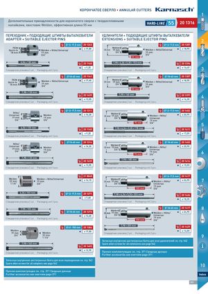 КОРОНЧАТОЕ СВЕРЛО • ANNULAR CUTTERS 1 Дополнительные принадлежности для корончатого сверла с твердосплавныминапайками, хвостовик Weldon, эффективная длина 55 мм HARD-L I N E 55 2200 11331166 ПЕРЕХОДНИК + ПОДХОДЯЩИЕ ШТИФТЫ ВЫТАЛКЕВАТЕЛИ УДЛИНИТЕЛИ + ПОДХОДЯЩИЕ ШТИФТЫ ВЫТАЛКЕВАТЕЛИ ADAPTER + SUITABLE EJECTOR PINS EXTENSIONS + SUITABLE EJECTOR PINS 2 12-17,5 mm 20 112263 12-17,5 mm 20 113387 FEINQuick-In Weldon + Nitto/Universal I € 17,50 Weldon35 mm19 mm Weldon + Nitto/Universal I € 18,95 18 mm 19 mm 3/4" 19 mm 3/4" 3/4" 50 mm 6,34 × 130 mm 20 111160 7,98 × 6,34 × 5,30 × 153 mm 20 113396 Стандартная упаковка 2 шт. ∙ Packaging unit 2 pcs. I € 9,20 Стандартная упаковка 2 шт. ∙ Packaging unit 2 pcs. I € 16,45 3 18-60 mm 20 111161 18-60 mm 20 113387 FEINQuick-In18 mm Weldon + Nitto/Universal I € 17,45 Weldon35 mm19 mm19 mm3/4"3/4" Weldon + Nitto/Universal I € 18,9519 mm3/4" 50 mm 7,98 × 130 mm 20 114439 7,98 × 160 mm 20 113399 4 I € 13,05 I € 14,30 Стандартная упаковка 2 шт. ∙ Packaging unit 2 pcs. Стандартная упаковка 2 шт. ∙ Packaging unit 2 pcs. 12-17,5 mm 20 113311 12-17,5 mm 20 114402 Nitto/Universal Weldon19 mm19 mm I € 16,30 Weldon35 mm19 mm3/4" Weldon + Nitto/ I € 20,95Universal 3/4" 3/4" 19 mm 75 mm 3/4" 5 6,34 × 130 mm 20 111160 7,98 × 6,34 × 5,30 × 178 mm 20 114411 I € 9,20 I € 17,05 Стандартная упаковка 2 шт. ∙ Packaging unit 2 pcs. Стандартная упаковка 2 шт. ∙ Packaging unit 2 pcs. 18-60 mm 20 113314 18-60 mm 20 114402 Nitto/Universal19 mm3/4" Weldon19 mm3/4" I € 16,30 Weldon35 mm19 mm Weldon + Nitto/ I € 20,953/4"Universal19 mm75 mm3/4"6 7,98 × 130 mm 20 114439 7,98 × 180 mm 20 114414 I € 13,05 I € 15,55 Стандартная упаковка 2 шт. ∙ Packaging unit 2 pcs. Стандартная упаковка 2 шт. ∙ Packaging unit 2 pcs. 21 000048 12-17,5 mm 20 114417 Weldon32 mm Weldon + Nitto/Universal19 mm I € 14,15 Weldon35 mm19mm Weldon + Nitto/ I € 24,95 7 1.1/4" 3/4" 3/4" Universal 19 mm100 mm3/4" MAC 6,34 × 102 mm 12-17,5 mm 20 112271 7,98 × 6,34 × 5,30 × 203 mm 20 114426 I € 7,65 I € 18,35 Стандартная упаковка 2 шт. ∙ Packaging unit 2 pcs. Стандартная упаковка 2 шт. ∙ Packaging unit 2 pcs. 7,98 × 105 mm 18-60 mm 20 112273 Weldon35 mm19mm 18-60 mm 20 114417 8Weldon + Nitto/I€ 24,95 I € 14,65 3/4" Universal Стандартная упаковка 2 шт. ∙ Packaging unit 2 pcs. 19 mm100 mm3/4" OIL 7,98 × 205 mm 61-150 mm20 113386 20 114429 Weldon19 mm Weldon I € 17,50 I € 16,00Стандартная упаковка 2 шт.∙Packaging unit 2 pcs. 3/4" 32 mm1.1/4" 9 Запасные внутренние шестигранные болты для всех удлинителей см. стр. 542 7,98 × 145 mm Spare allen screws for all extensions see page 542 20 114403 Стандартная упаковка 2 шт. ∙ Packaging unit 2 pcs. I € 12,95 Прочие комплектующие см. стр. 371 Сводные данные Further accessories see overview page 371 Запасные внутренние шестигранные болты для всех переходников см. стр. 542 Spare allen screws for all adapters see page 542 10 Прочие комплектующие см. стр. 371 Сводные данные Further accessories see overview page 371 Index 381 HINES