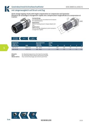Gewindeschneid-Schnellwechselfutter DIN 69893-6 (HSK-F) mit Längenausgleich auf Druck und Zug Quick change tapping chucks with length compensation on compression and expansion Mandrins de taraudage à changement rapide avec compensation longitudinale à la compression et traction Verwendung: Zur Aufnahme von Schnellwechsel-Einsätzen für Gewindebohrer. Application: For the chucking of quick change adaptors for taps. Application: Pour le serrage d‘adapteurs porte-tarauds à changement rapide. ISO 12164(DIN 69893) HSK - F G2,525.000 min-1 Bestell-Nr. Spannbereich Größe Order no. Capacity Size Référence HSK Capacité Taille A D d C T 5 F63.16.12 HSK-F 63 M3 – M14 1 102 36 19 7 7 F63.16.20 HSK-F 63 M5 – M22 2 140 53 31 12 12 Hinweis: Für Bearbeitungszentren ohne Synchronspindel. Note: For machining centres without synchronous spindle. Observation: Pour centres d‘usinage sans broche synchrone. 10.30 10.31 10.36 5.85 2020