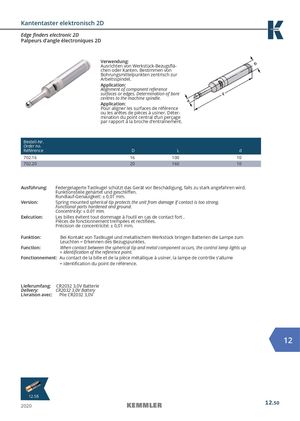 Kantentaster elektronisch 2D Edge finders electronic 2D Palpeurs d’angle électroniques 2D Verwendung: Ausrichten von Werkstück-Bezugsflä- chen oder Kanten. Bestimmen von Bohrungsmittelpunkten zentrisch zur Arbeitsspindel. Application: Alignment of component reference surfaces or edges. Determination of bore centres to the machine spindle. Application: Pour aligner les surfaces de référence ou les arêtes de pièces à usiner. Déter- mination du point central d‘un perçage par rapport à la broche d‘entraînement. Bestell-Nr. Order no. Référence D L d 702.16 16 100 10 702.20 20 160 10 Ausführung: Federgelagerte Tastkugel schützt das Gerät vor Beschädigung, falls zu stark angefahren wird. Funktionsteile gehärtet und geschliffen. Rundlauf-Genauigkeit: ± 0,01 mm. Version: Spring mounted spherical tip protects the unit from damage if contact is too strong. Functional parts hardened and ground. Concentricity: ± 0.01 mm. Exécution: Les billes évitent tout dommage à l‘outil en cas de contact fort . Pièces de fonctionnement trempées et rectifiées. Précision de concentricité: ± 0,01 mm. Funktion: Bei Kontakt von Tastkugel und metallischem Werkstück bringen Batterien die Lampe zum Leuchten = Erkennen des Bezugspunktes. Function: When contact between the spherical tip and metal component occurs, the control lamp lights up = identification of the reference point. Fonctionnement: Au contact de la bille et de la pièce métallique à usiner, la lampe de contrôle s‘allume = identification du point de référence. Lieferumfang: CR2032 3,0V Batterie Delivery: CR2032 3,0V Battery Livraison avec: Pile CR2032 3,0V 12 129.258 2020 12.50