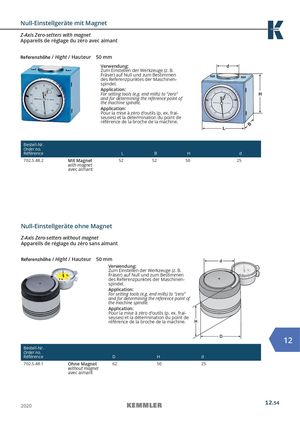 Null-Einstellgeräte mit Magnet Z-Axis Zero-setters with magnet Appareils de réglage du zéro avec aimant Referenzhöhe / Hight / Hauteur 50 mm Verwendung: Zum Einstellen der Werkzeuge (z. B. Fräser) auf Null und zum Bestimmen des Referenzpunktes der Maschinen- spindel. Application: For setting tools (e.g. end mills) to “zero” and for determining the reference point of the machine spindle. Application: Pour la mise à zéro d‘outils (p. ex. frai- seuses) et la détermination du point de référence de la broche de la machine. Bestell-Nr. Order no. Référence L B H d 702.5.48.2 Mit Magnet 52 52 50 25 with magnet avec aimant Null-Einstellgeräte ohne Magnet Z-Axis Zero-setters without magnet Appareils de réglage du zéro sans aimant Referenzhöhe / Hight / Hauteur 50 mm Verwendung: Zum Einstellen der Werkzeuge (z. B. Fräser) auf Null und zum Bestimmen des Referenzpunktes der Maschinen- spindel. Application: For setting tools (e.g. end mills) to “zero” and for determining the reference point of the machine spindle. Application: Pour la mise à zéro d‘outils (p. ex. frai- seuses) et la détermination du point de référence de la broche de la machine. 12 Bestell-Nr. Order no. Référence D H d 702.5.48.1 Ohne Magnet 62 50 25 without magnet avec aimant 2020 12.54