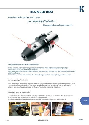 KEMMLER OEM Laserbeschriftung der Werkzeuge Laser engraving of toolholders Marquage laser de porte-outils Laserbeschriftung von Werkzeugaufnahmen Durch unsere Laserbeschriftungsanlagen können wir Ihnen individuelle, kostengünstige Laserbeschriftung der Werkzeuge anbieten. Die dauerhafte Beschriftung kann mit Ihrem Firmennamen, Firmenlogo oder mit sonstigen Sonder- zeichen erfolgen. Ebenfalls können die Etiketten auf den Verpackungen nach Ihren Vorgaben gestaltet werden. Laser engraving of toolholders With our newly acquired laser engravers we can offer you individual and cost-effective engraving of tools. The permanent engraving can include your company’s name, logo or any other special description. Also the labels on the packaging can be designed according to your specifications. Marquage laser de porte-outils A l’aide de notre dispositif de marquage laser nous sommes en mesure de labelliser vos porte-outils avec votre nom, logo ou autres données. En outre, les étiquettes peuvent être conçues sur l‘emballage selon vos spécifications. 12 2020 12.56