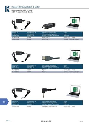 Datenverbindungskabel - 2 Meter Data connection cable - 2 meter Câble de raccordement - 2 mètre Bestell-Nr. Schnittstelle PC Schnittstelle Messmittel Daten Order no. Interface PC Interface measuring device Data Références Interface PC Interface appareil de mesure Données M.900.05.4 USB-A Micro-USB-B Punkt | Dot | Point M.900.05.5 USB-A Micro-USB-B Komma | Comma | Virgule Bestell-Nr. Schnittstelle PC Schnittstelle Messmittel Daten Order no. Interface PC Interface measuring device Data Références Interface PC Interface appareil de mesure Données M.900.07.0 USB-A Typ D1 Punkt | Dot | Point M.900.07.1 USB-A Typ D1 Komma | Comma | Virgule 12 Bestell-Nr.Order no. Schnittstelle PC Schnittstelle Messmittel DatenInterface PCInterface measuring deviceData Références Interface PC Interface appareil de mesure Données M.900.10.0 USB-A EIA RS-453 / IEC 60603-11 Punkt | Dot | Point 12.57 2020