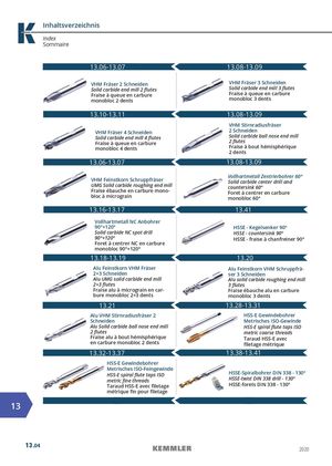 Inhaltsverzeichnis Index Sommaire 13.06-13.07 13.08-13.09 VHM Fräser 2 Schneiden VHM Fräser 3 Schneiden Solid carbide end mill 2 flutes Solid carbide end mill 3 flutes Fraise à queue en carbure Fraise à queue en carbure monobloc 2 dents monobloc 3 dents 13.10-13.11 13.08-13.09 VHM Stirnradiusfräser VHM Fräser 4 SchneidenSolid carbide end mill 4 flutesFraise à queue en carbure2 SchneidenSolid carbide ball nose end mill2 flutes monobloc 4 dents Fraise à bout hémisphérique2 dents 13.06-13.07 13.08-13.09 VHM Feinstkorn SchruppfräserUMG Solid carbide roughing end millFraise ébauche en carbure mono-bloc à micrograinVollhartmetall Zentrierbohrer 60°Solid carbide center drill andcountersink 60°Foret à centrer en carburemonobloc 60° 13.16-13.17 13.41 Vollhartmetall NC Anbohrer 90°+120° HSSE - Kegelsenker 90° Solid carbide NC spot drill HSSE - countersink 90° 90°+120° HSSE - fraise à chanfreiner 90° Foret à centrer NC en carbure monobloc 90°+120° 13.18-13.19 13.20 Alu Feinstkorn VHM Fräser Alu Feinstkorn VHM Schruppfrä- 2+3 Schneiden ser 3 Schneiden Alu UMG solid carbide end mill Alu solid carbide roughing end mill 2+3 flutes 3 flutes Fraise alu à micrograin en car- Fraise ébauche alu en carbure bure monobloc 2+3 dents monobloc 3 dents 13.21 13.28-13.31 Alu VHM Stirnradiusfräser 2 HSS-E Gewindebohrer Schneiden Metrisches ISO-Gewinde Alu Solid carbide ball nose end mill HSS-E spiral flute taps ISO 2 flutes metric coarse threads Fraise alu à bout hémisphérique Taraud HSS-E avec en carbure monobloc 2 dents filetage métrique 13.32-13.37 13.38-13.41 HSS-E Gewindebohrer Metrisches ISO-Feingewinde HSS-E spiral flute taps ISO HSSE-Spiralbohrer DIN 338 - 130° metric fine threads HSSE-twist DIN 338 drill - 130° Taraud HSS-E avec filetage HSSE-forets DIN 338 - 130° métrique fin pour filetage 13 13.04 2020
