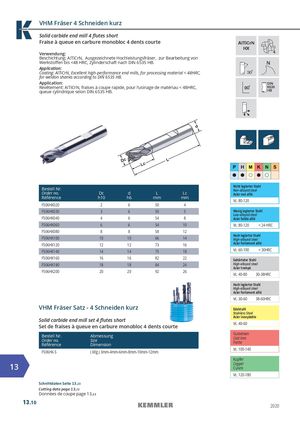 VHM Fräser 4 Schneiden kurz Solid carbide end mill 4 flutes short Fraise à queue en carbure monobloc 4 dents courte AlTiCrN Verwendung: HX 4 Beschichtung: AlTiCrN, Ausgezeichnete Hochleistungsfräser, zur Bearbeitung von Werkstoffen bis <48 HRC, Zylinderschaft nach DIN 6535 HB. Application: Coating: AlTiCrN, Excellent high-performance end mills, for processing material < 48HRC, 30 for weldon shanks according to DIN 6535 HB. Application: Revêtement: AlTiCrN, fraises à coupe rapide, pour l‘usinage de matériau < 48HRC, queue cylindrique selon DIN 6535 HB. Bestell Nr. Nicht legierter StahlNon-alloyed steel Order no. Dc d L Lc Acier non allié Référence h10 h6 mm mm Vc. 80-120 F506HX020 2 6 50 4 F506HX030 3 6 50 5 Wenig legierter Stahl Low-alloyed steel F506HX040 4 6 54 8 Acier faible allié F506HX060 6 6 54 10 Vc. 80-120 < 24 HRC F506HX080 8 8 58 12 Hoch legierter Stahl F506HX100 10 10 66 14 High-alloyed steel F506HX120 12 12 73 16 Acier fortement allié F506HX140 14 14 75 18 Vc. 60-100 < 30HRC F506HX160 16 16 82 22 Gehärteter Stahl F506HX180 18 18 84 24 High-alloyed steelAcier trempé F506HX200 20 20 92 26 Vc. 40-80 30-38HRC Hoch legierter Stahl High-alloyed steel Acier fortement allié Vc. 30-60 38-60HRC 0,1 VHM Fräser Satz - 4 Schneiden kurz Edelstahl Stainless Steel Acier inoxydable Solid carbide end mill set 4 flutes shortSet de fraises à queue en carbure monobloc 4 dents courte Vc. 40-60 Bestell Nr. AbmessungOrder no.SizeRéférenceDimension GusseisenCast IronFonte F506HX-S ( 6tlg.) 3mm-4mm-6mm-8mm-10mm-12mm Vc. 100-140 0,1 Kupfer 13 CopperCuivre Vc. 120-180 Schnittdaten Seite 13.23 Cutting data page 13.23 Données de coupe page 13.23 13.10 2020
