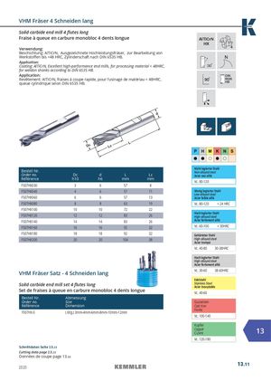 VHM Fräser 4 Schneiden lang Solid carbide end mill 4 flutes long Fraise à queue en carbure monobloc 4 dents longue AlTiCrN Verwendung: HX 4 Beschichtung: AlTiCrN, Ausgezeichnete Hochleistungsfräser, zur Bearbeitung von Werkstoffen bis <48 HRC, Zylinderschaft nach DIN 6535 HB. Application: Coating: AlTiCrN, Excellent high-performance end mills, for processing material < 48HRC, 30 for weldon shanks according to DIN 6535 HB. Application: Revêtement: AlTiCrN, fraises à coupe rapide, pour l‘usinage de matériau < 48HRC, queue cylindrique selon DIN 6535 HB. Bestell Nr. Nicht legierter StahlNon-alloyed steel Order no. Dc d L Lc Acier non allié Référence h10 h6 mm mm Vc. 80-120 F507HX030 3 6 57 8 F507HX040 4 6 57 11 Wenig legierter Stahl Low-alloyed steel F507HX060 6 6 57 13 Acier faible allié F507HX080 8 8 63 19 Vc. 80-120 < 24 HRC F507HX100 10 10 72 22 Hoch legierter Stahl F507HX120 12 12 83 26 High-alloyed steel F507HX140 14 14 83 26 Acier fortement allié F507HX160 16 16 92 32 Vc. 60-100 < 30HRC F507HX180 18 18 92 32 Gehärteter Stahl F507HX200 20 20 104 38 High-alloyed steelAcier trempé Vc. 40-80 30-38HRC Hoch legierter Stahl High-alloyed steel Acier fortement allié VHM Fräser Satz - 4 Schneiden lang Vc. 30-60 38-60HRC 0,1 Edelstahl Solid carbide end mill set 4 flutes long Stainless SteelAcier inoxydable Set de fraises à queue en carbure monobloc 4 dents longue Vc. 40-60 Bestell Nr. Abmessung Order no. Size Gusseisen Référence Dimension Cast Iron F507HX-S ( 6tlg.) 3mm-4mm-6mm-8mm-10mm-12mm Fonte Vc. 100-140 0,1 Kupfer CopperCuivre 13 Vc. 120-180 Schnittdaten Seite 13.23 Cutting data page 13.23 Données de coupe page 13.23 13.11 2020