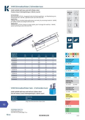 VHM Stirnradiusfräser 2 Schneiden kurz Solid carbide ball nose end mill 2 flutes short Fraise à bout hémisphérique 2 dents courte AlTiCrN HX Verwendung: Beschichtung: AlTiCrN, Ausgezeichnete Hochleistungsfräser, zur Bearbeitung von Werkstoffen bis <48 HRC, Zylinderschaft nach DIN 6535 HB. Application: Coating: AlTiCrN, Excellent high-performance end mills, for processing material < 48HRC, 30 for weldon shanks according to DIN 6535 HB. Application: Revêtement: AlTiCrN, fraises à coupe rapide, pour l‘usinage de matériau < 48HRC, queue cylindrique selon DIN 6535 HB. Bestell Nr. Order no. Dc d R L Lc Référence h10 h6 ±0,01 mm mm F520HX020 2 6 R1,0 50 3 Nicht legierter Stahl F520HX030 3 6 R1,5 50 4 Non-alloyed steel F520HX040 4 6 R2,0 54 5 Acier non allié F520HX050 5 6 R2,5 54 6 Vc. 100-140 F520HX060 6 6 R3,0 54 7 Wenig legierter Stahl F520HX080 8 8 R4,0 58 9 Low-alloyed steelAcier faible allié F520HX100 10 10 R5,0 66 11 Vc. 100-140 < 24 HRC F520HX120 12 12 R6,0 73 12 F520HX140 14 14 R7,0 75 14 Hoch legierter Stahl High-alloyed steel F520HX160 16 16 R8,0 82 16 Acier fortement allié F520HX180 18 18 R9,0 84 18 Vc. 80-120 < 30HRC F520HX200 20 20 R10,0 92 20 Gehärteter Stahl High-alloyed steel Acier trempé Vc. 70-100 30-38HRC VHM Stirnradiusfräser Satz - 2 Schneiden kurz Hoch legierter StahlHigh-alloyed steel Acier fortement allié Solid carbide ball nose end mill set 2 flutes short Vc. 50-80 38-60HRC Set de fraises à bout hémisphérique 2 dents court 0,1 Edelstahl Stainless Steel Bestell Nr. Abmessung Acier inoxydable Order no. SizeRéférenceDimension Vc. 60-90 F520HX-S ( 6tlg.) 3mm-4mm-6mm-8mm-10mm-12mm Gusseisen Cast Iron 13 Fonte Vc. 120-160 0,1 Schnittdaten Seite 13.24 KupferCopper Cutting data page 13.24 Cuivre Données de coupe page 13.24 13.12 Vc. 140-200 2020