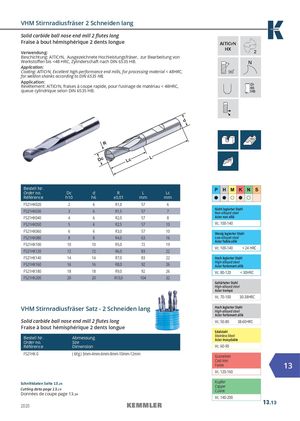 VHM Stirnradiusfräser 2 Schneiden lang Solid carbide ball nose end mill 2 flutes long Fraise à bout hémisphérique 2 dents longue AlTiCrN HX Verwendung: Beschichtung: AlTiCrN, Ausgezeichnete Hochleistungsfräser, zur Bearbeitung von Werkstoffen bis <48 HRC, Zylinderschaft nach DIN 6535 HB. Application: Coating: AlTiCrN, Excellent high-performance end mills, for processing material < 48HRC, 30 for weldon shanks according to DIN 6535 HB. Application: Revêtement: AlTiCrN, fraises à coupe rapide, pour l‘usinage de matériau < 48HRC, queue cylindrique selon DIN 6535 HB. Bestell Nr. Order no. Dc d R L Lc Référence h10 h6 ±0,01 mm mm F521HX020 2 6 R1,0 57 6 F521HX030 3 6 R1,5 57 7 Nicht legierter StahlNon-alloyed steel F521HX040 4 6 R2,0 57 8 Acier non allié F521HX050 5 6 R2,5 57 10 Vc. 100-140 F521HX060 6 6 R3,0 57 10 Wenig legierter Stahl F521HX080 8 8 R4,0 63 16 Low-alloyed steel Acier faible allié F521HX100 10 10 R5,0 72 19 Vc. 100-140 < 24 HRC F521HX120 12 12 R6,0 83 22 F521HX140 14 14 R7,0 83 22 Hoch legierter Stahl F521HX160 16 16 R8,0 92 26 High-alloyed steelAcier fortement allié F521HX180 18 18 R9,0 92 26 Vc. 80-120 < 30HRC F521HX200 20 20 R10,0 104 32 Gehärteter Stahl High-alloyed steel Acier trempé Vc. 70-100 30-38HRC VHM Stirnradiusfräser Satz - 2 Schneiden lang Hoch legierter StahlHigh-alloyed steel Acier fortement allié Solid carbide ball nose end mill 2 flutes long Vc. 50-80 38-60HRC Fraise à bout hémisphérique 2 dents longue 0,1 Edelstahl Bestell Nr. AbmessungOrder no.Size Stainless SteelAcier inoxydable Référence Dimension Vc. 60-90 F521HX-S ( 6tlg.) 3mm-4mm-6mm-8mm-10mm-12mm Gusseisen Cast Iron Fonte 13 Vc. 120-160 0,1 Schnittdaten Seite 13.24Cutting data page 13.24 KupferCopperCuivre Données de coupe page 13.24 Vc. 140-200 13.13 2020